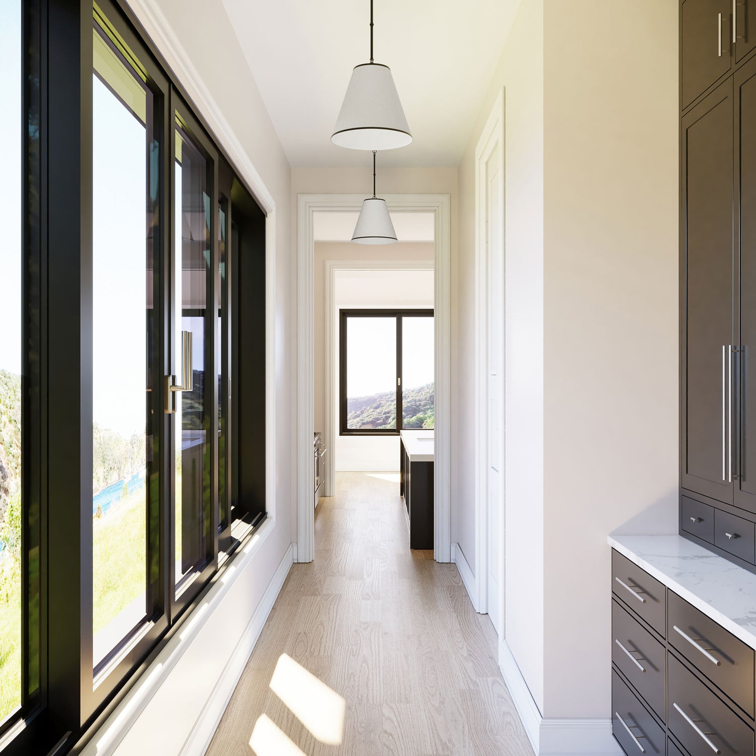 • Finished in stunning matte black, the pendant is suspended from a circular canopy and adjustable matching down rods