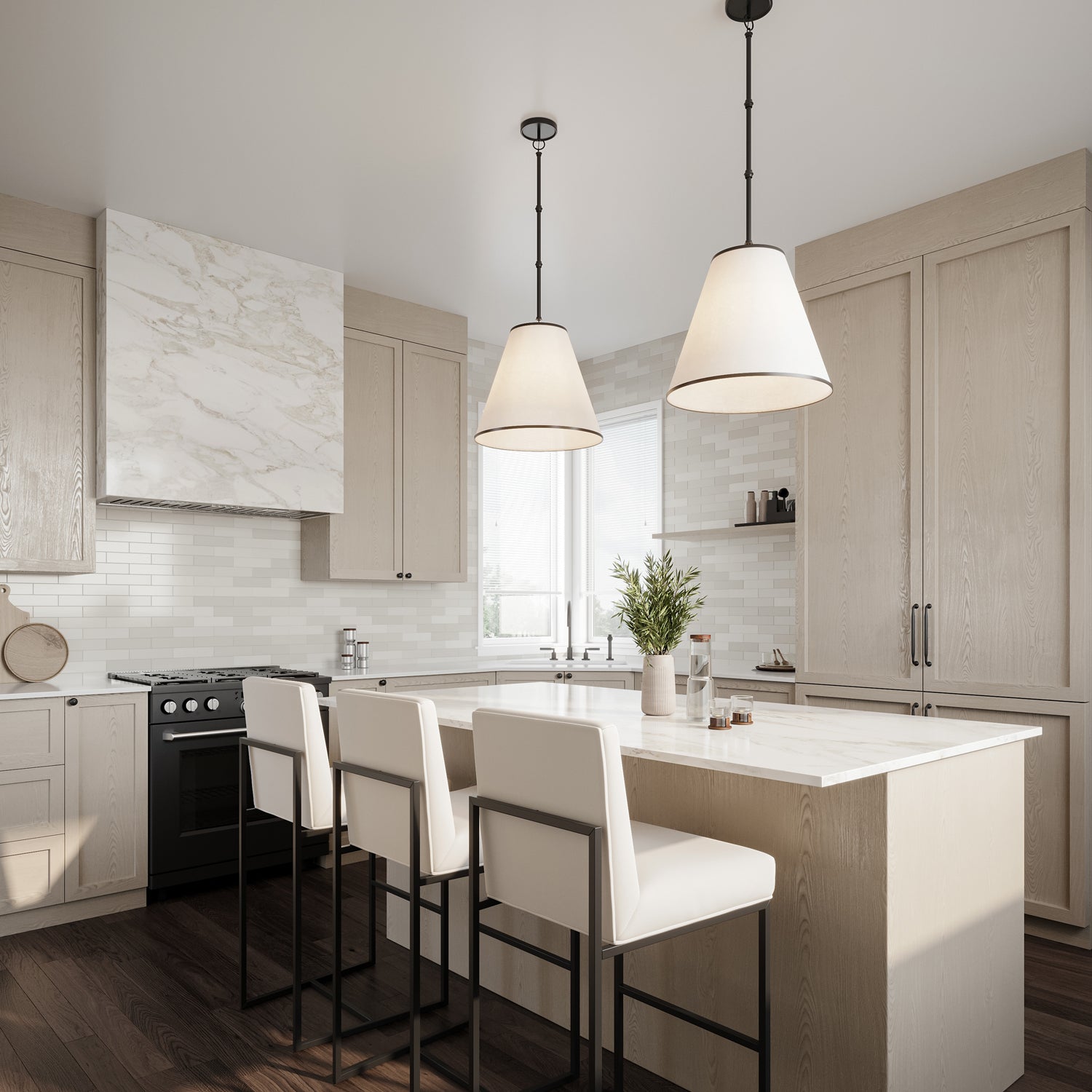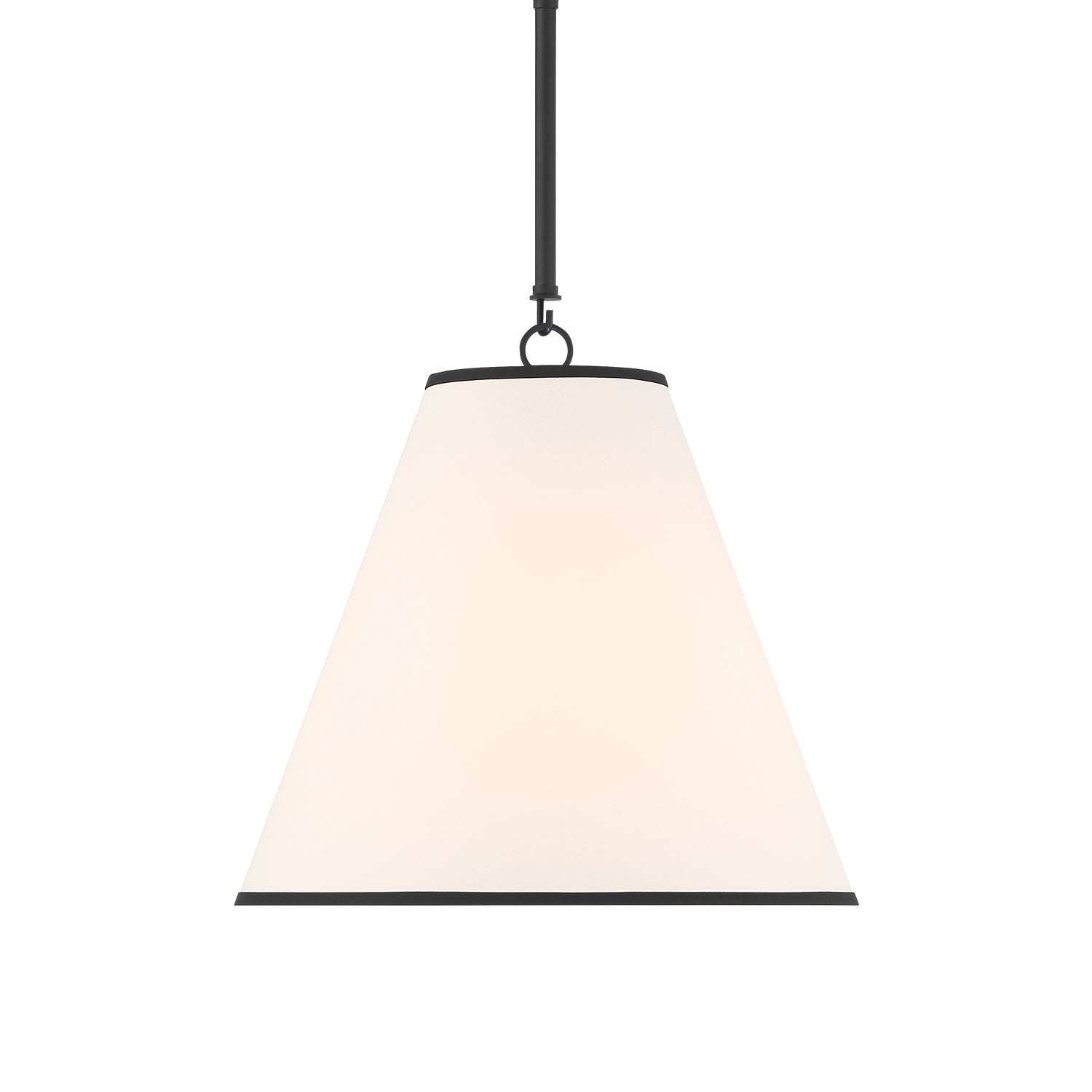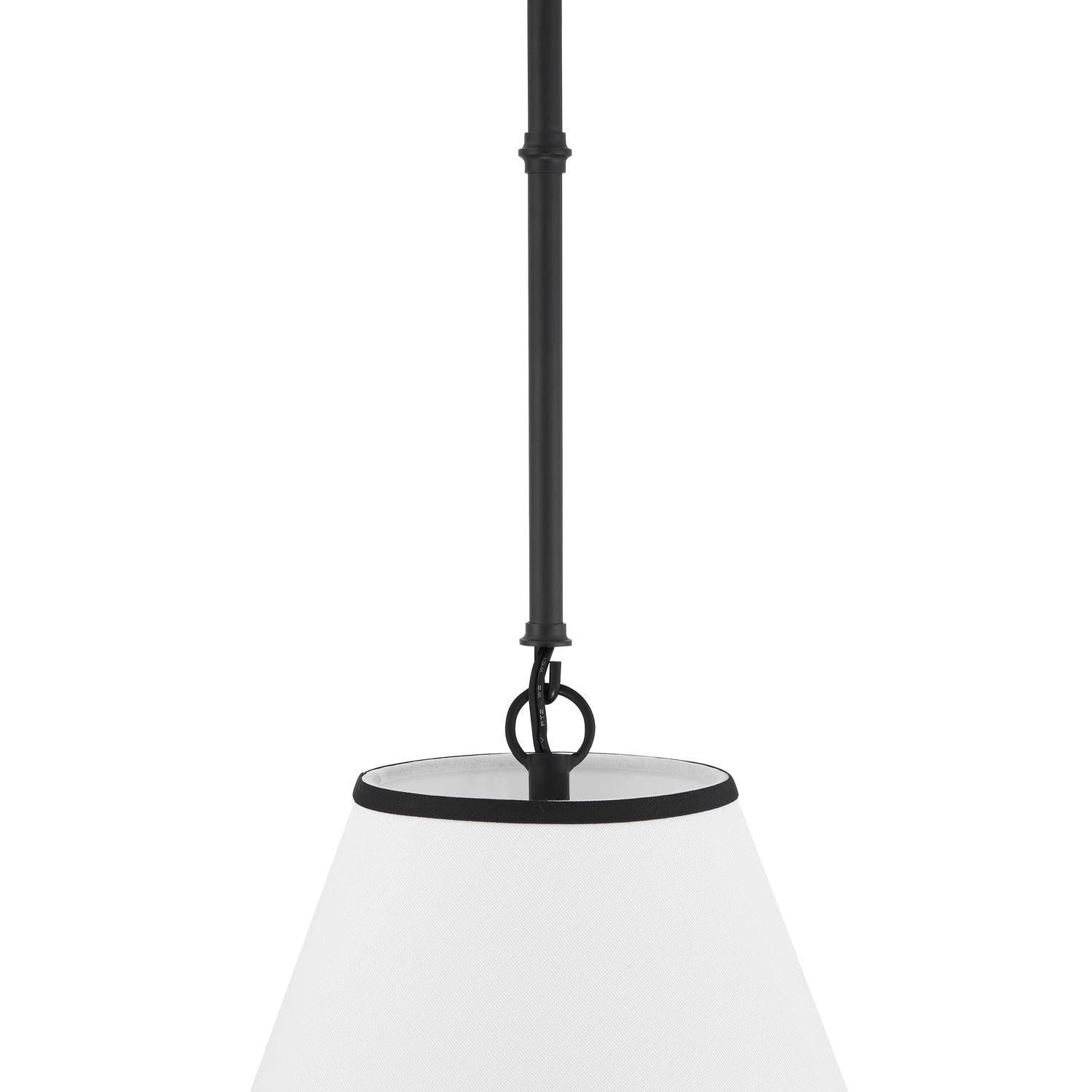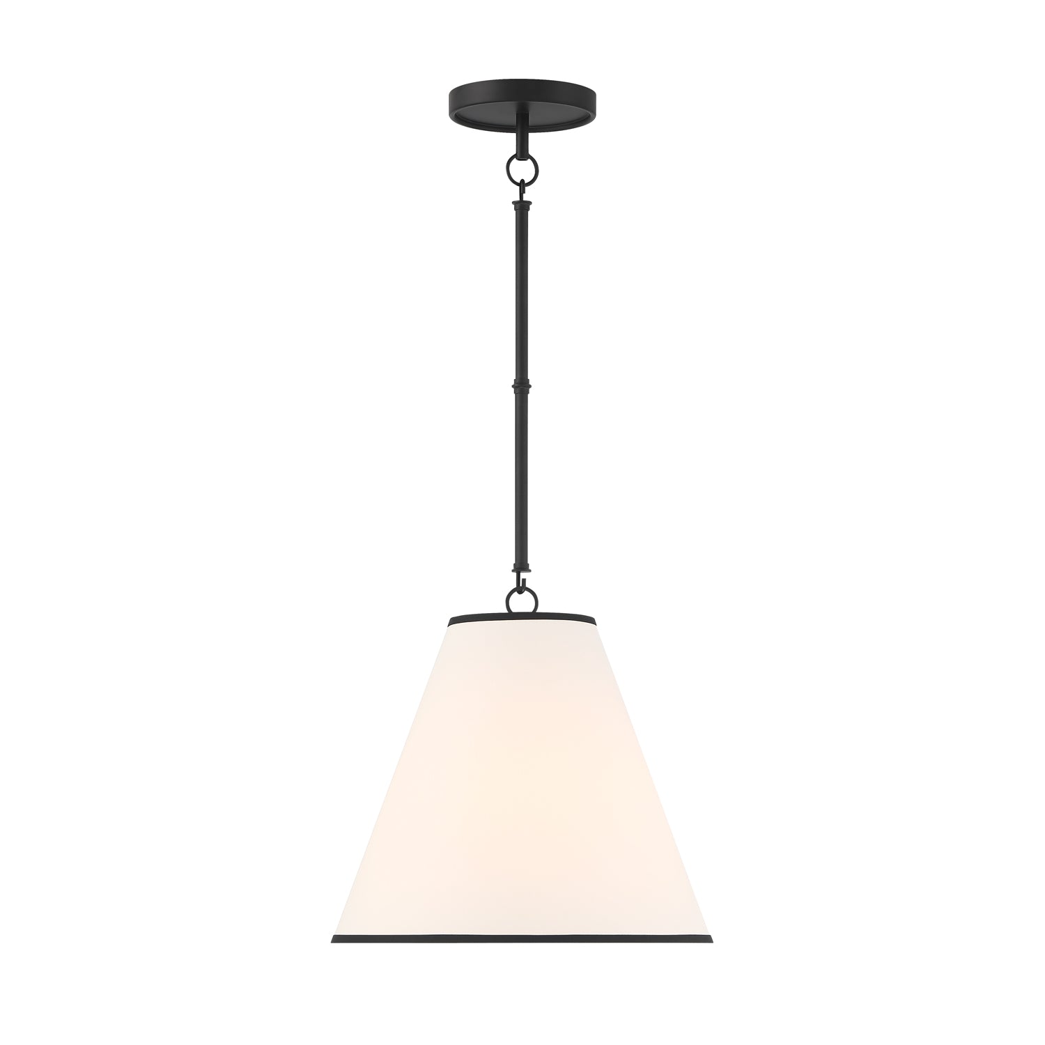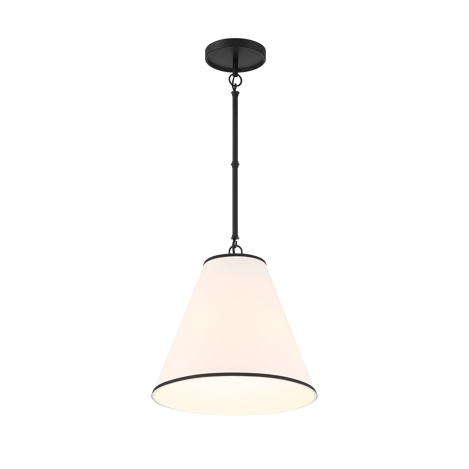 The Luca Small 13" Conical Pendant is comprised of a stunning matte black metal body paired with a dramatic, tapered white fabric shade with black detailing, which measures 13" in diameter and 11" tall. While boasting a classic tapered drum pendant silhouette, the Luca provides updated, smart details- perfectly executed contrast with black trim at the edges of the shade, and adjustable hanging height by way of six-inch rods and decorative couplers. With a traditional shape and modern finishes and textures, this pendant works well in transitional, traditional, or modern spaces. The gorgeous fabric shade is optimal for overhead lighting, helping to diffuse and soften the light from any bulb. The Luca series of fabric pendant lights are perfect in sets above dining room tables, kitchen islands or as a single light in a bedroom, entryway, or kitchenette.