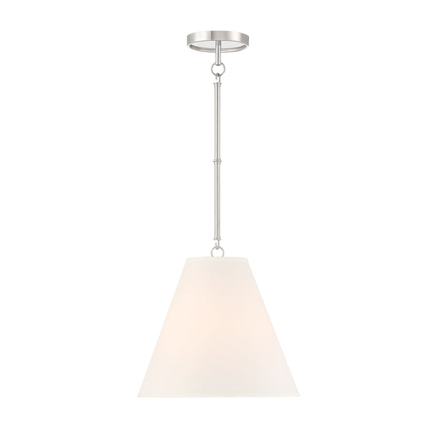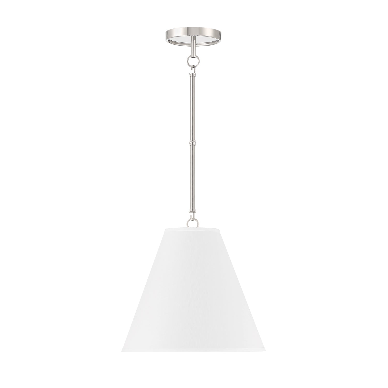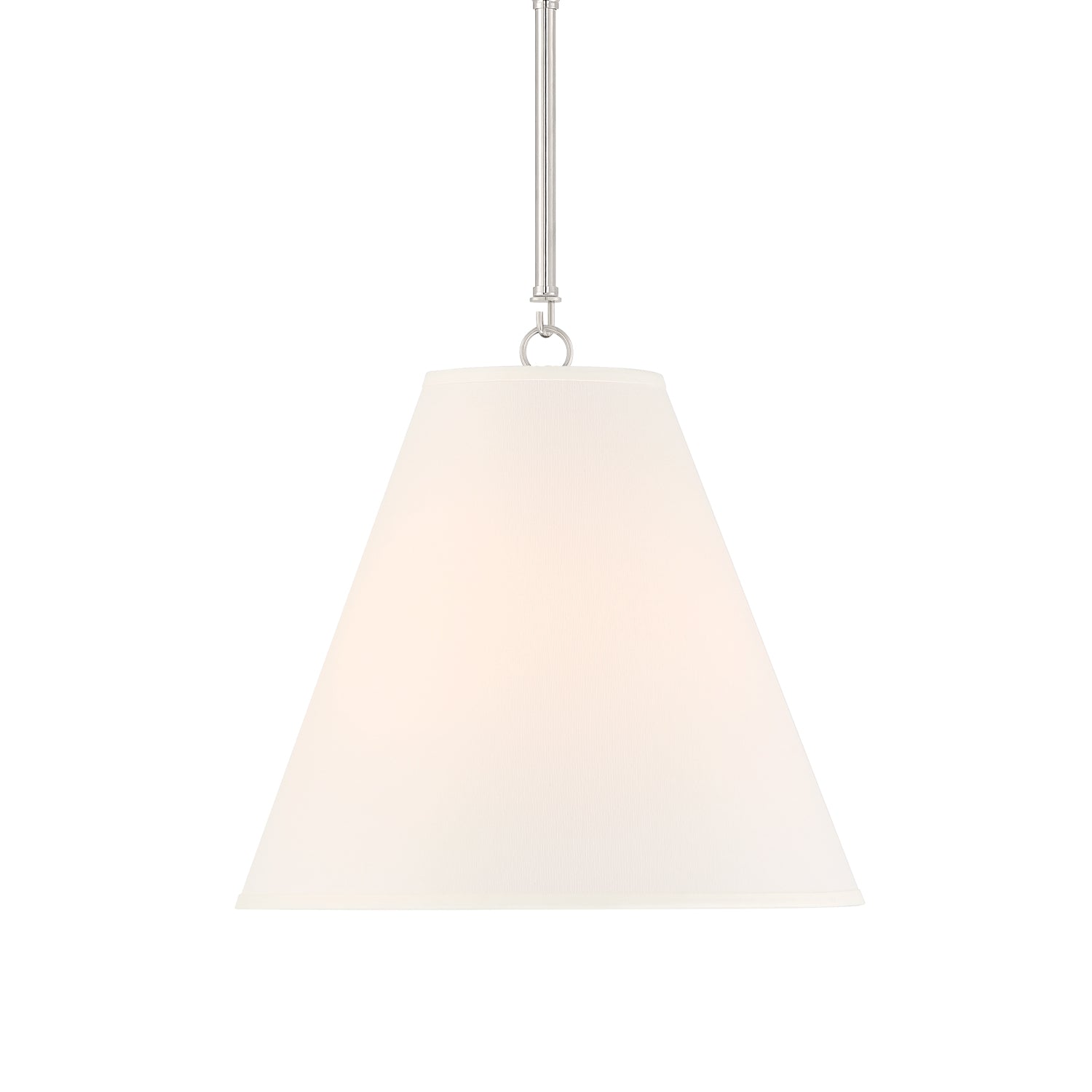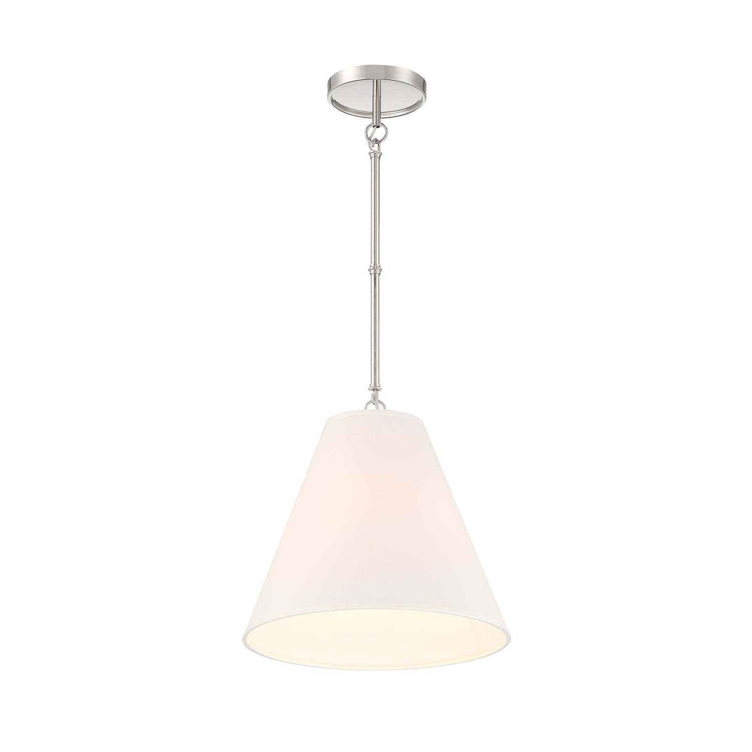 • One classic single-bulb pendant light furnished with a complementary 13" white fabric shade tapering to a conical shape