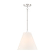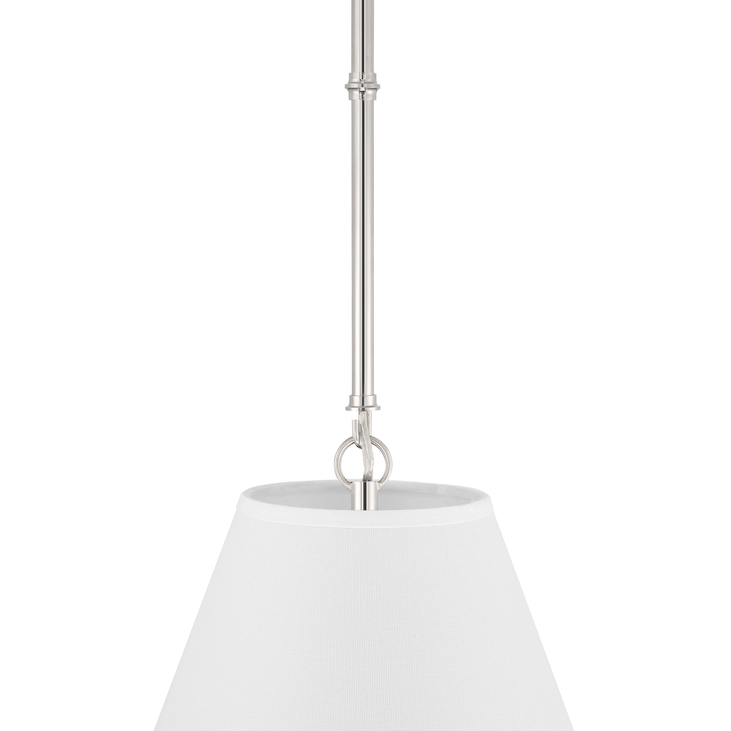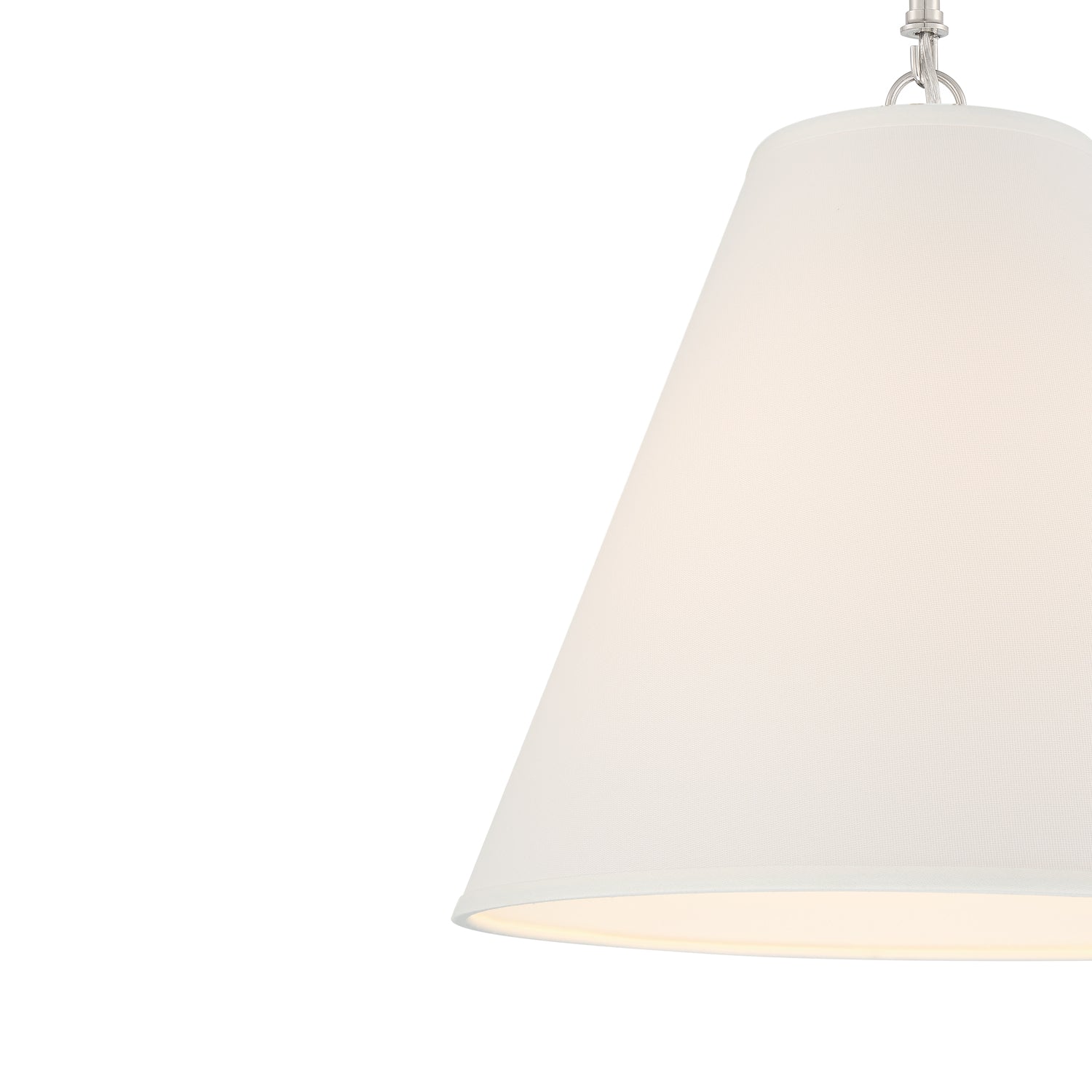 The Luca Small 13" Conical Pendant is comprised of a gleaming polished nickel metal body paired with a dramatic, tapered fabric shade, which measures 13" in diameter and 11" tall. While boasting a classic tapered drum pendant silhouette, the Luca provides updated, smart details- perfectly executed complementary white fabric shade, and adjustable hanging height by way of six-inch rods and decorative couplers. With a traditional shape and modern finishes and textures, this pendant works well in transitional, traditional, or modern spaces. The gorgeous fabric shade is optimal for overhead lighting, helping to diffuse and soften the light from any bulb. The Luca series of fabric pendant lights are perfect in sets above dining room tables, kitchen islands or as a single light in a bedroom, entryway, or kitchenette.