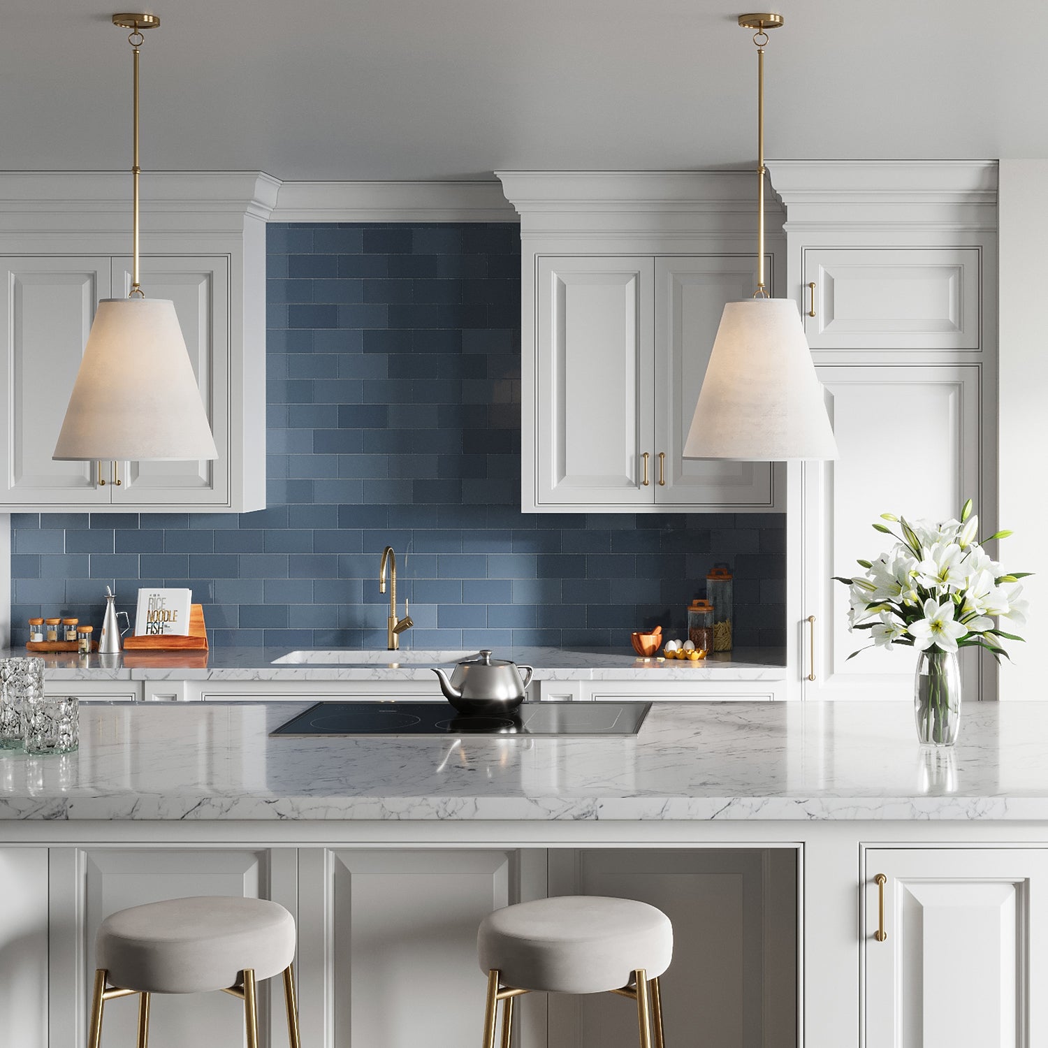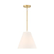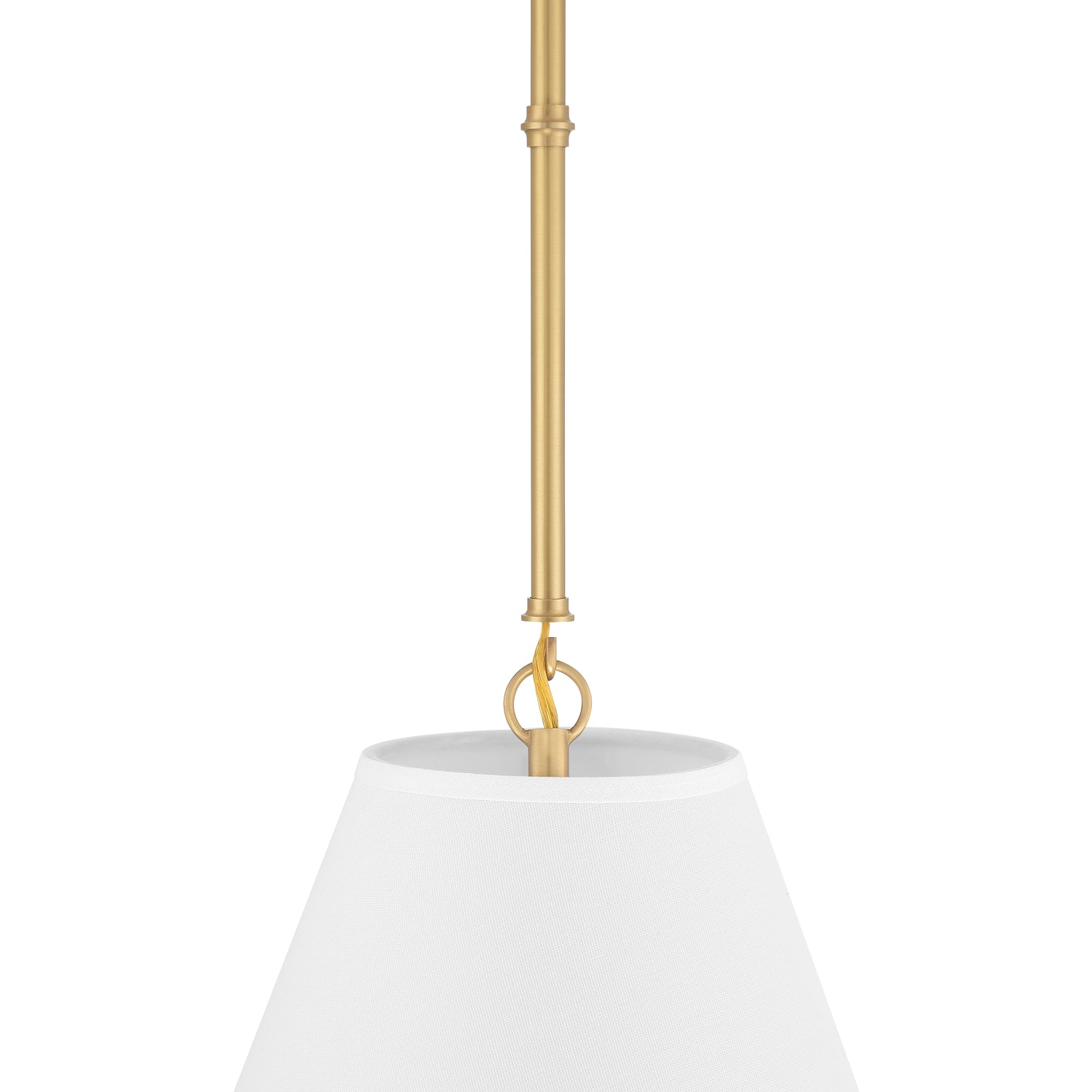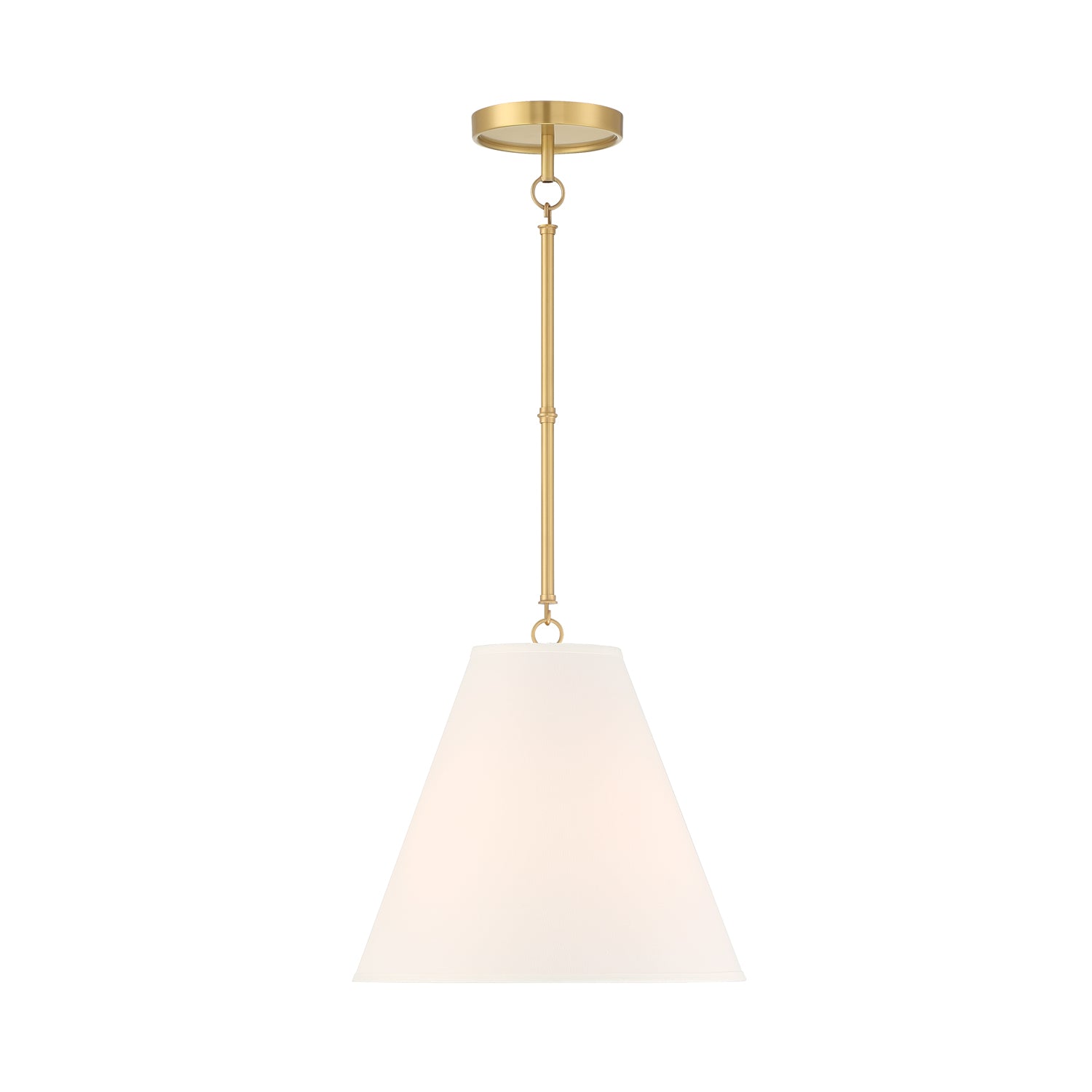 The Luca Small 13" Conical Pendant is comprised of a gleaming satin brass metal body paired with a dramatic, tapered white fabric shade, which measures 13" in diameter and 11" tall.. While boasting a classic tapered drum pendant silhouette, the Luca provides updated, smart details- a perfectly executed complementary white shade and adjustable hanging height by way of six-inch rods and decorative couplers. With a traditional shape and modern finishes and textures, this pendant works well in transitional, traditional, or modern spaces. The gorgeous fabric shade is optimal for overhead lighting, helping to diffuse and soften the light from any bulb. The Luca series of fabric pendant lights are perfect in sets above dining room tables, kitchen islands or as a single light in a bedroom, entryway, or kitchenette.