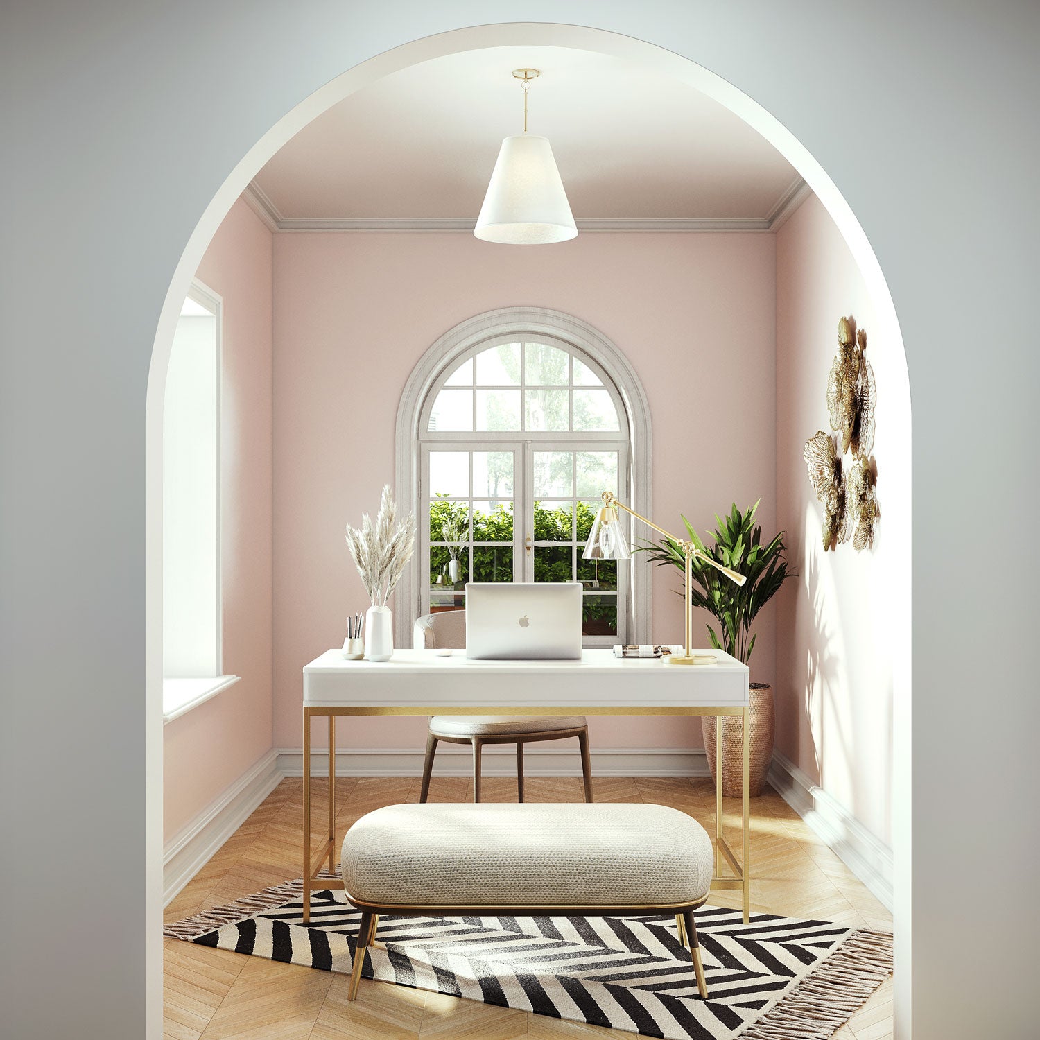 • Finished in warm satin brass, the pendant is suspended from a circular canopy and adjustable matching down rods