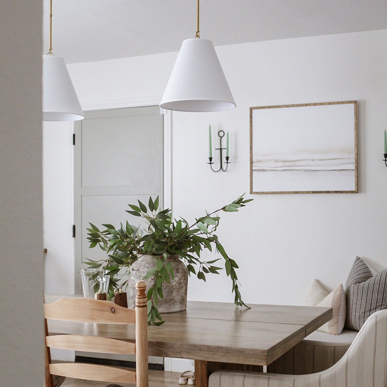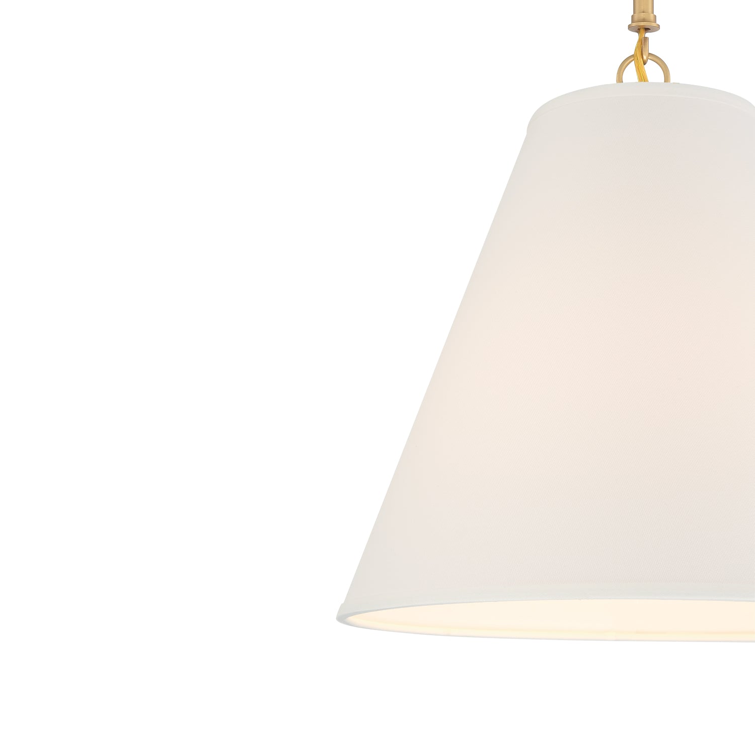 • One classic single-bulb pendant light furnished with a complementing 13" white fabric shade tapering to a conical shape