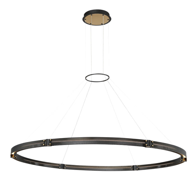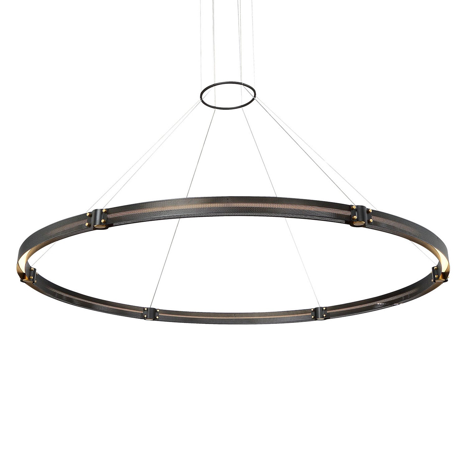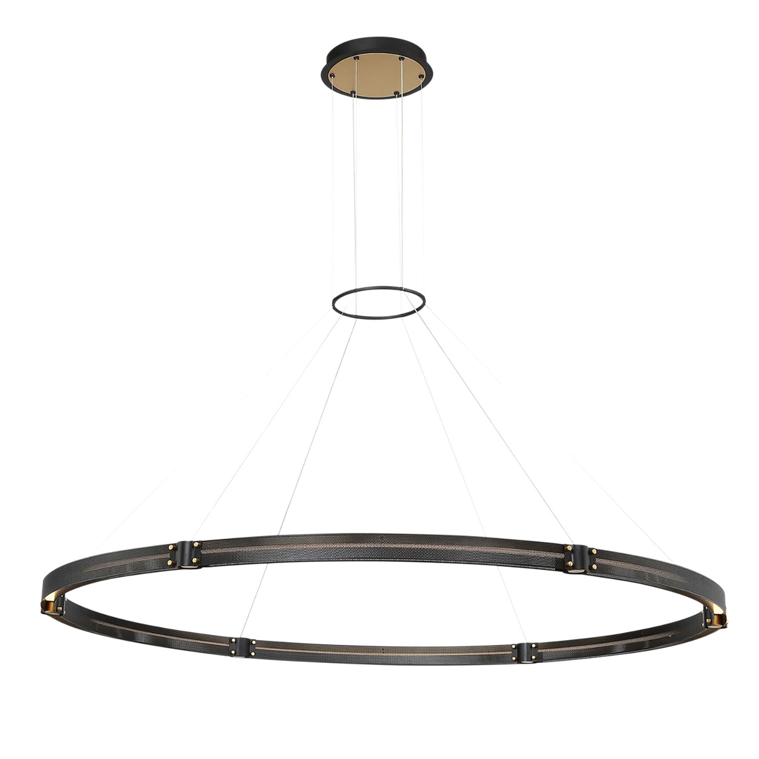 The Lune LED Pendant brings bold sophistication to any space with its commanding ring design and striking brass and black finish. This statement fixture features a sleek black circular frame with brass accents, creating brilliant ambient illumination that transforms large dining rooms and living areas into dramatic showcases. The integrated LED technology follows the contour of the ring, delivering a refined glow through the intricate filigreed metalwork, while the two-toned finish adds industrial elegance to any interior. The brass and black elements deliver contemporary luxury with commanding presence. At 62" in diameter with its distinctive floating form, this pendant makes an unforgettable centerpiece that brings modern drama to any space.