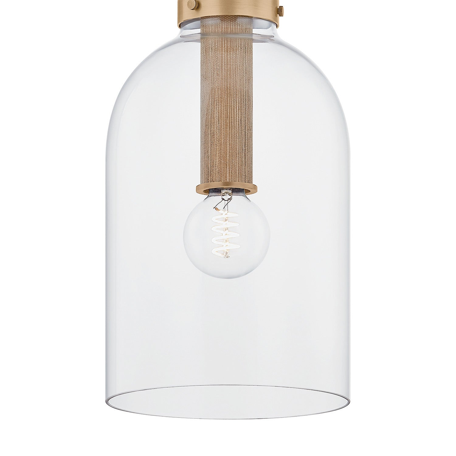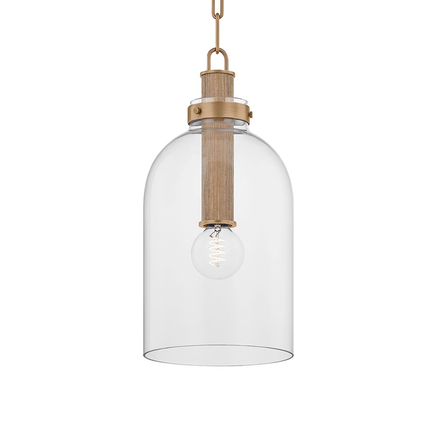 The Midori Small Pendant 9" redefines the traditional glass lantern as a captivating sculptural piece, defined by its tall, clear glass shade and rich textural details. This imaginative design features a unique grasscloth-wrapped socket visible through the glass, providing an organic contrast to the polished Patina Brass hardware. The result is a gentle, sophisticated wash of light that transforms the atmosphere of the room, making it a delicate statement piece for kitchen islands, cozy breakfast nooks, or transitional hallways.