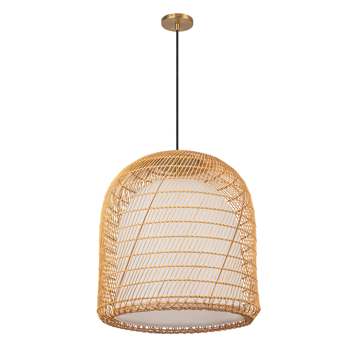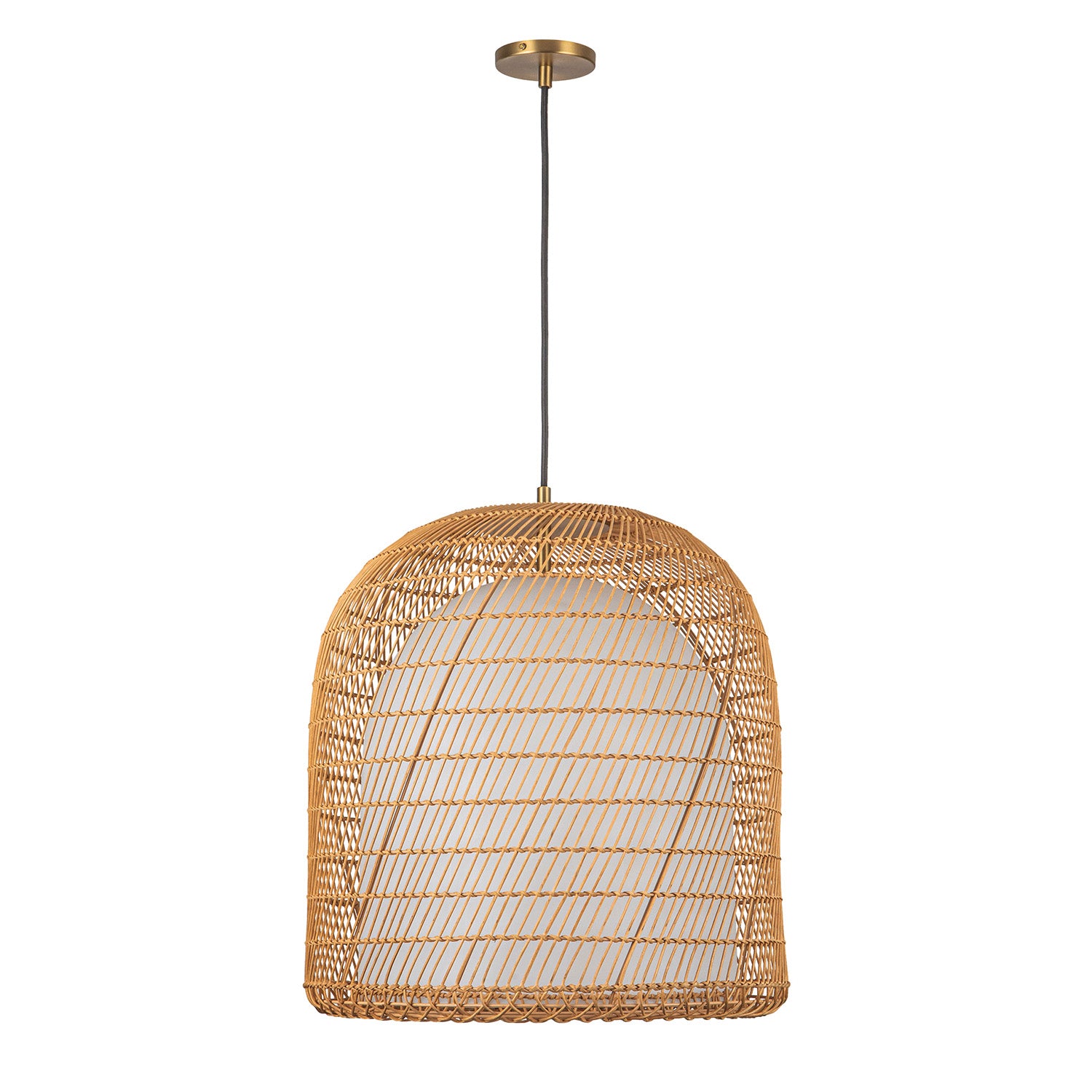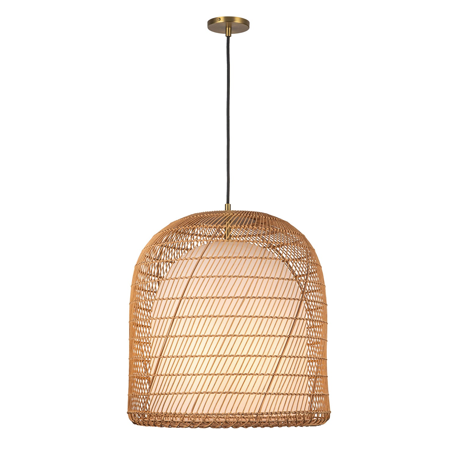 • Coastal-inspired dome pendant with handwoven rattan and opal glass creating enchanting patterns that mimic shifting sands and waves