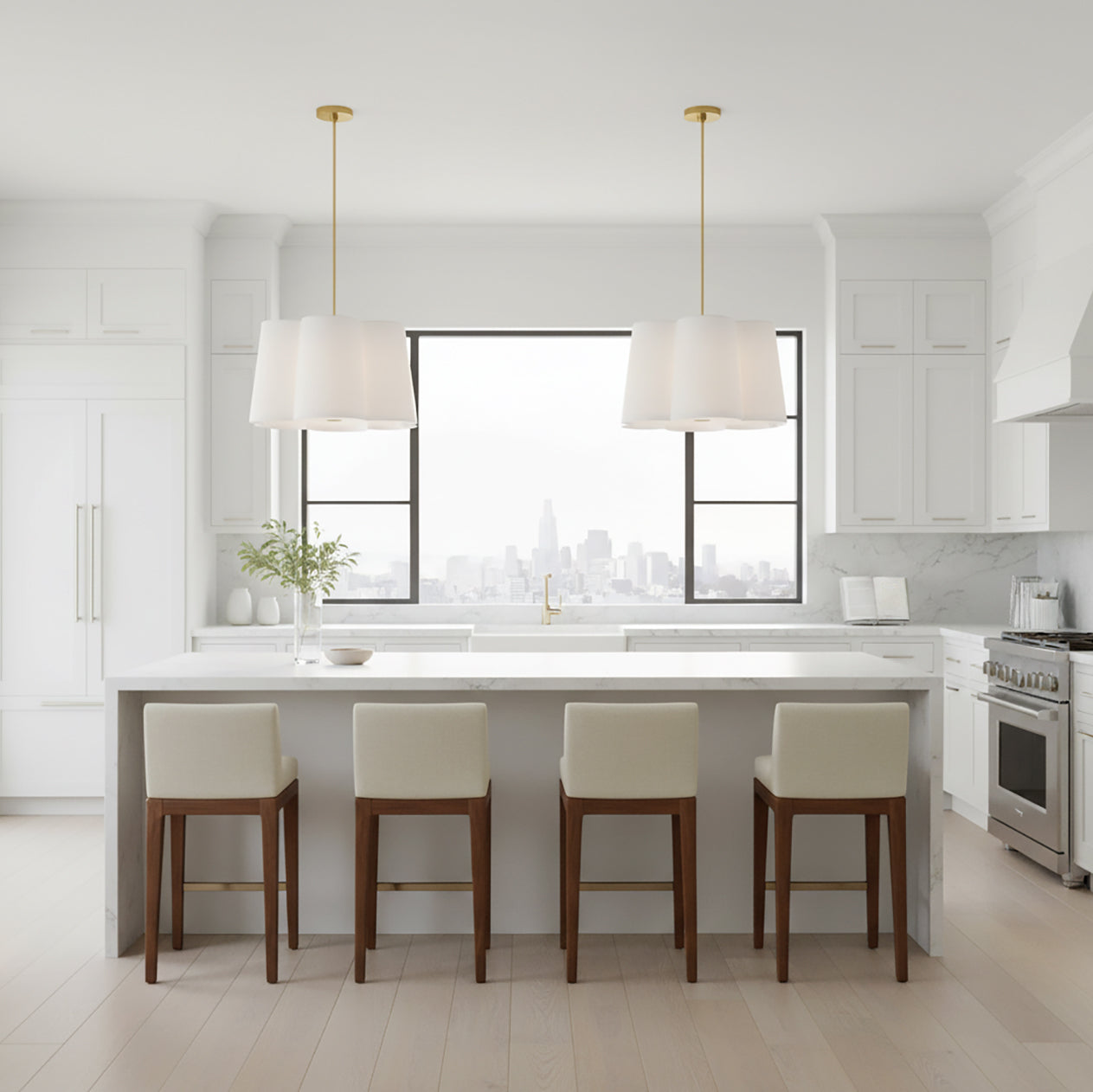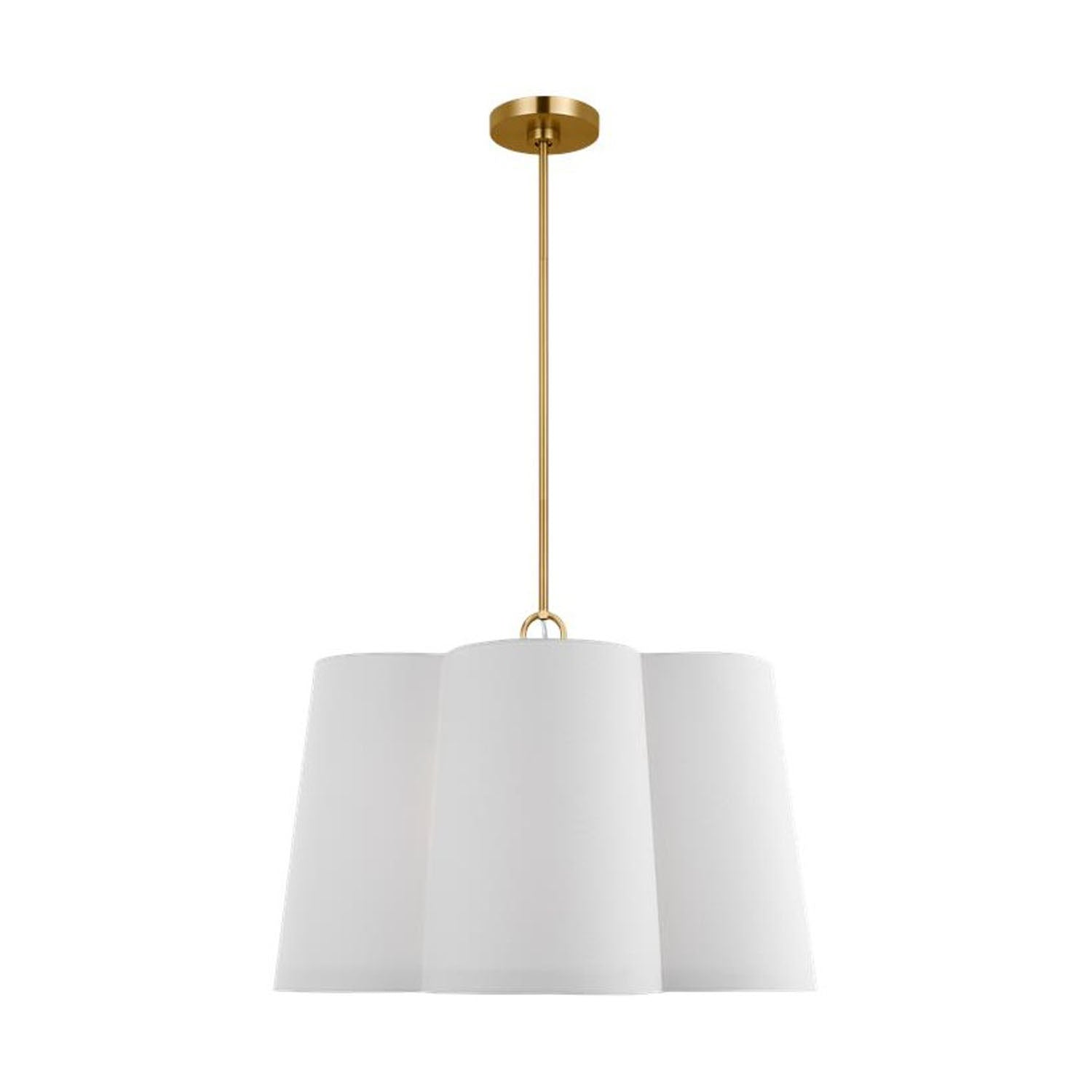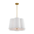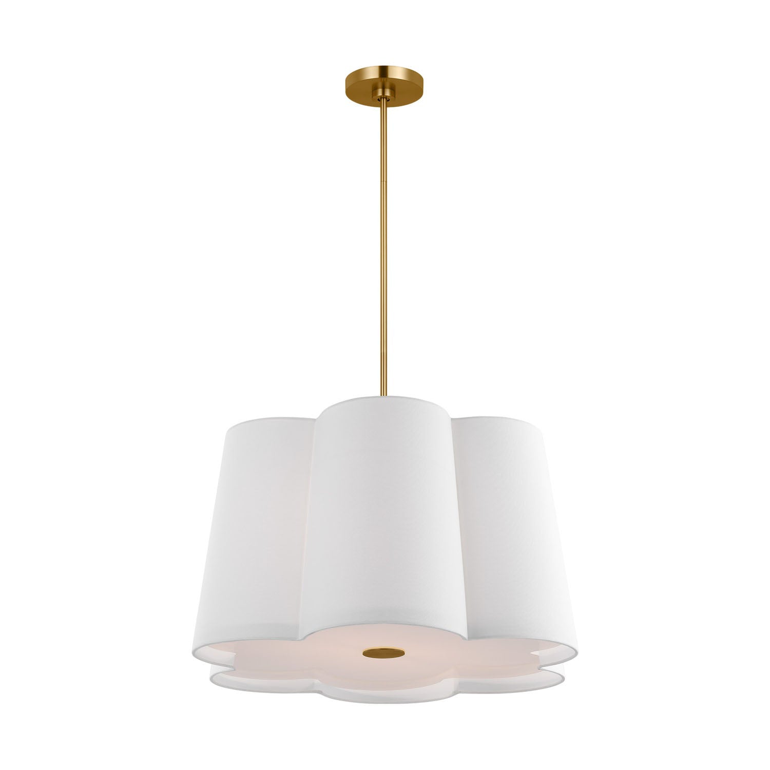 The Odelia Large Pendant features floral motifs that take center stage with its classic quatrefoil silhouette, beautifully updated with a fabric white shade and brass finish. This dramatic 28" pendant light adds a captivating focal point perfect for large dining rooms, living spaces, foyers, and areas seeking commanding lighting with sophisticated appeal. The combination of white fabric shade and brass accents creates timeless elegance while delivering exceptional illumination throughout expansive spaces. The damp-rated construction ensures reliable performance in various environments, while the dimmable capabilities provide a customizable ambiance. With its sloped ceiling compatibility and expert craftsmanship, this pendant transforms any space with distinctive style and performance.