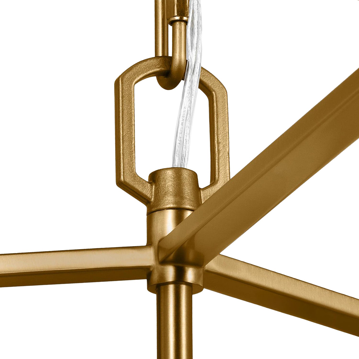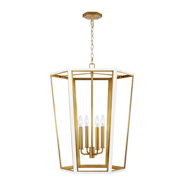 The Rawlin Medium Lantern Pendant makes a sophisticated statement with its beautifully structured frame and a modern lantern design. Its geometric silhouette creates an open, airy feel while providing sophisticated illumination from the exposed candelabra lights. This generously-sized pendant is thoughtfully designed to add a striking visual to any space. With its ETL damp rating, it is a versatile centerpiece for an entryway, dining room, or covered porch where enduring style and functional light are needed. The clean, two-tone finish of a matte white frame and a warm brushed brass interior creates a fresh, contemporary look that adds both functional beauty and timeless appeal.