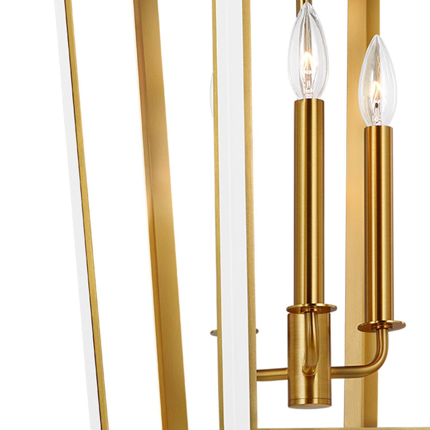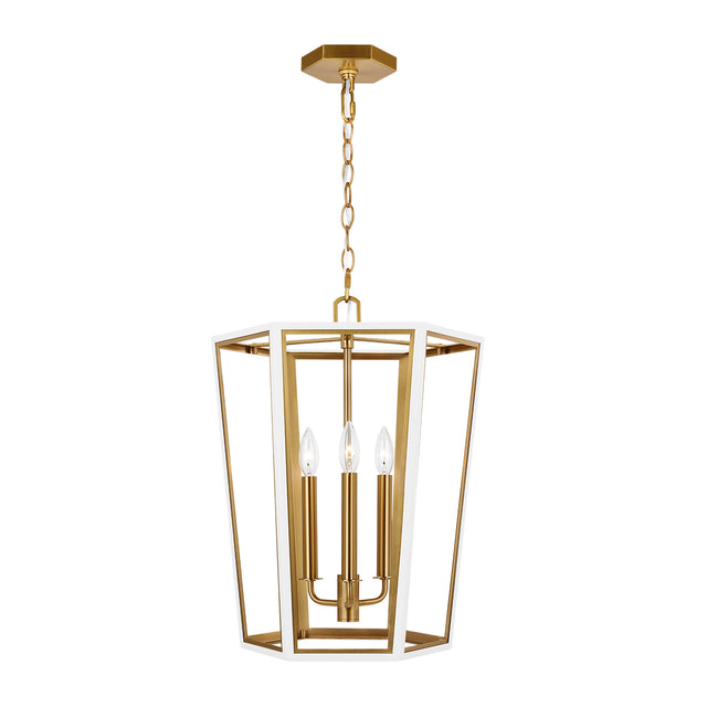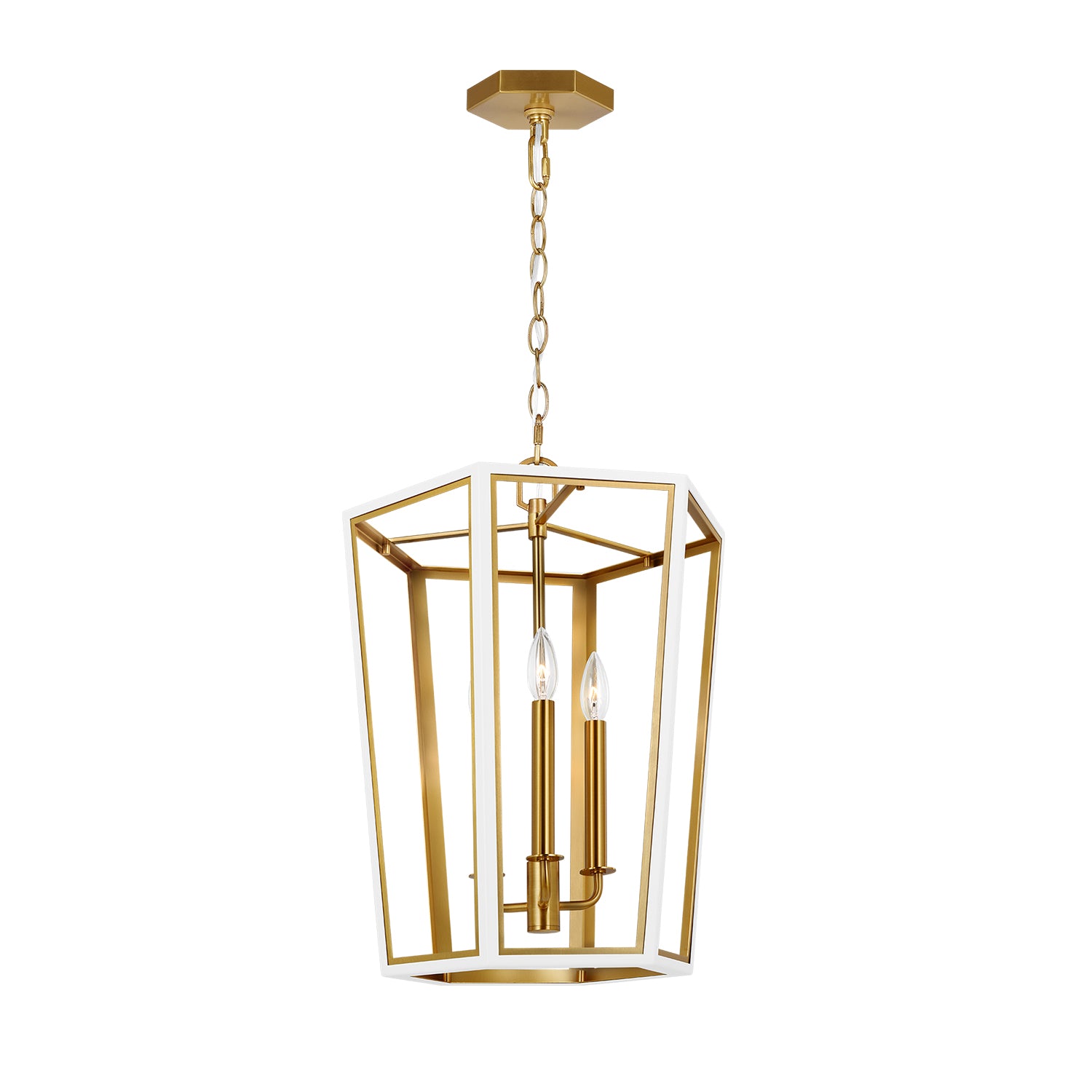 The Rawlin Small Lantern Pendant makes a sophisticated statement with its beautifully structured frame and a modern lantern design. Its geometric silhouette creates an open, airy feel while providing sophisticated illumination from the exposed candelabra lights. This pendant is thoughtfully designed to add a striking visual to any space. With its ETL damp rating, it is a versatile accent for an entryway, hallway, or even a covered porch where enduring style and functional light are needed. The clean, two-tone finish of a matte white frame and a warm brushed brass interior creates a fresh, contemporary look that adds both functional beauty and timeless appeal.