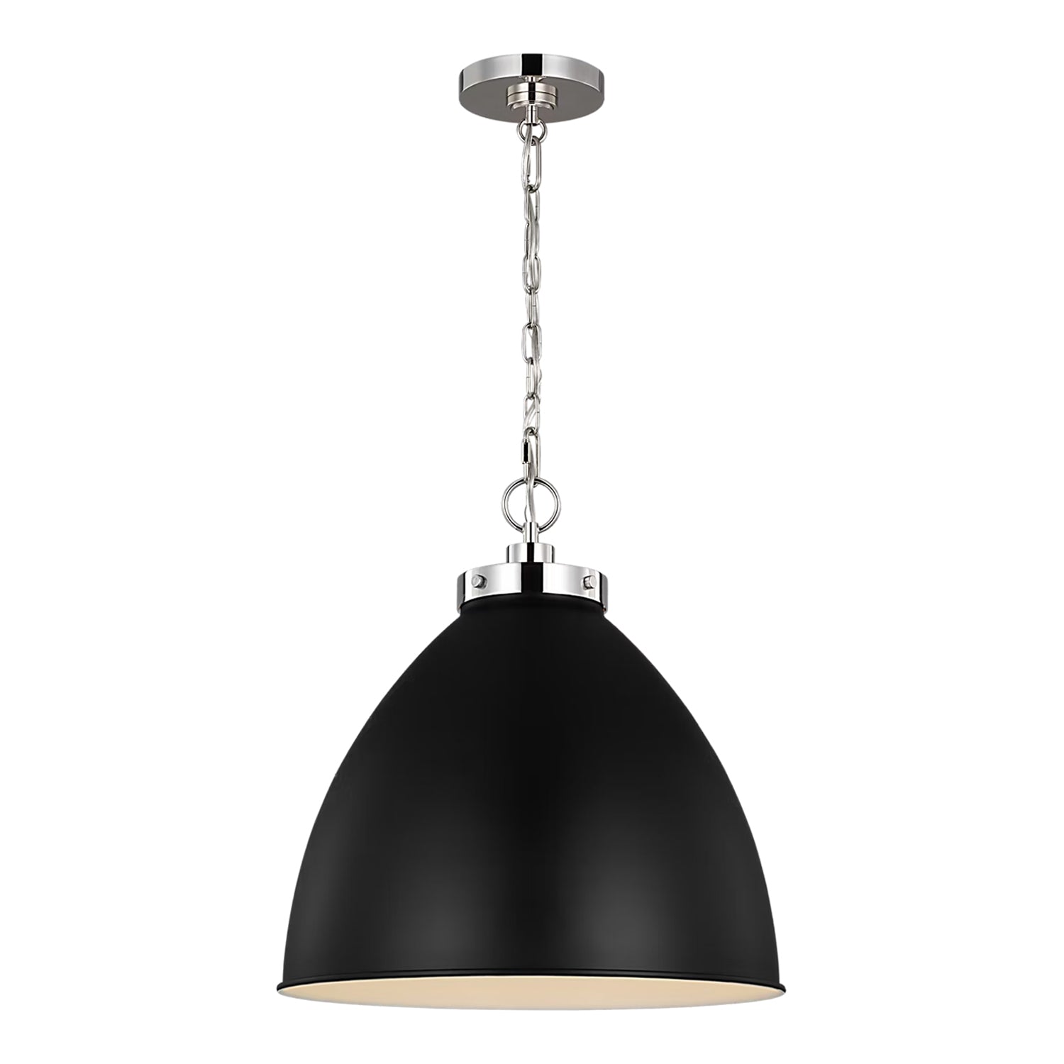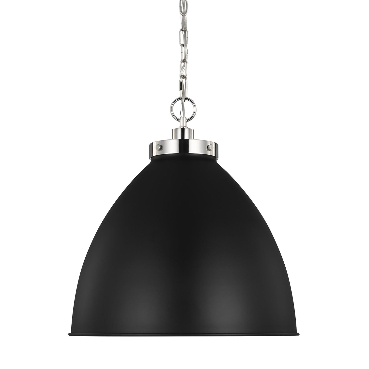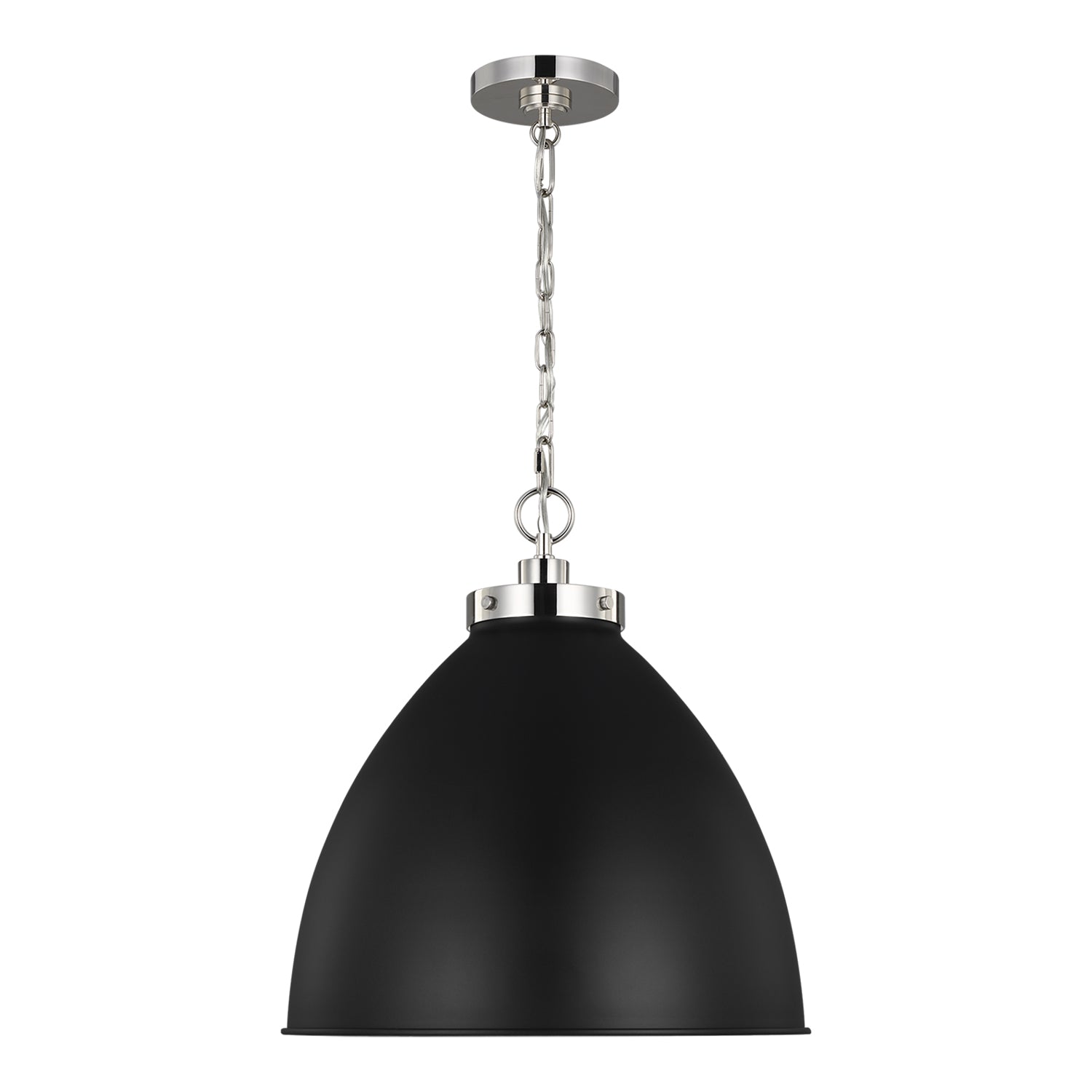 The Rodney Large Pendant makes a refined statement with its elegant dome shade suspended from a sleek chain. Its curved shade is crafted to cast a soft, focused glow, creating an intimate ambiance perfect for any space. This substantial fixture is ideal for grand entryways, larger dining areas, and open-concept living spaces, where it provides ambient illumination while making a stylish statement. The bold matte black shade beautifully complements the sleekness of the polished nickel finish, creating a striking, sophisticated look that adds both functional beauty and enduring style.