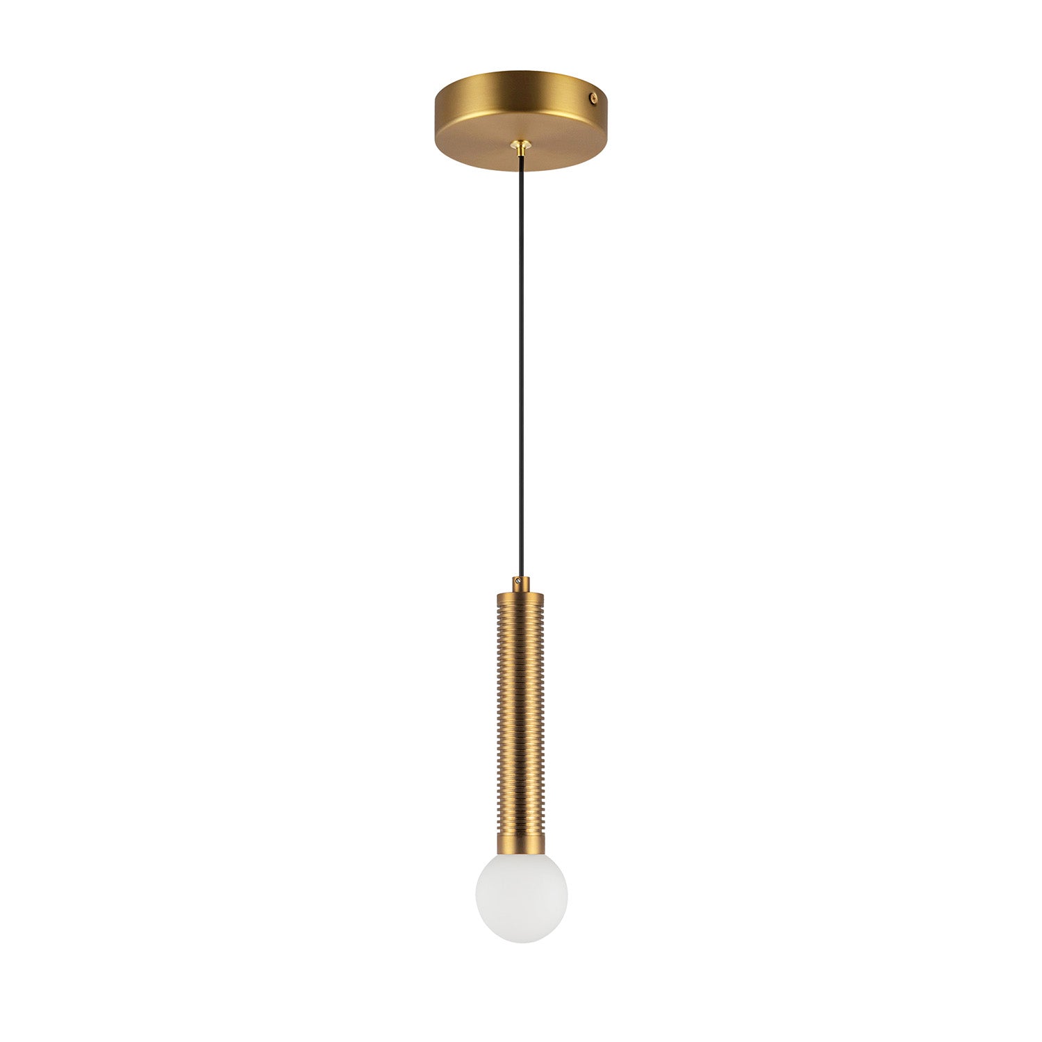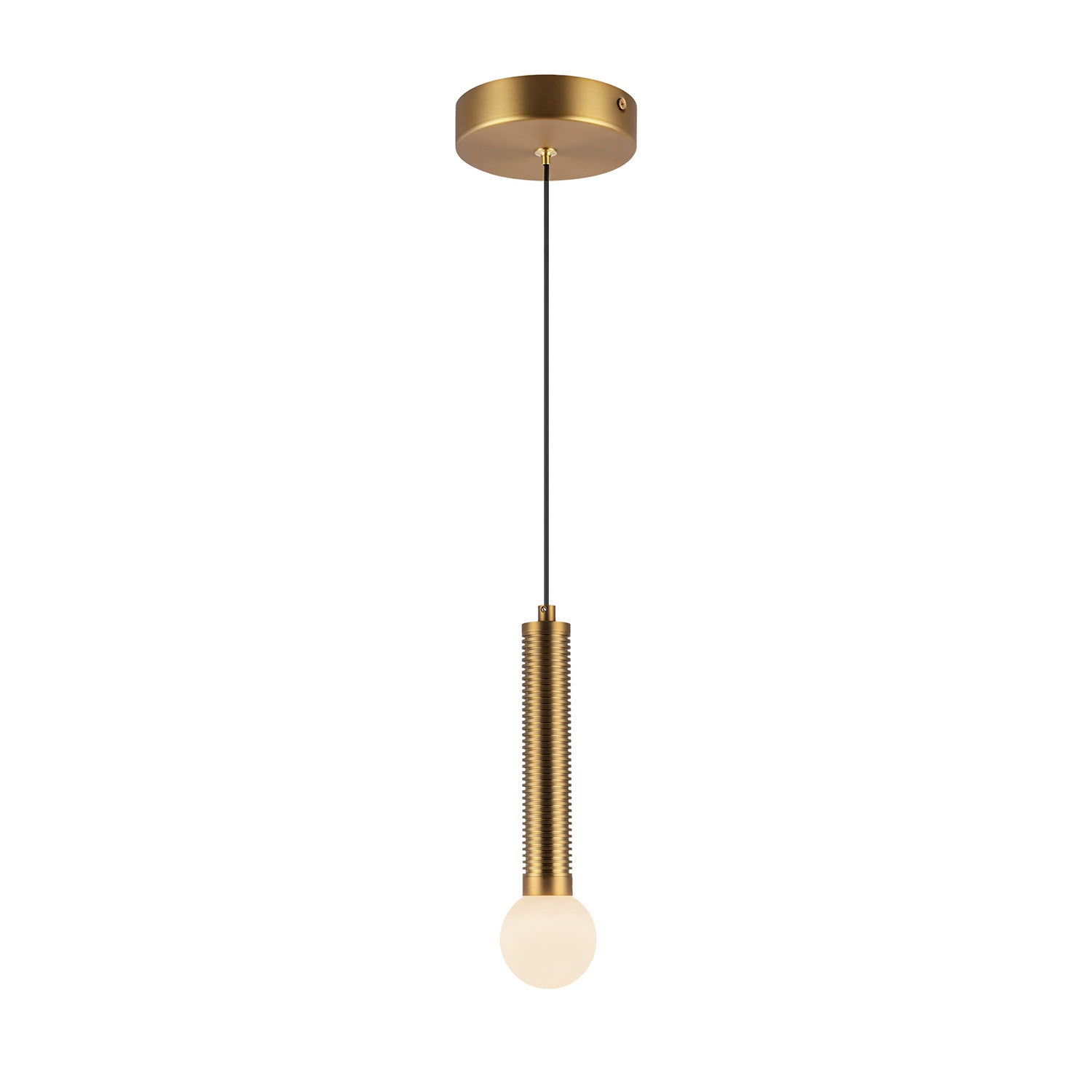 • The Shiloh LED Pendant features a linear design in brushed brass with slated metal details and an opal glass accent, with integrated LED technology
