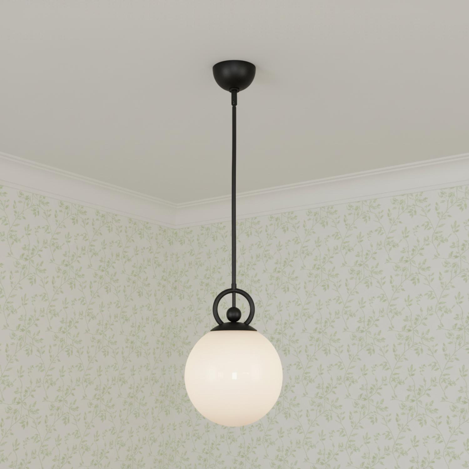 • Tristen Pendant features a spherical design with decorative black ring detail and opal glass globe in matte black finish