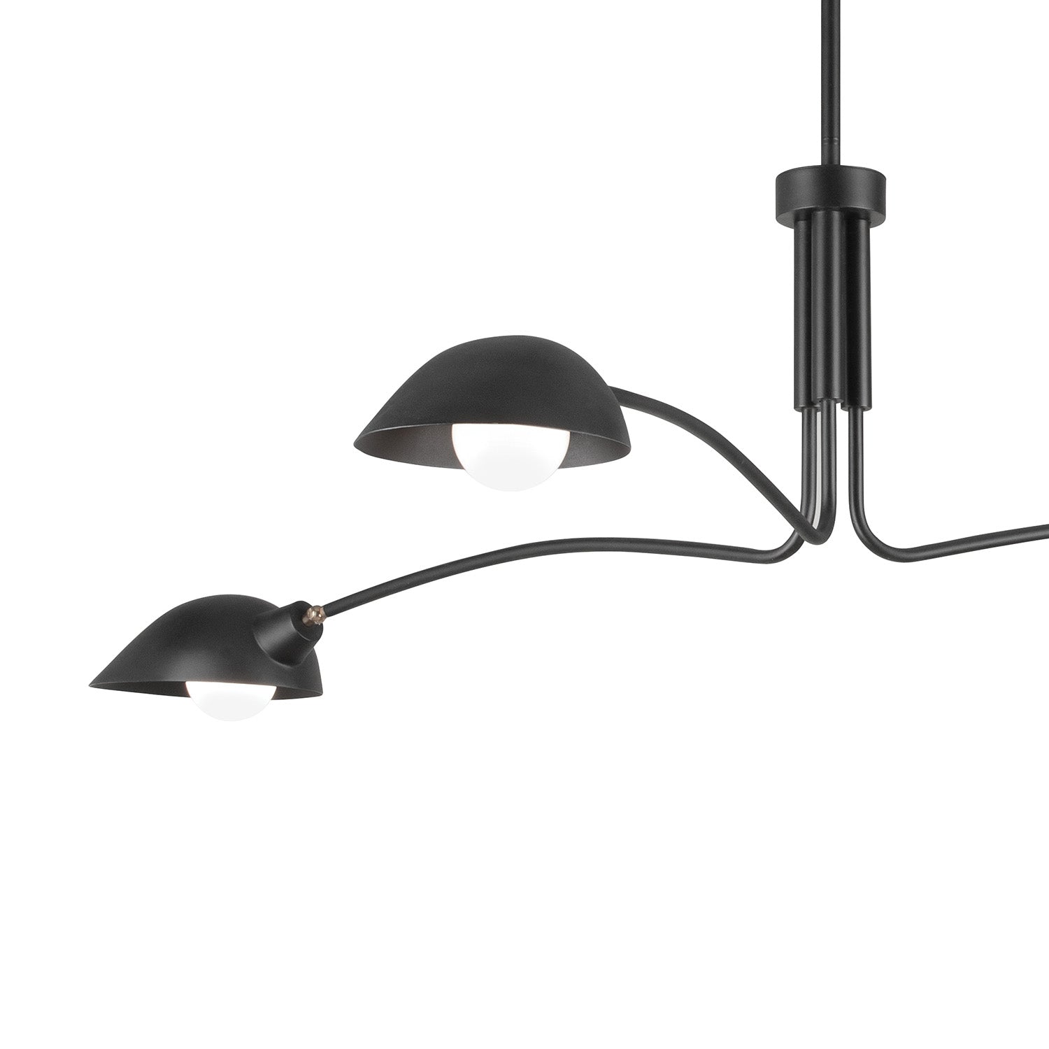 The Royce 3 Light Chandelier makes a bold mid-century-modern architectural statement with its expansive 67.5" span and sculptural mantis-inspired design. Three rounded metal shades in a sophisticated soft black finish suspend from sweeping curved arms that extend gracefully from a central point, creating a dramatic visual impact while maintaining sleek contemporary appeal. The generous scale and striking silhouette make this fixture ideal for large dining rooms, great rooms, or open-concept spaces where substantial lighting is needed. Each shade can be rotated to direct light exactly where desired, offering both functional flexibility and custom ambiance. This commanding piece brings contemporary MCM elegance to modern and transitional interiors, proving that minimalist design can have maximum presence.