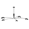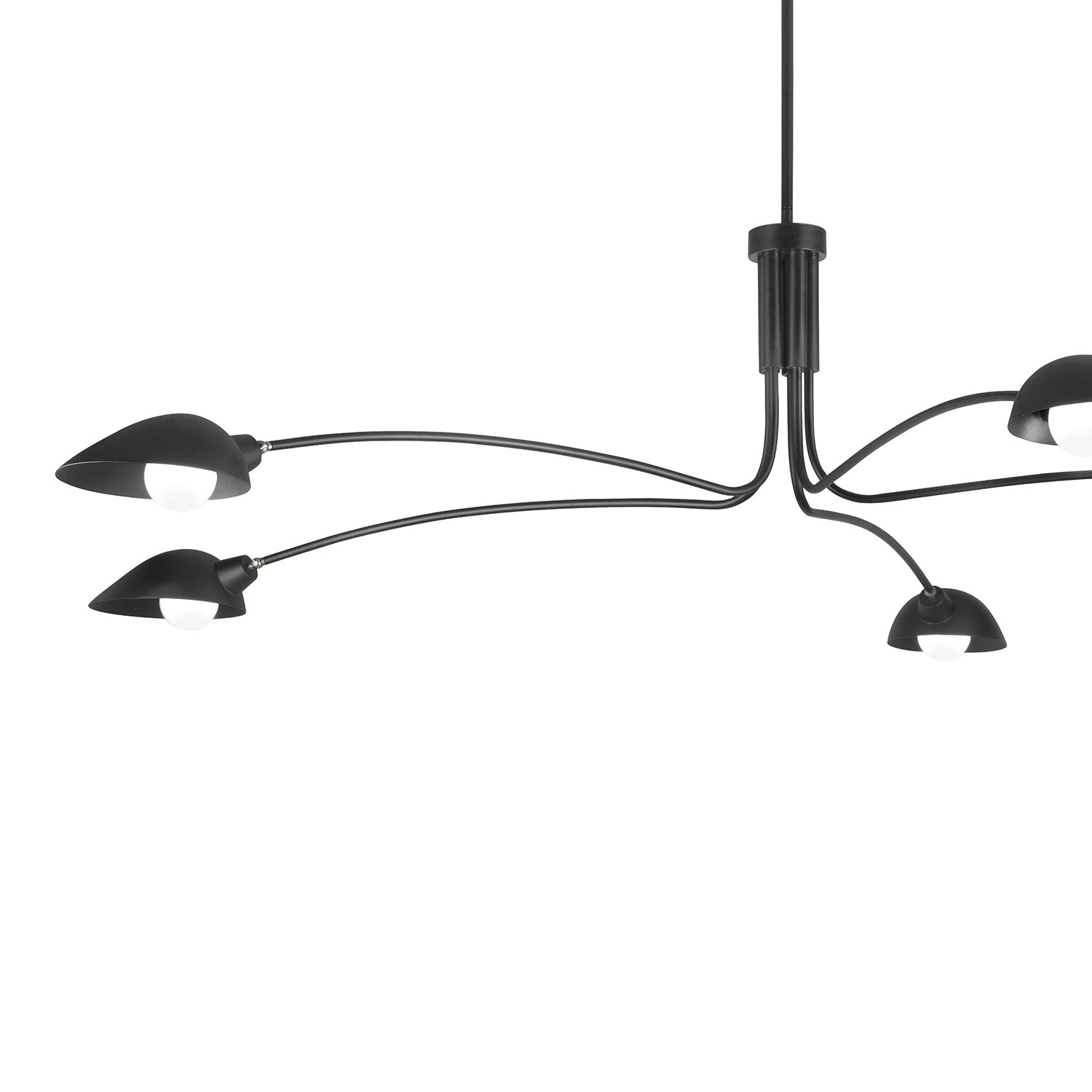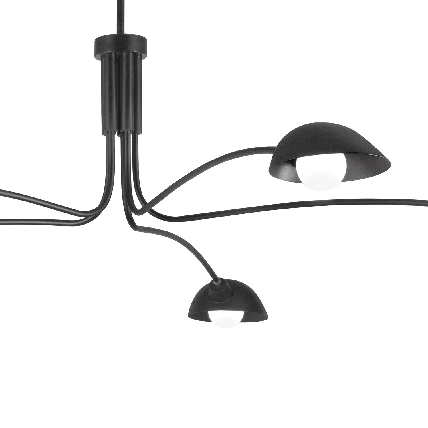 The Royce 6 Light Chandelier commands attention with its impressive 84" span and sculptural mantis-inspired design. Six rounded metal shades in a sophisticated soft black finish suspend from gracefully curved arms that radiate from a central point, creating an extraordinary visual impact while maintaining a sleek mid-century-modern appeal. The monumental scale and striking asymmetrical silhouette make this fixture perfect for grand dining rooms, great rooms, or expansive open-concept spaces where dramatic lighting is essential. Each shade can be rotated to direct light exactly where desired, offering both functional flexibility and custom ambiance. This commanding seven-foot fixture brings contemporary elegance to modern and transitional interiors, proving that minimalist design can create maximum presence.