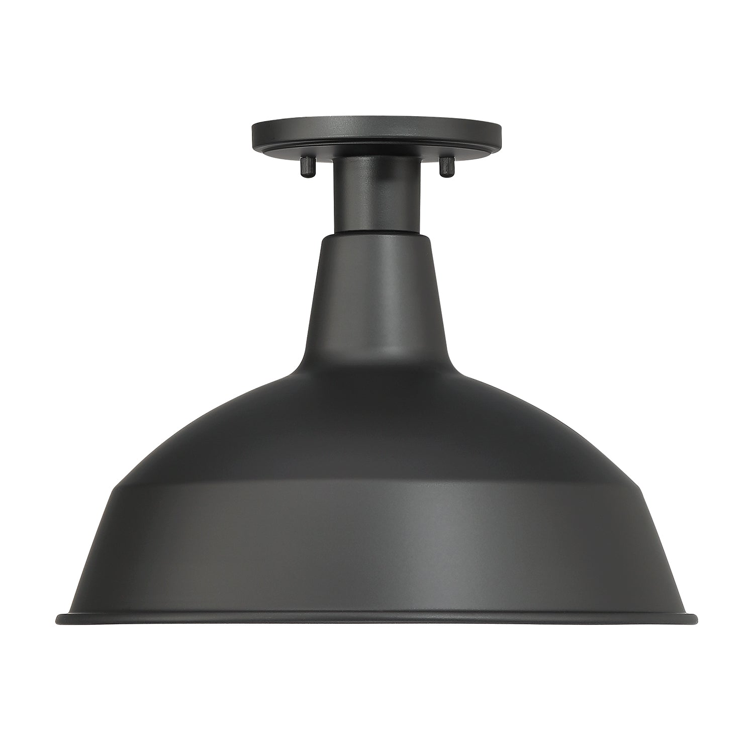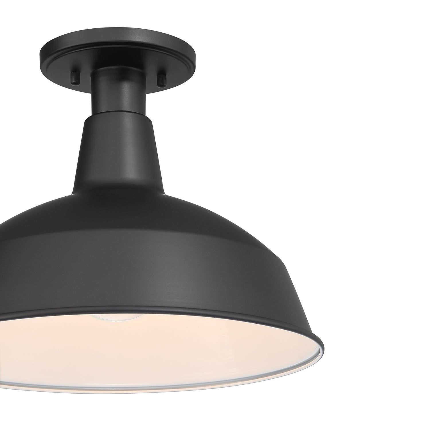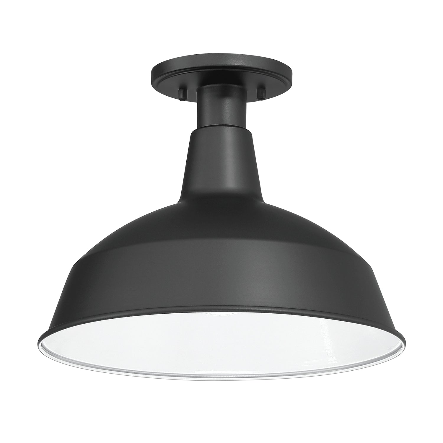 Inspired by turn-of-the-century industrial lighting, the Asher Outdoor collection brings a modern farmhouse flair to your home or commercial space. This semi-flush mount lights feature a modern, 12.5" shade, and is suspended from a round canopy, and have a durable, powder-coated finish. The matte black finish with white interior adds a refined note to this updated barn light. Designed and safe for covered outdoor use, this industrial-chic fixture also works great indoors for a mudroom, kitchen, or bathroom. Bring soft, direct light to your covered walkway, or upgrade your front porch with this stylish, modern barn light. The Asher Outdoor Flush Mount Light is part of a larger collection of fixtures to complete your lighting needs.