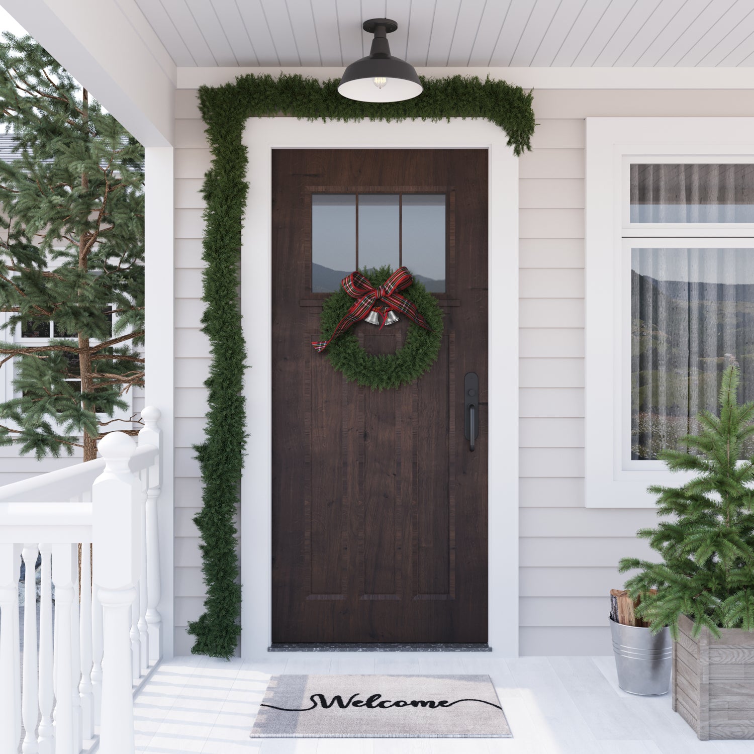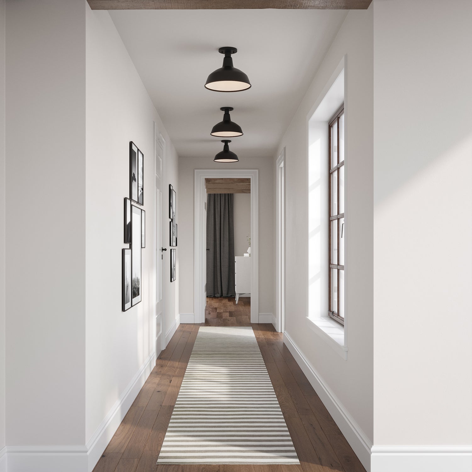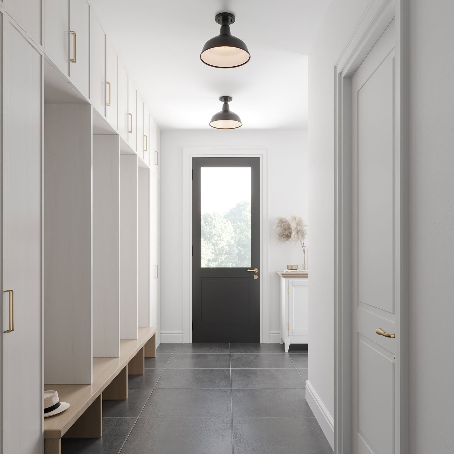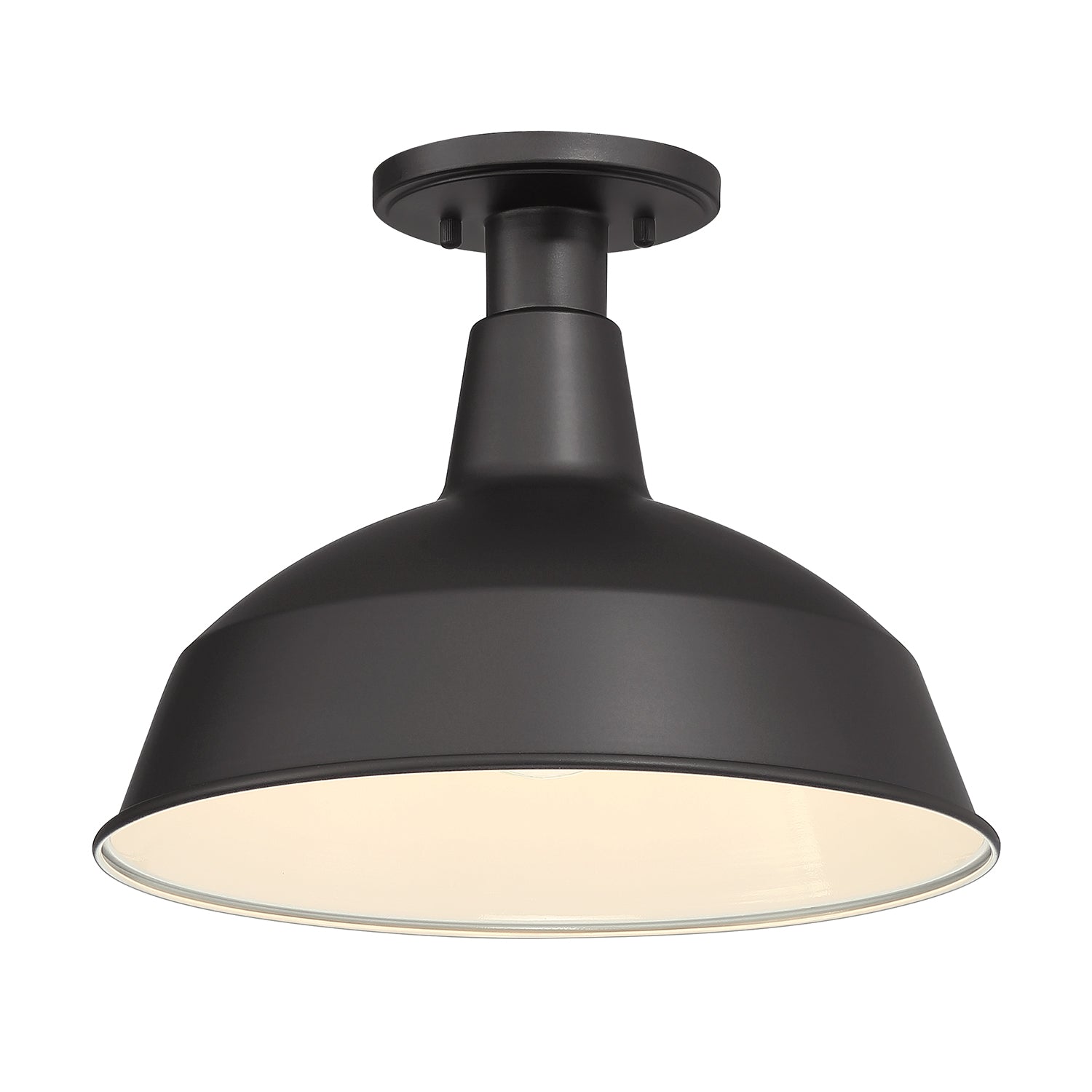 Inspired by turn-of-the-century industrial lighting, the Asher Outdoor collection brings a modern farmhouse flair to your home or commercial space. This semi-flush mount lights feature a modern, 12.5" shade, and is suspended from a round canopy, and have a durable, powder-coated finish. The matte black finish with white interior adds a refined note to this updated barn light. Designed and safe for covered outdoor use, this industrial-chic fixture also works great indoors for a mudroom, kitchen, or bathroom. Bring soft, direct light to your covered walkway, or upgrade your front porch with this stylish, modern barn light. The Asher Outdoor Flush Mount Light is part of a larger collection of fixtures to complete your lighting needs.