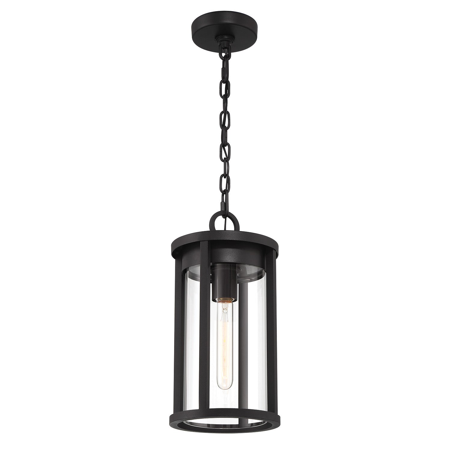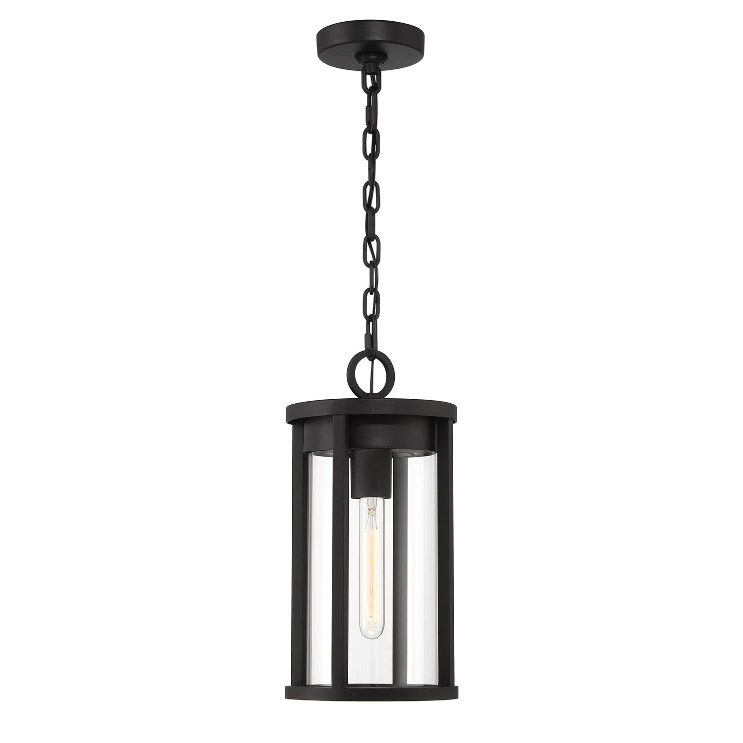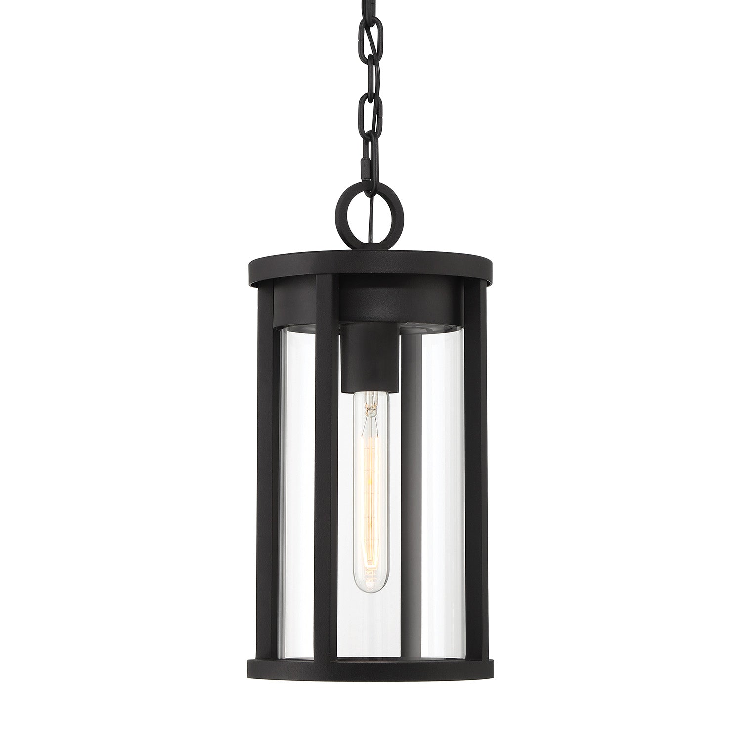 Drawing on inspiration from the popular Craftsman design aesthetic, the Cyrus Outdoor Hanging Light is a charming lantern-style fixture to adorn your home, indoors or out. A single bulb enclosed by a round clear glass shade is neatly held in place inside a Mission-style metal frame. This outdoor ceiling-mounted fixture is suspended by the ring top loop from a matching, adjustable 72" long chain. This Mission-style exterior light is constructed to withstand the elements and is powder-coated with a matte black finish that is suited for any exterior lighting design. Ideal for adding a welcoming feel to any porch or outdoor space, this charming fixture can also be used indoors in a foyer or as pendants in a kitchen. The Cyrus Outdoor Hanging Light is part of a larger collection of exterior lighting to complete your project.