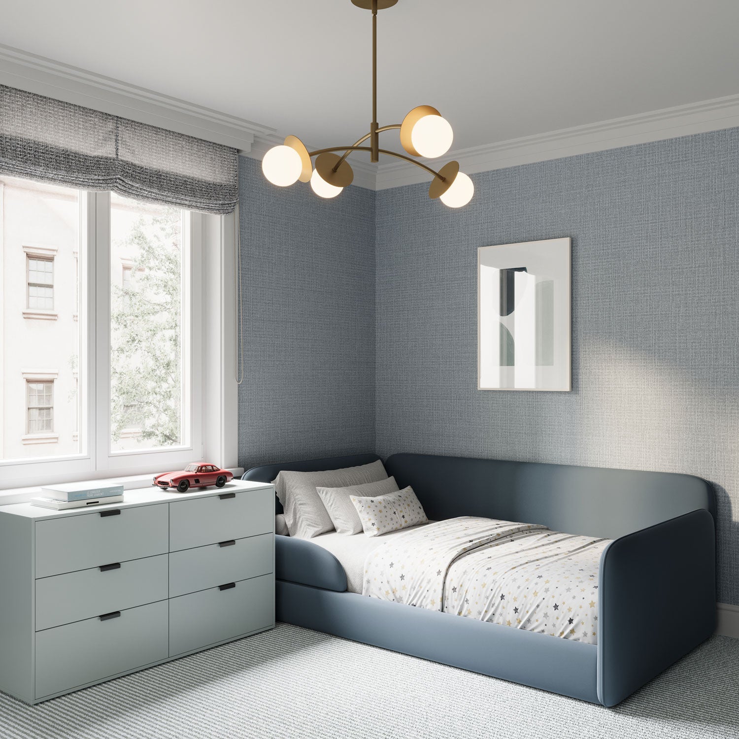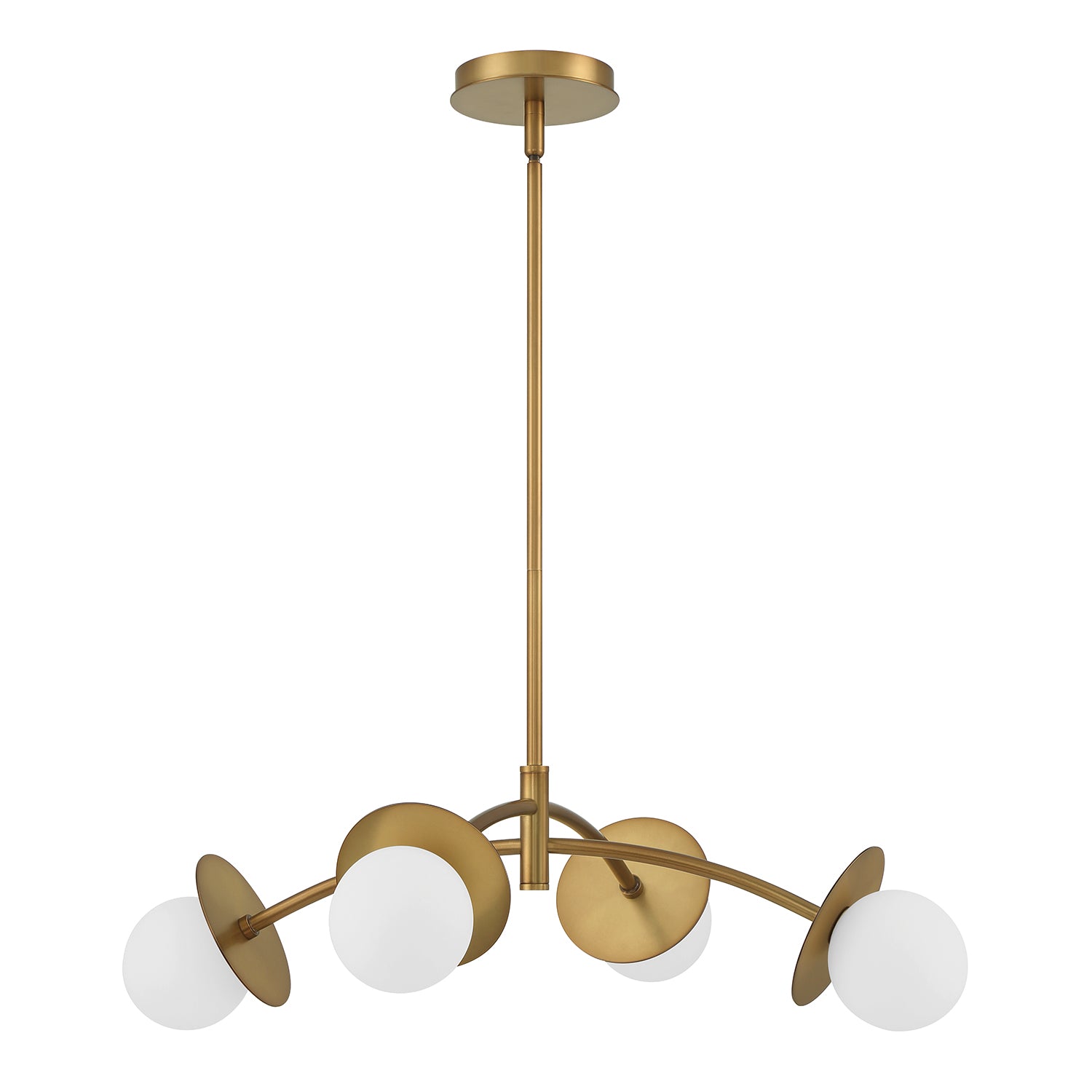 Graceful and modern, the Levi 4-Globe Chandelier presents a pleasing aesthetic sure to elevate the design and be a focal point of any cozy space. Elegantly curved arms extend from the center hub, giving way to matching metal discs that softly reflect the light from four white opal glass globes. The Aged Brass frame is hand-finished, giving this fixture a warm, luxurious feel. The Levi Chandelier is both stylish and versatile as it can be installed on a sloped ceiling, comes with various-sized matching down rods, and is dimmable. This 26" wide ceiling light is best suited as the feature above a dining nook, an entryway, or a small island, and comes with four warm-white LED bulbs ready for installation.