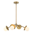 • Modern chandelier featuring swooping curved arms extending from the center hub and four opal glass globes in an elegant aged brass finish