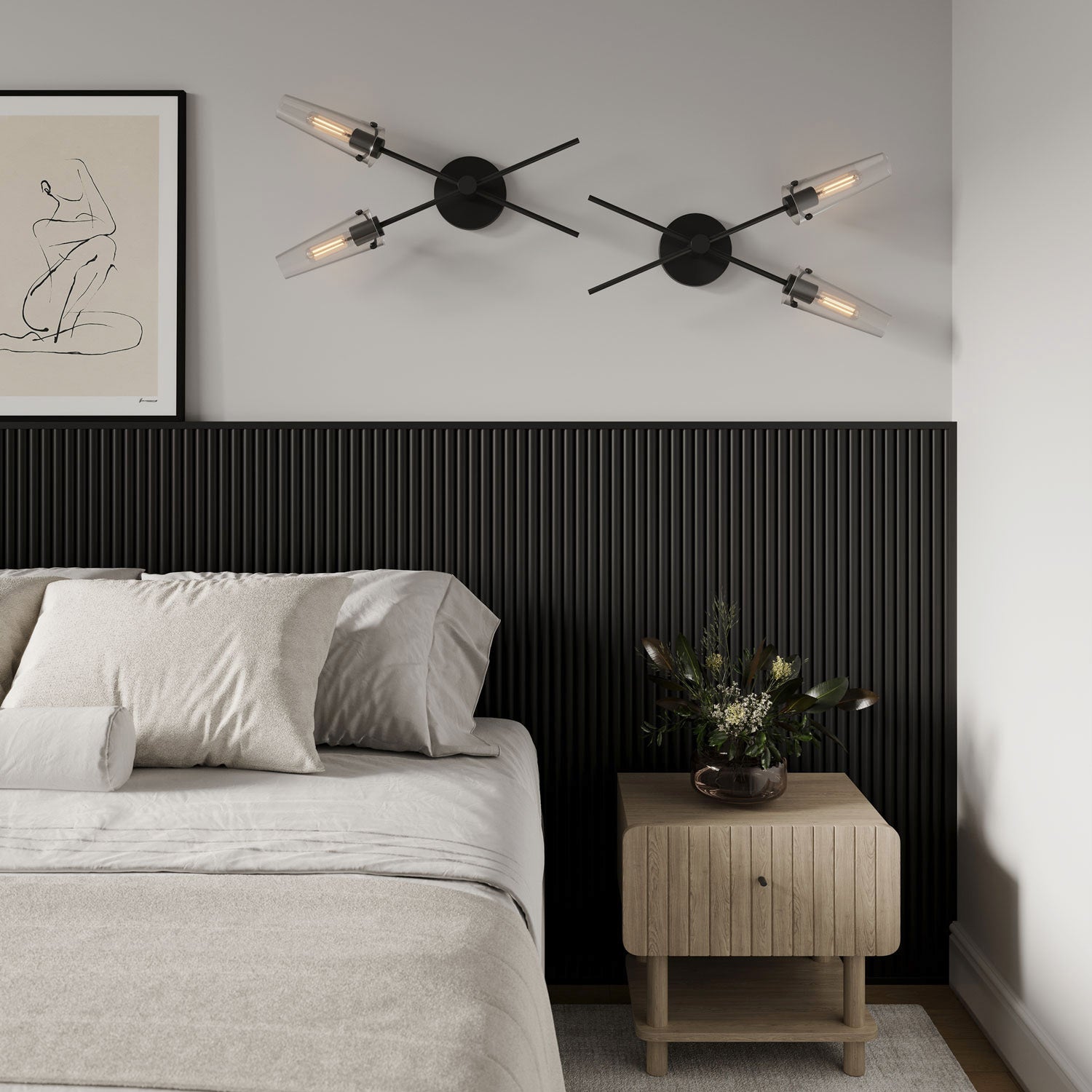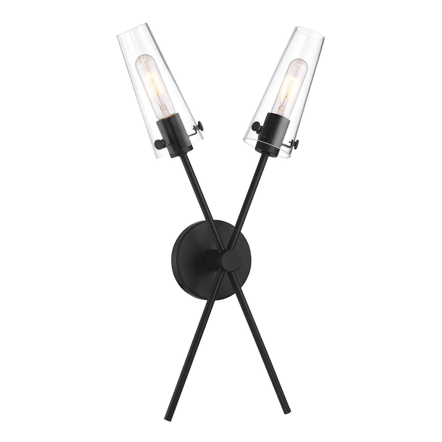 • Wall light inspired by modern industrial design features two clear tapered glass shades set on two crossed arms and a round backplate, in a sleek matte black finish