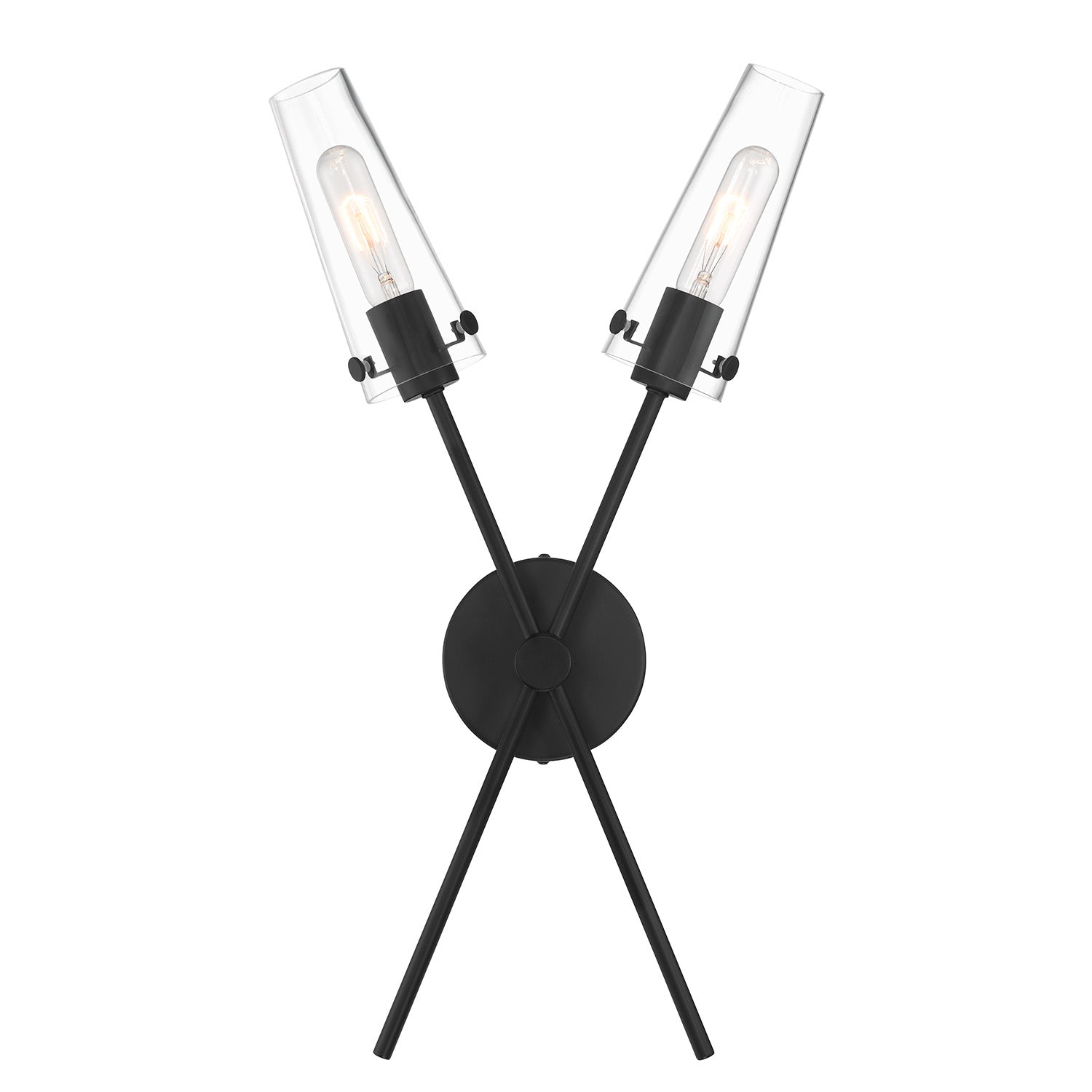 Boasting a trendy modern industrial design, our Mason 2 Light Wall Sconce is perfect blend of form and function. Tapered glass shades are set on the ends of crossing vertical arms, all mounted on a circular backplate, and finished in sleek matte black. Measuring 24" tall and 13.5" wide, this substantial and eye-catching wall light makes a statement wherever you install it. Versatile as well as beautiful, mount the Mason sconce facing any direction you like, for a custom look. This dimmable light allows you to set the perfect mood, when paired with dimmable bulbs and dimmer switch (not included). The Mason sconces are also available in a single light fixture and coordinate perfectly with the Mason 4 Light Chandelier. Choose this industrial modern light for a modern home, a rustic loft, a chic hotel, or a trendy restaurant.