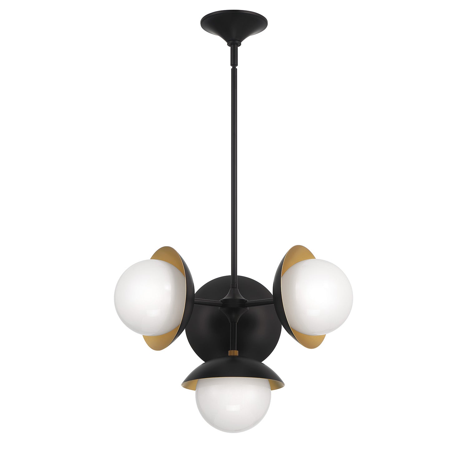 The Mira 4-Light Pendant is a gorgeous mid-century design with modern sensibilities. Details abound in this eye-catching ceiling light. The fixture is suspended from an artfully designed canopy and a single downrod that supports the four globe-shaped lights. The satin brass hoods of each light reflect a rich, warm glow from the opal glass globes. This ceiling light is finished in matte black, which beautifully pairs with the satin brass details. The Mira 4-Light Pendant adds a gorgeous mid-century touch to your kitchen, dining room, or lighting project and looks great as a single feature or in pairs over an island.