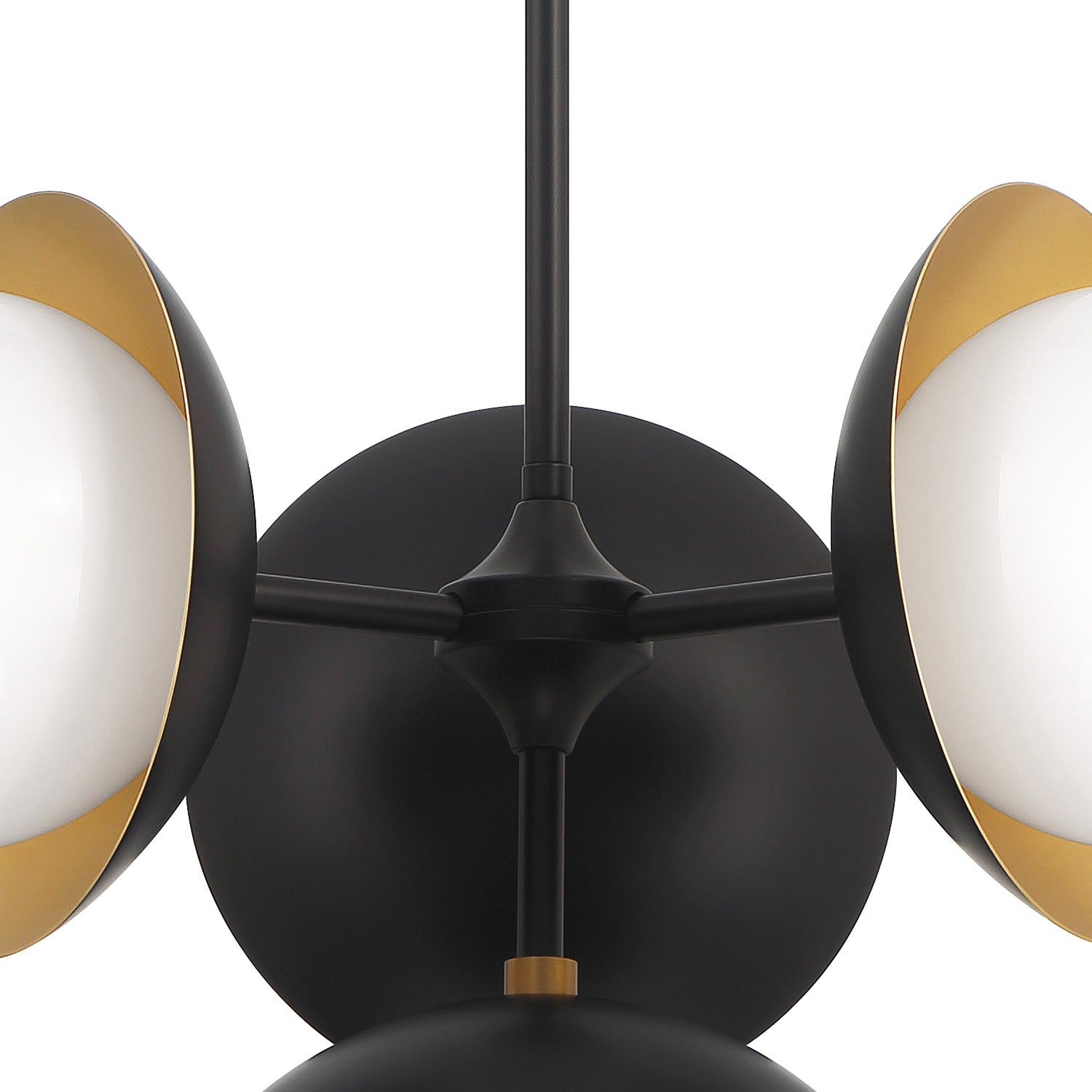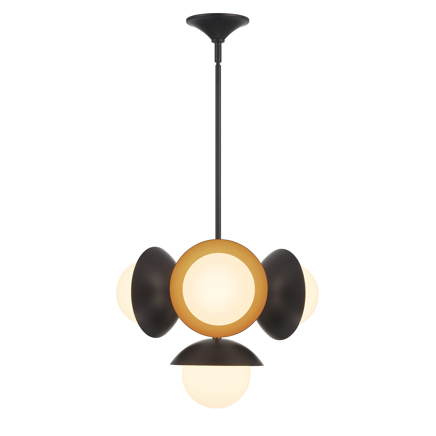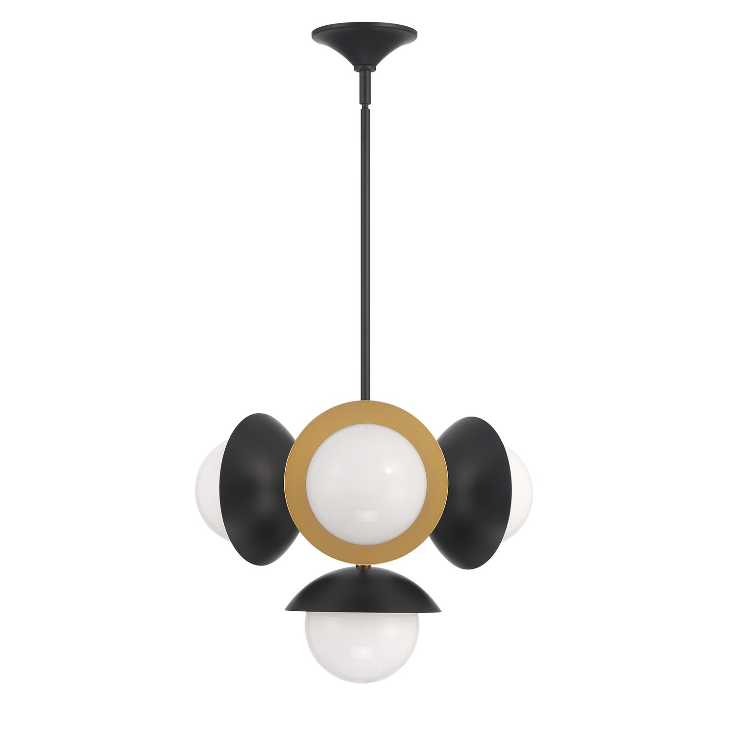 • Matte black and satin brass 4-light pendant with opal glass globes and fine detailing that exemplifies mid-century-modern design