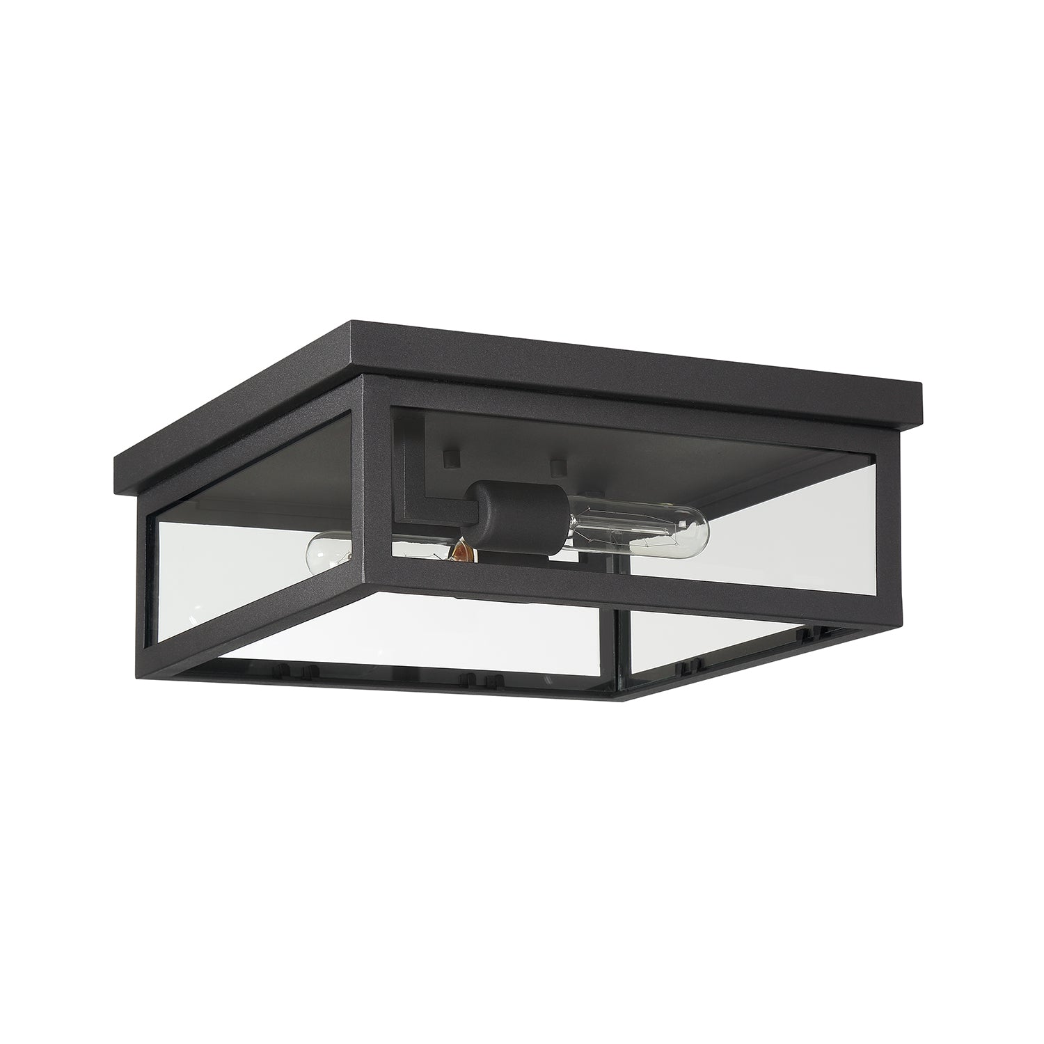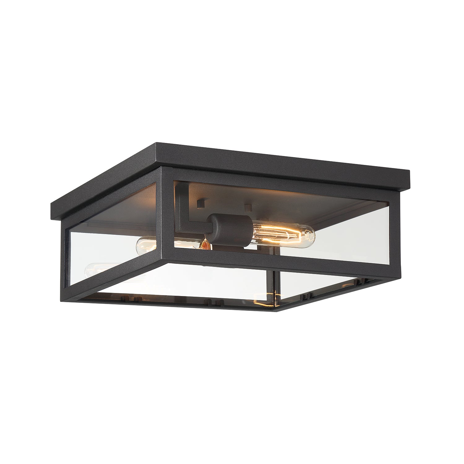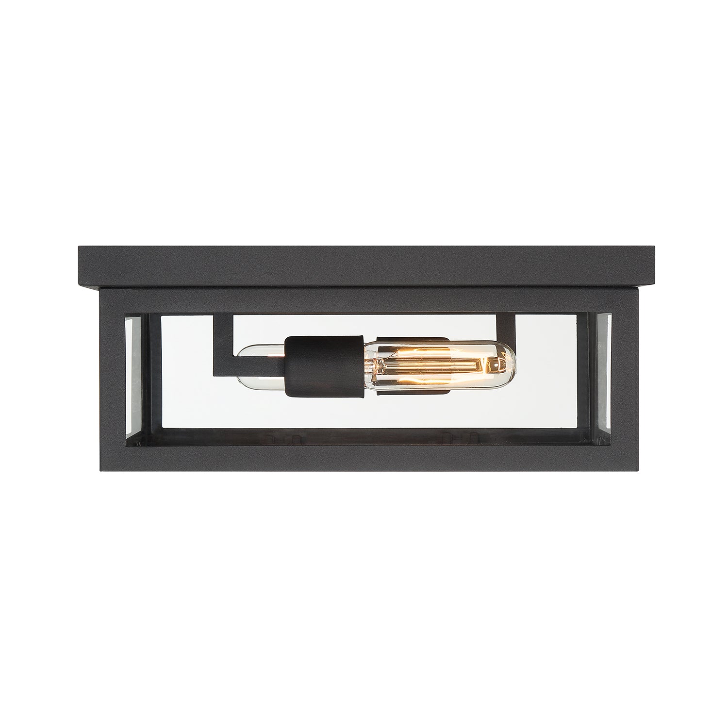 Uncomplicated and modern, the Sam Collection Outdoor Flush Mount complements any design. With the crisp, clean lines of the black metal frame and dual bulbs highlighted within clear glass side panels, this fixture will brighten any space. Flush mounts are excellent for adding illumination to dark spaces indoors or outdoors and are ideal when used in succession on a porch or in a hallway. The Sam Outdoor Flush Mount is part of the full Sam Collection, which encompasses fixture styles to meet any design need.