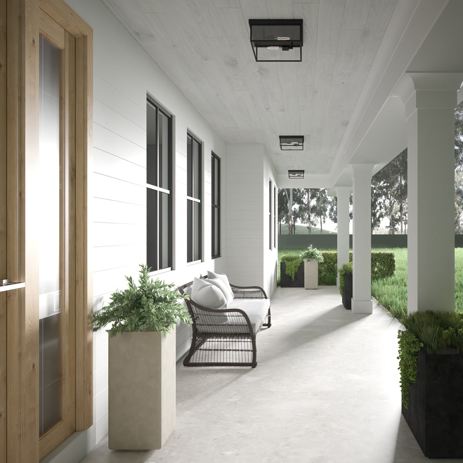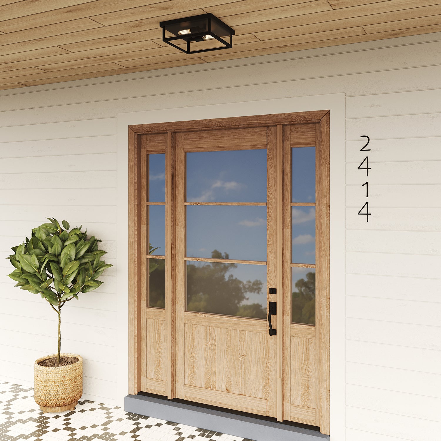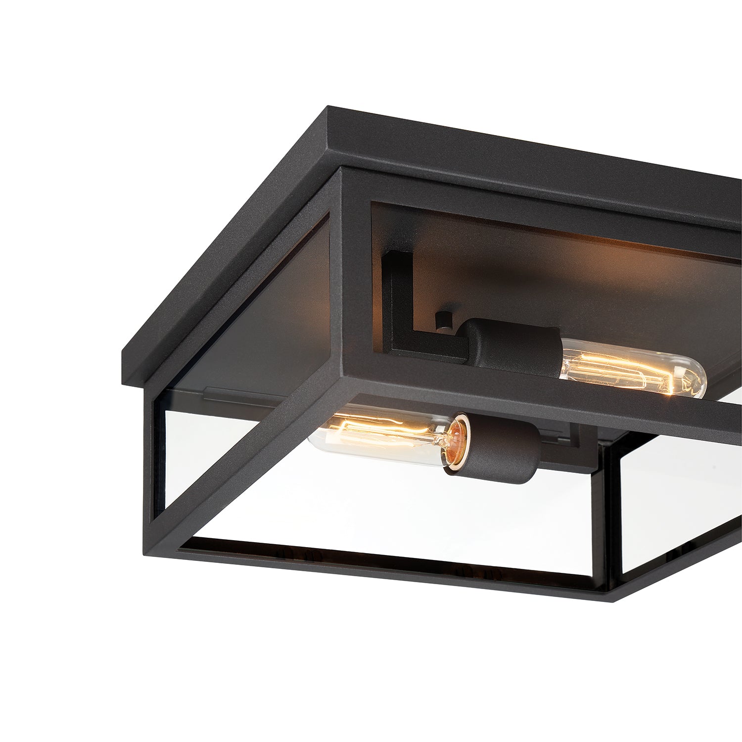 Uncomplicated and modern, the Sam Collection Outdoor Flush Mount complements any design. With the crisp, clean lines of the black metal frame and dual bulbs highlighted within clear glass side panels, this fixture will brighten any space. Flush mounts are excellent for adding illumination to dark spaces indoors or outdoors and are ideal when used in succession on a porch or in a hallway. The Sam Outdoor Flush Mount is part of the full Sam Collection, which encompasses fixture styles to meet any design need.
