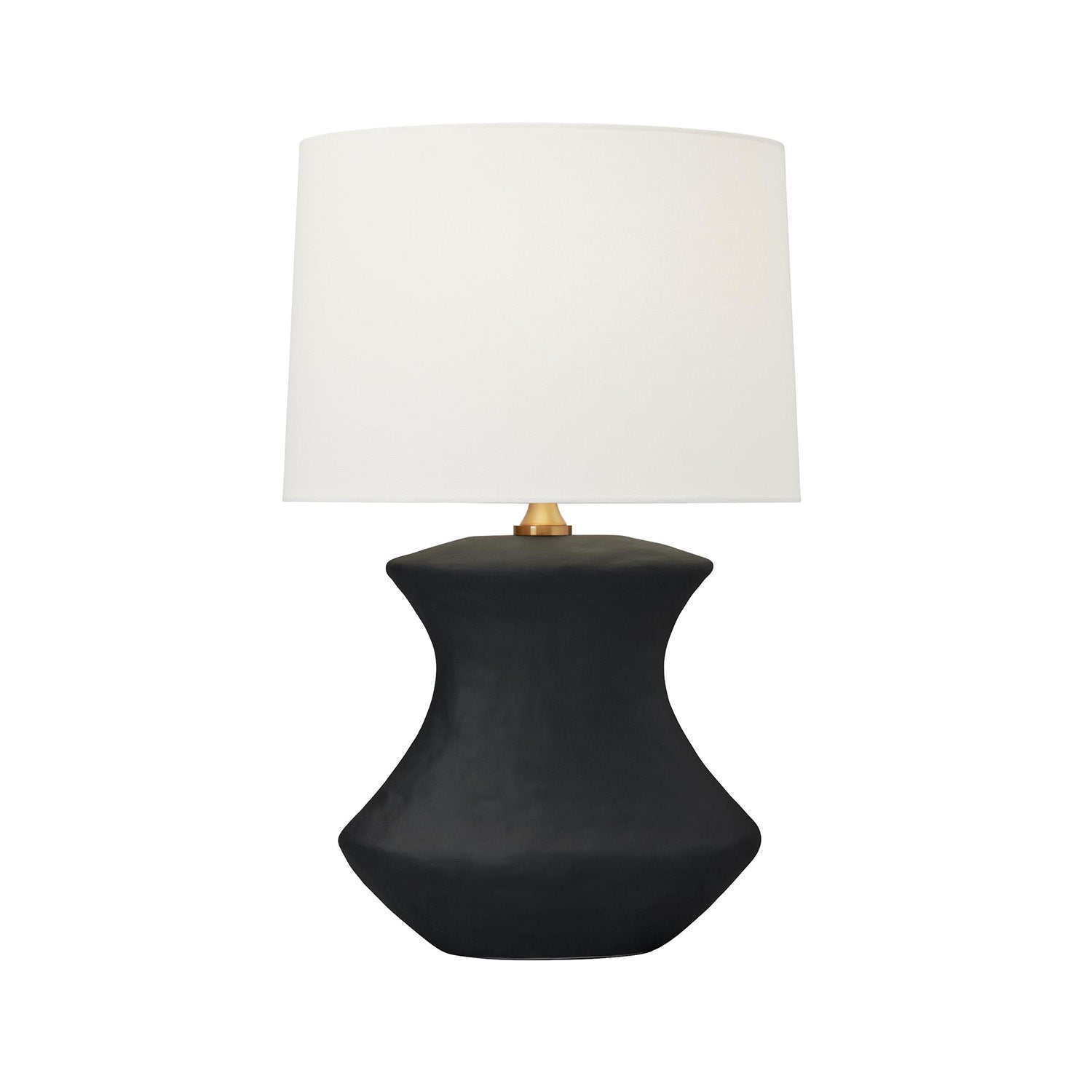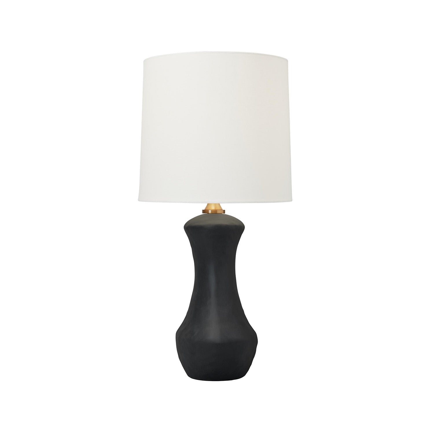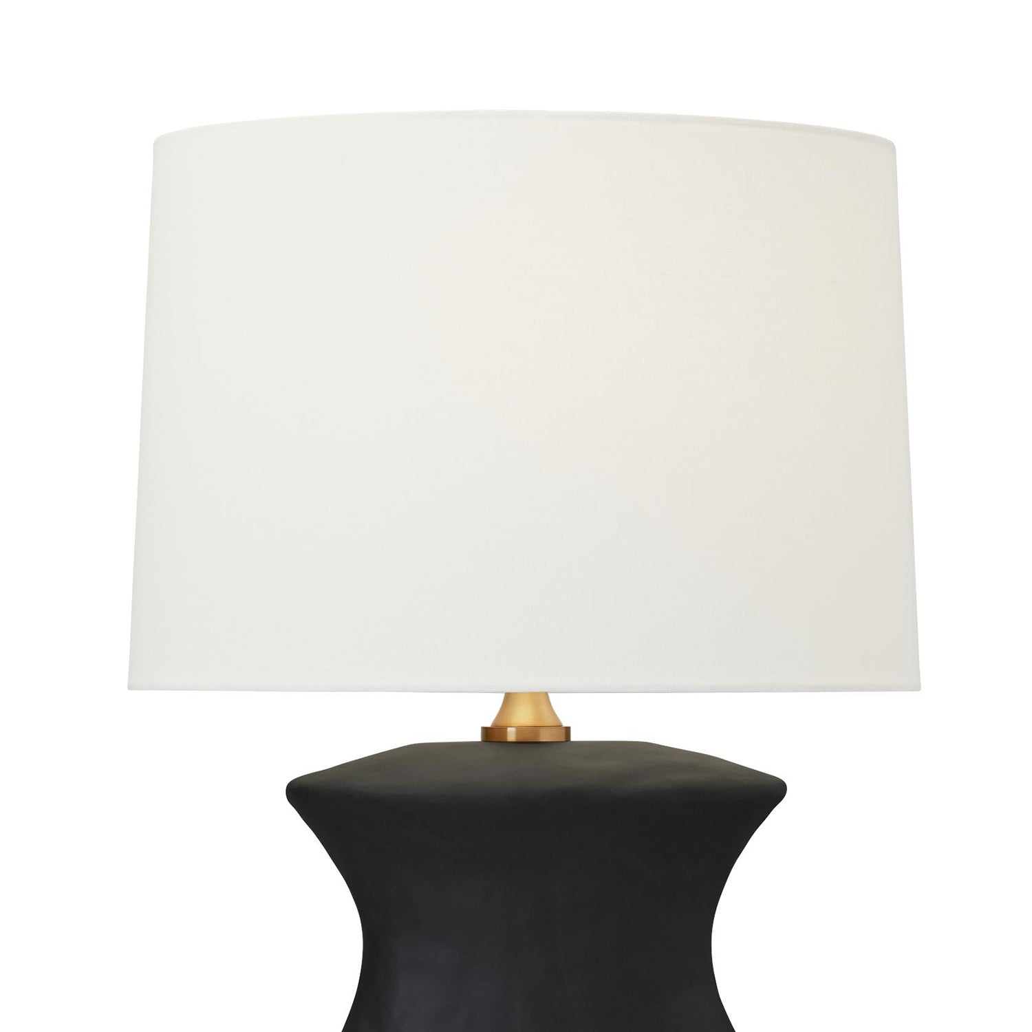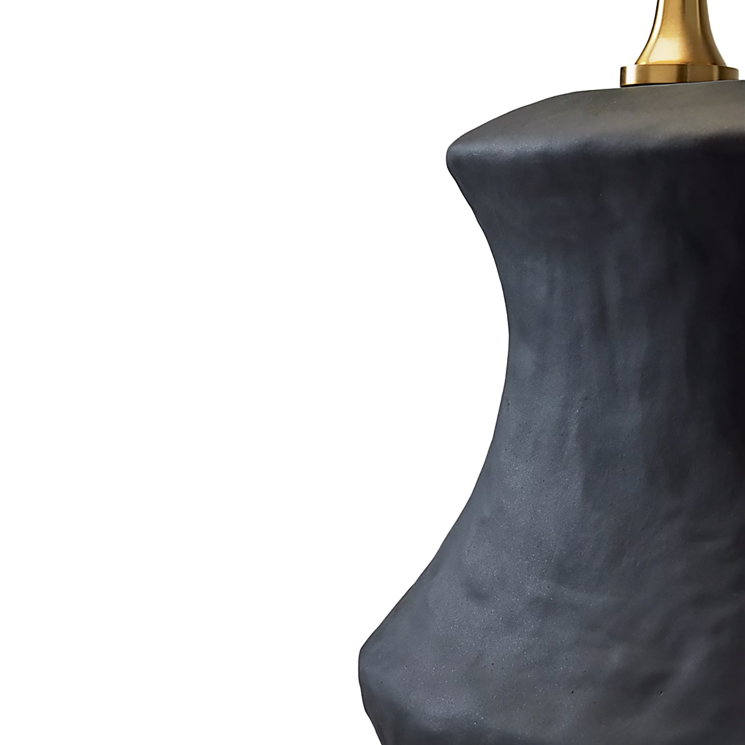 The Laken Table Lamp features handcrafted ceramic construction with a unique-shaped base and textured black finish that creates an iconic design with contemporary appeal. This striking 26" table lamp showcases delicately detailed artwork and sculptural form that will revitalize your decor space, perfect for living rooms, bedrooms, side tables, and areas seeking distinctive lighting with versatile style. The crisp white linen shade and brass hardware perfectly accent the beautifully crafted base, creating sophisticated contrast and timeless elegance. The understated design works seamlessly across design styles, from traditional to contemporary ensembles. With its convenient plug-in installation and on/off switch at the socket, this table lamp transforms any space with distinctive style and performance.