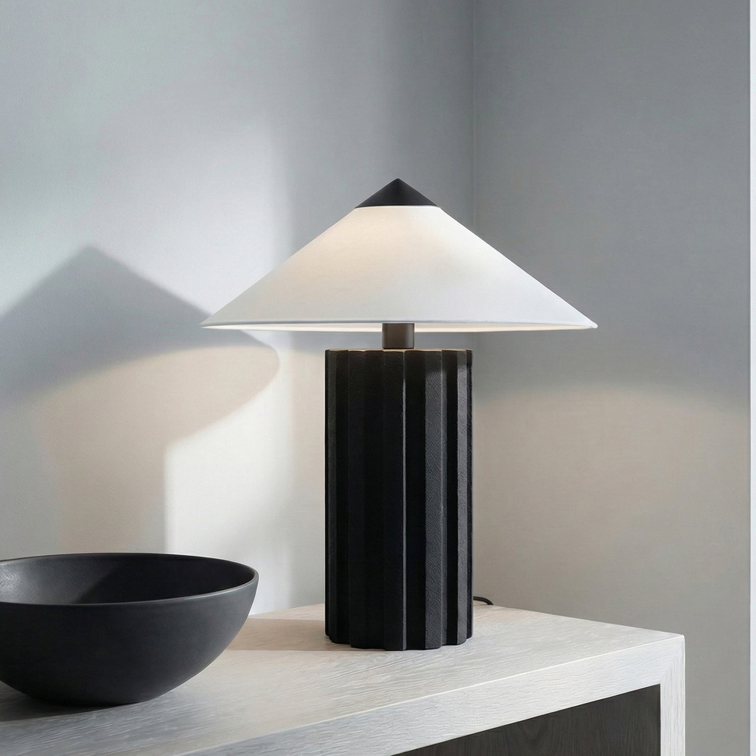 The Lee Table Lamp brings architectural sophistication to interior spaces with its striking geometric design. This distinctive lamp features a sculptural fluted base in rich textured black with a dramatic vertical ridged pattern that creates depth and visual interest. The crisp white cotton cone shade provides beautiful contrast while ensuring soft, even illumination. With its substantial presence and artistic silhouette, the Lee lamp makes a bold design statement whether illuminated or not. Perfect for living rooms, home offices, or bedside tables, this lamp combines contemporary sculptural elements with timeless proportions to create a versatile lighting solution that enhances a wide range of interior styles.