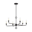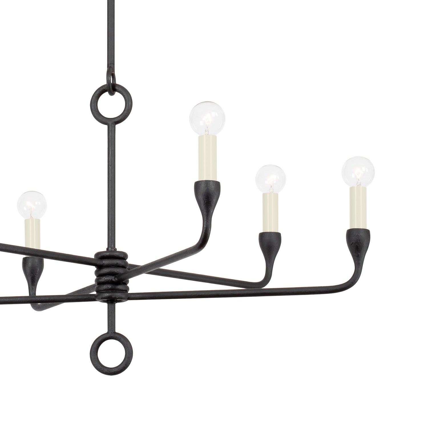 The Adalyn 6 Light Chandelier brings dramatic elegance to dining spaces with its striking linear silhouette and handcrafted details. Six graceful arms extend from a distinctive stacked coil center, each ending in a sleek candlestick holder that creates an elongated, sculptural form. The antique iron finish adds richness and luxury, while subtle loop accents enhance the fixture's sophisticated appeal. At 30.75" in diameter, this chandelier offers substantial presence without overwhelming the space, making it ideal for dining rooms, entryways, or living areas where refined style is desired. The candlestick design evokes classic elegance while maintaining a fresh, contemporary edge that complements both traditional and modern interiors.