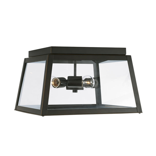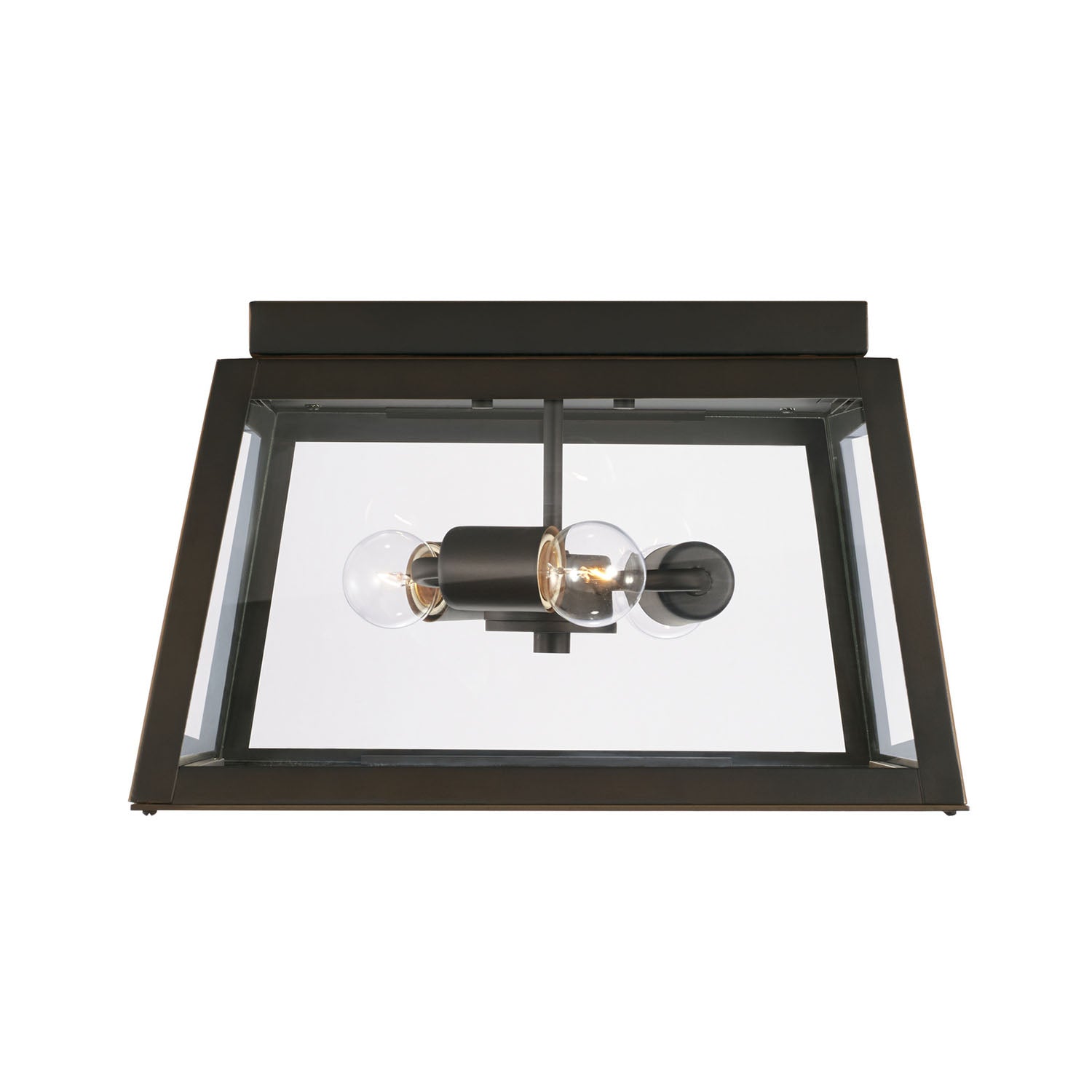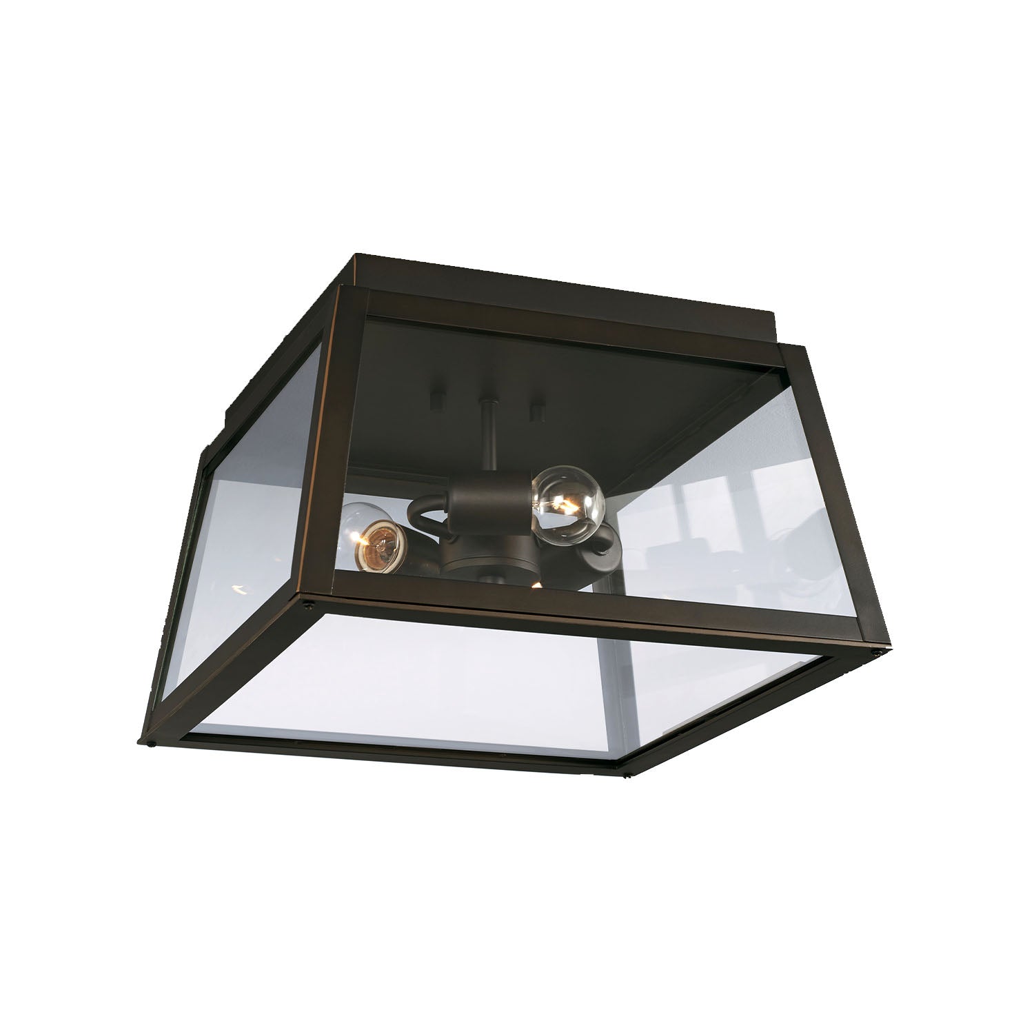 The striking geometric form of the Alden Outdoor Flush Mount elevates your exterior spaces with contemporary industrial sophistication. This sleek transitional fixture commands attention with its clean-lined tapered silhouette and clear glass panels framed in rich oiled bronze. Perfect for covered porches, patios, and low-clearance areas where traditional hanging lights won't fit, this versatile flush mount transforms any outdoor ceiling with modern elegance. The Alden Outdoor Flush Mount anchors a comprehensive collection designed to unify your exterior lighting scheme.