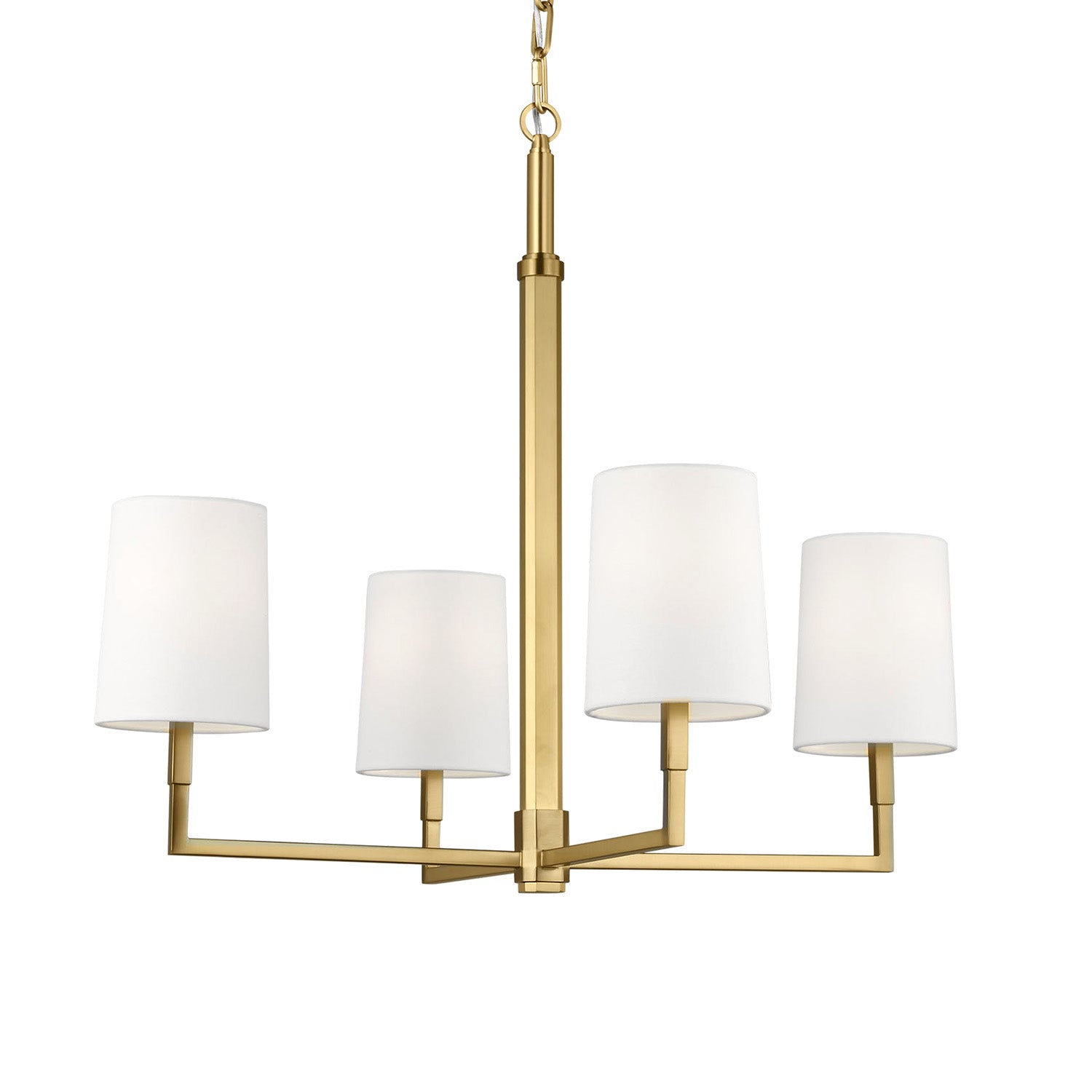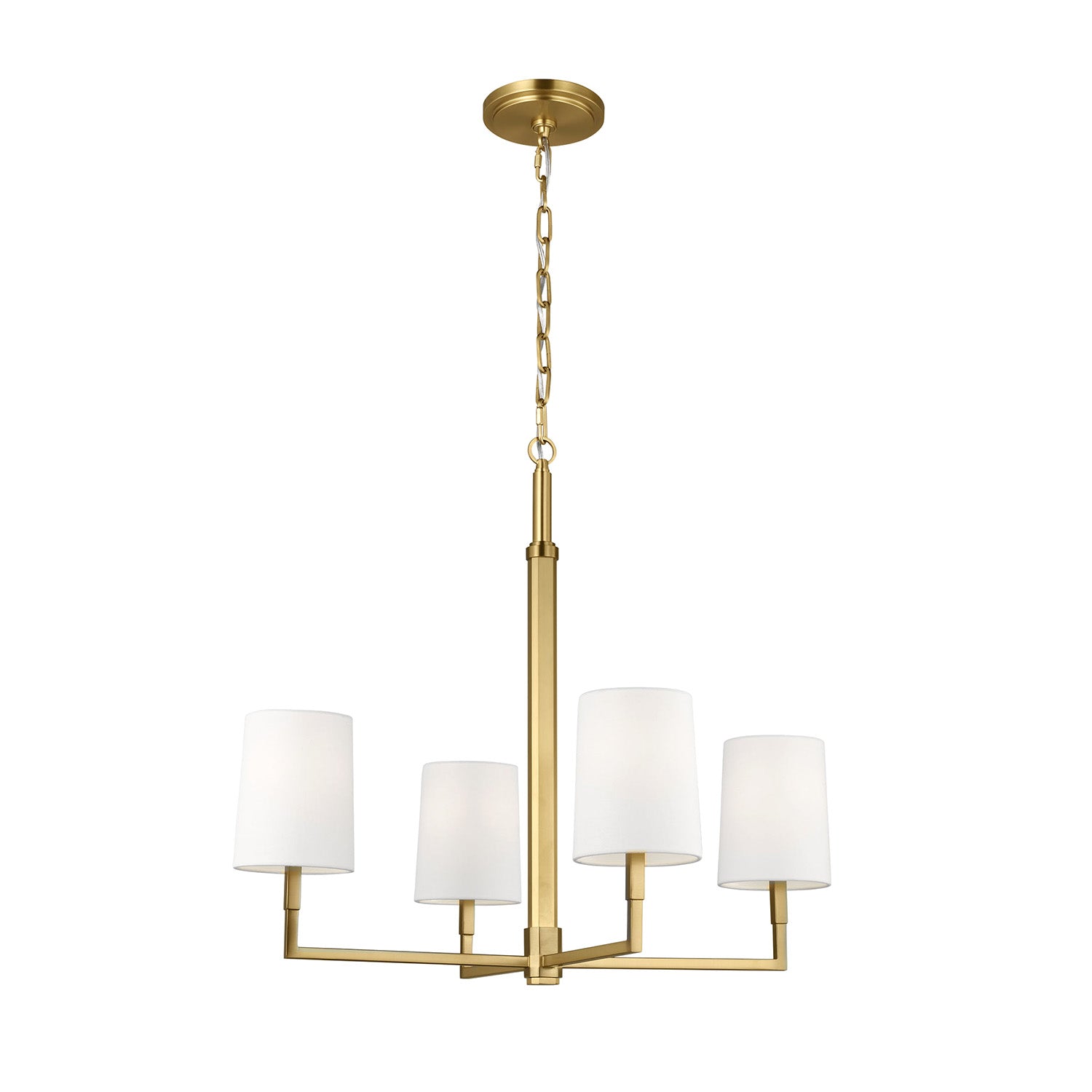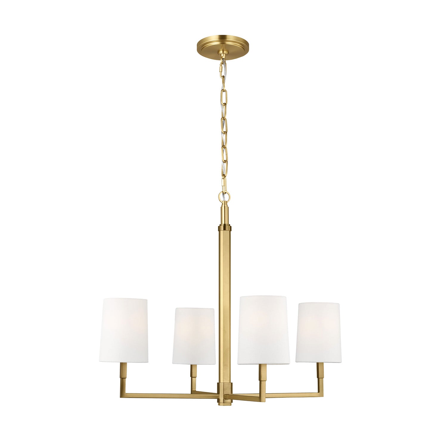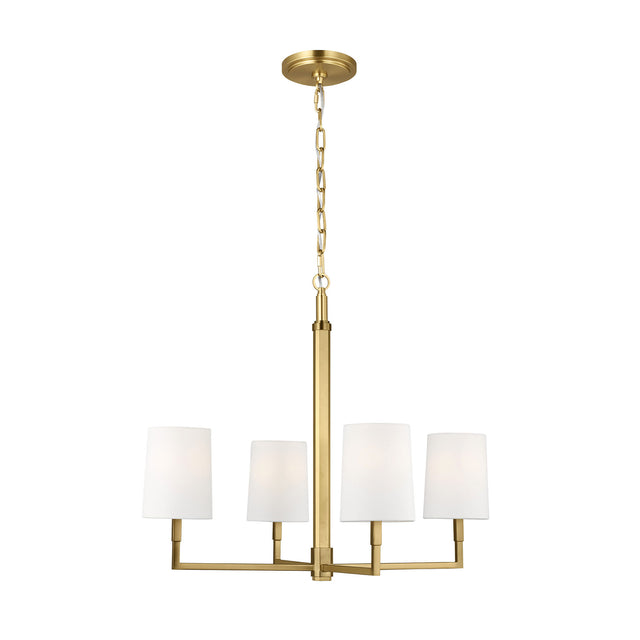 The Andrew 4 Light Chandelier seamlessly blends modern minimalism with vintage charm, showcasing clean, structured lines and simplicity that creates timeless aesthetic appeal throughout the space. This sophisticated 27" chandelier features thoughtfully balanced proportions with understated details that create a refined yet casual elegance, perfect for dining rooms, entryways, living spaces, and areas seeking statement lighting that feels at home in both contemporary and traditional interiors. The warm modern brass finish exudes sophisticated elegance while the white linen shades deliver soft, even illumination with understated refinement. With its damp-rated construction and substantial hanging range, this beautifully designed chandelier elevates any space with timeless sophistication and enduring style.