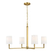 The Andrew 4 Light Chandelier seamlessly blends modern minimalism with vintage charm, showcasing clean, structured lines and simplicity that creates timeless aesthetic appeal throughout the space. This sophisticated 36" chandelier features thoughtfully balanced proportions with understated details that create a refined yet casual elegance, perfect for larger dining rooms, grand entryways, living spaces, and areas seeking substantial statement lighting that feels at home in both contemporary and traditional interiors. The warm modern brass finish exudes sophisticated elegance while the white linen shades deliver soft, even illumination with understated refinement. With its damp-rated construction and substantial hanging range, this beautifully designed chandelier elevates any space with timeless sophistication and enduring style.