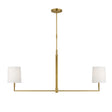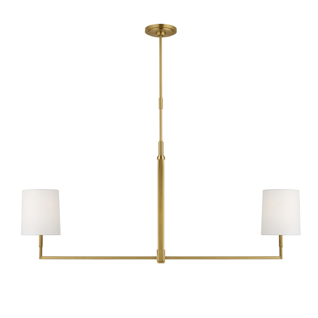 The Andrew Linear Pendant seamlessly blends modern minimalism with vintage charm, showcasing clean, structured lines and simplicity that creates timeless aesthetic appeal throughout the space. This sophisticated 50" linear pendant features thoughtfully balanced proportions with understated details that create a refined yet casual elegance, perfect for kitchen islands, dining tables, breakfast bars, and areas seeking substantial linear lighting that feels at home in both contemporary and traditional interiors. The warm modern brass finish exudes sophisticated elegance while the two white linen shades deliver soft, even illumination with understated refinement. With its damp-rated construction and substantial hanging range, this beautifully designed linear pendant elevates any space with timeless sophistication and enduring style.