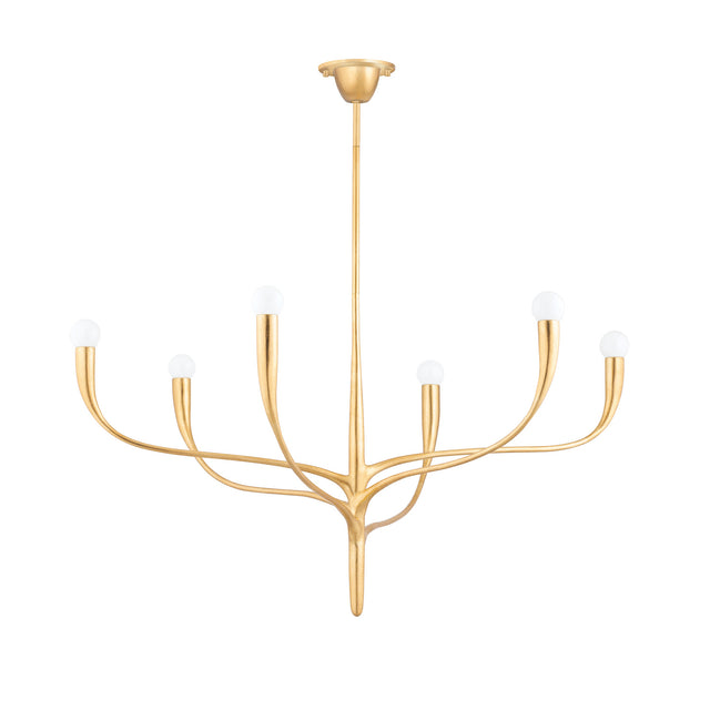 The Anita 6 Light Chandelier brings sculptural elegance to interior spaces with its graceful, refined silhouette. This statement fixture features six gently curved arms that extend outward from a slender central stem, creating a contemporary interpretation of a classic chandelier form. Each arm culminates in a minimalist socket housing a globe-shaped bulb, providing balanced illumination without visual clutter. The luxurious gold leaf finish offers opulent sophistication while enhancing the chandelier's architectural presence. With its impressive 38-inch diameter, this fixture makes a dramatic statement above dining tables, in entryways, or anchoring living spaces, striking the perfect balance between modern simplicity and artistic expression.