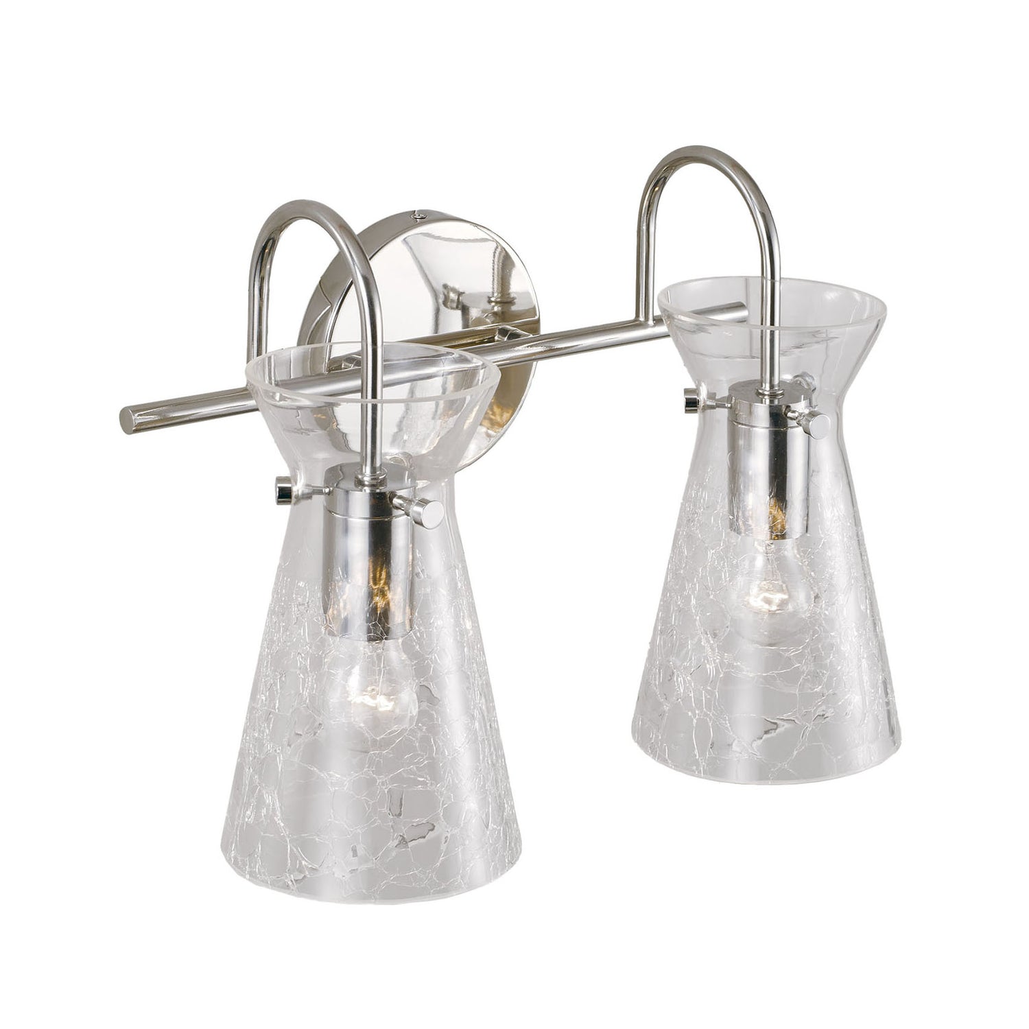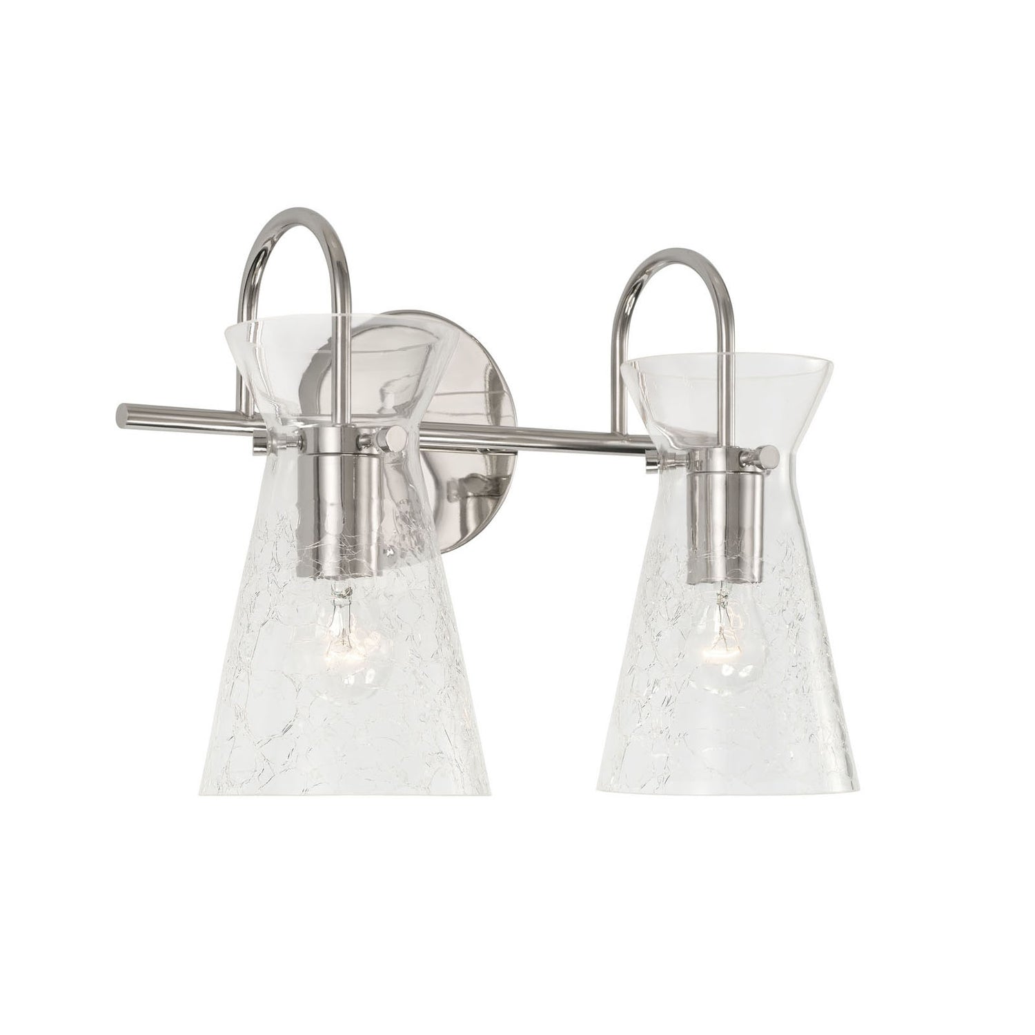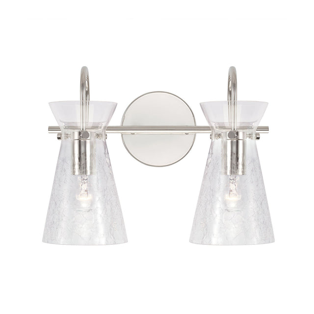The Aries 2 Light Vanity brings distinctive sophistication to bathrooms and vanity areas with its unique glass design. Featuring two clear glass shades with unique half-crackle texture on the bottom portion, this 14.25" fixture delivers both focused task lighting and decorative appeal. The polished nickel finish adds a sleek, sophisticated touch that complements both modern and traditional interiors. The Aries vanity light combines textural design with functional illumination to create a distinctive lighting solution that enhances your space with refined elegance.