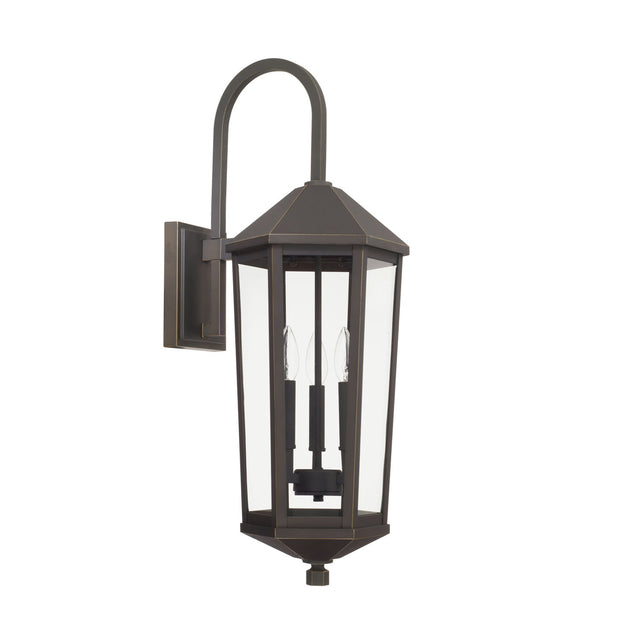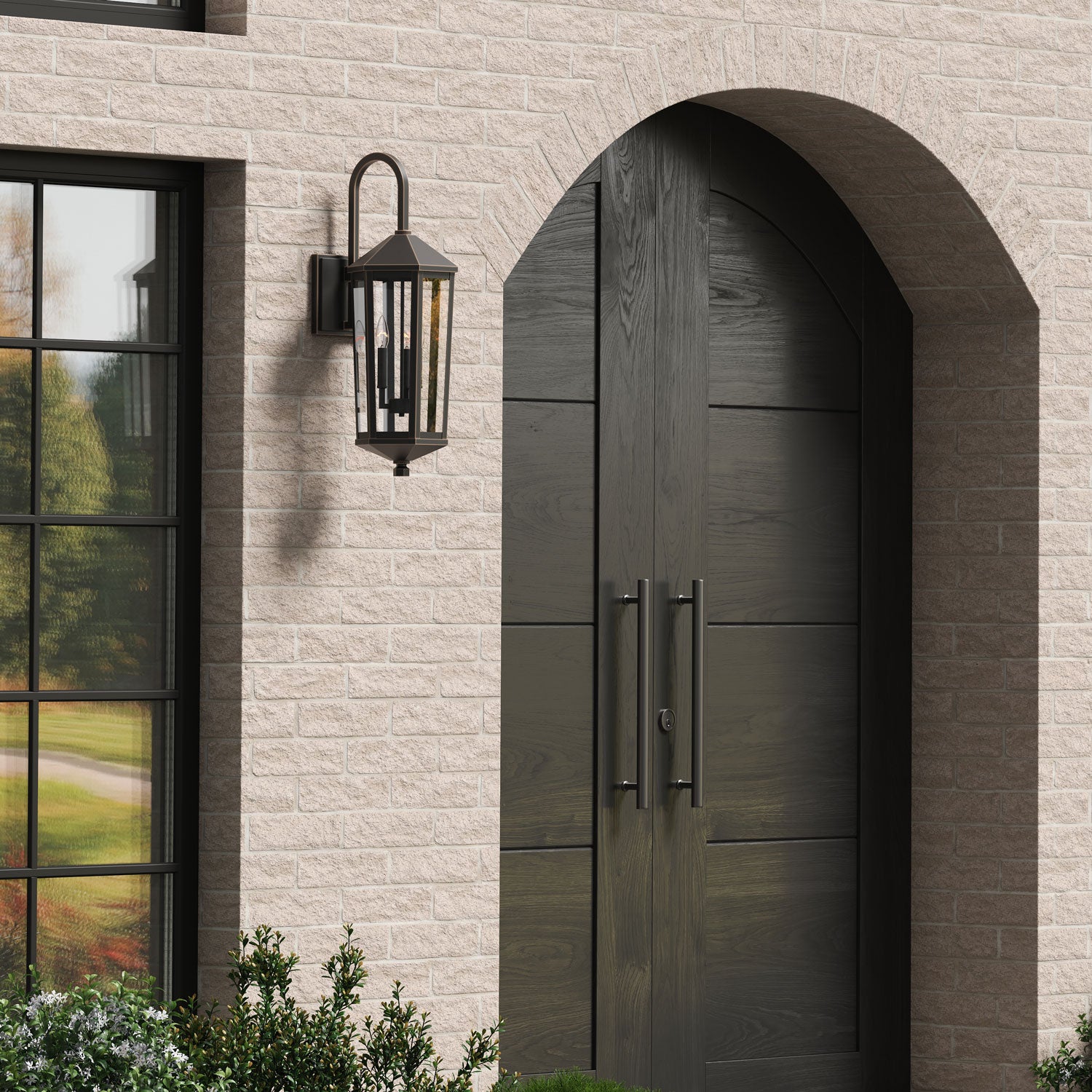 The Asbury Outdoor Medium 29" Wall Light brings timeless lantern charm to your exterior spaces with its distinctive hexagonal silhouette. This classic lantern design features a striking angular frame that combines clean geometric lines with traditional proportions. The gracefully curved mounting arm extends elegantly from the wall, giving the fixture an authentic lantern presence while providing optimal light distribution. The rich oiled bronze finish beautifully contrasts with expansive clear glass panels that showcase three E12 candelabra bulbs, while the slanted dome top adds architectural interest and weather protection. This substantial 29" outdoor wall light is engineered to withstand the elements, featuring a UL wet-rated certification and a durable powder-coated finish.