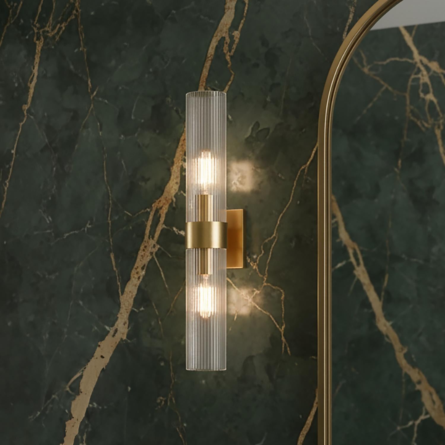 The Barclay 2 Light Wall Sconce makes a sophisticated statement with its elegant, linear design. Two clear fluted glass shades form an elegant look that is beautifully balanced by a strong, central frame. The fixture is thoughtfully designed to cast a unique, diffused glow, providing ample illumination for a bathroom vanity, hallway, or living space. With its ETL damp rating, it adds both functional beauty and versatile appeal to any interior. The beautiful Modern Brass finish brings a warm metallic richness that enhances the fixture's elegant silhouette. This striking sconce is a perfect blend of style and functionality, adding a touch of refined elegance to your interior.