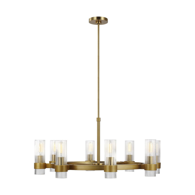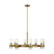 The Barclay Medium Chandelier makes a sophisticated statement with its elegant design. Its clean, circular form features eight clear fluted glass shades beautifully arranged around a central ring, creating a refined look that provides a beautiful, multi-directional glow. The fixture is thoughtfully designed to provide ample illumination for a dining room, living space, or entryway. With its ETL damp rating and sloped ceiling compatibility, it adds both functional beauty and versatile appeal to any interior. The beautiful Modern Brass finish brings a warm metallic richness that enhances the fixture's elegant silhouette. This striking chandelier is a perfect blend of style and functionality, adding a touch of refined elegance to your interior.