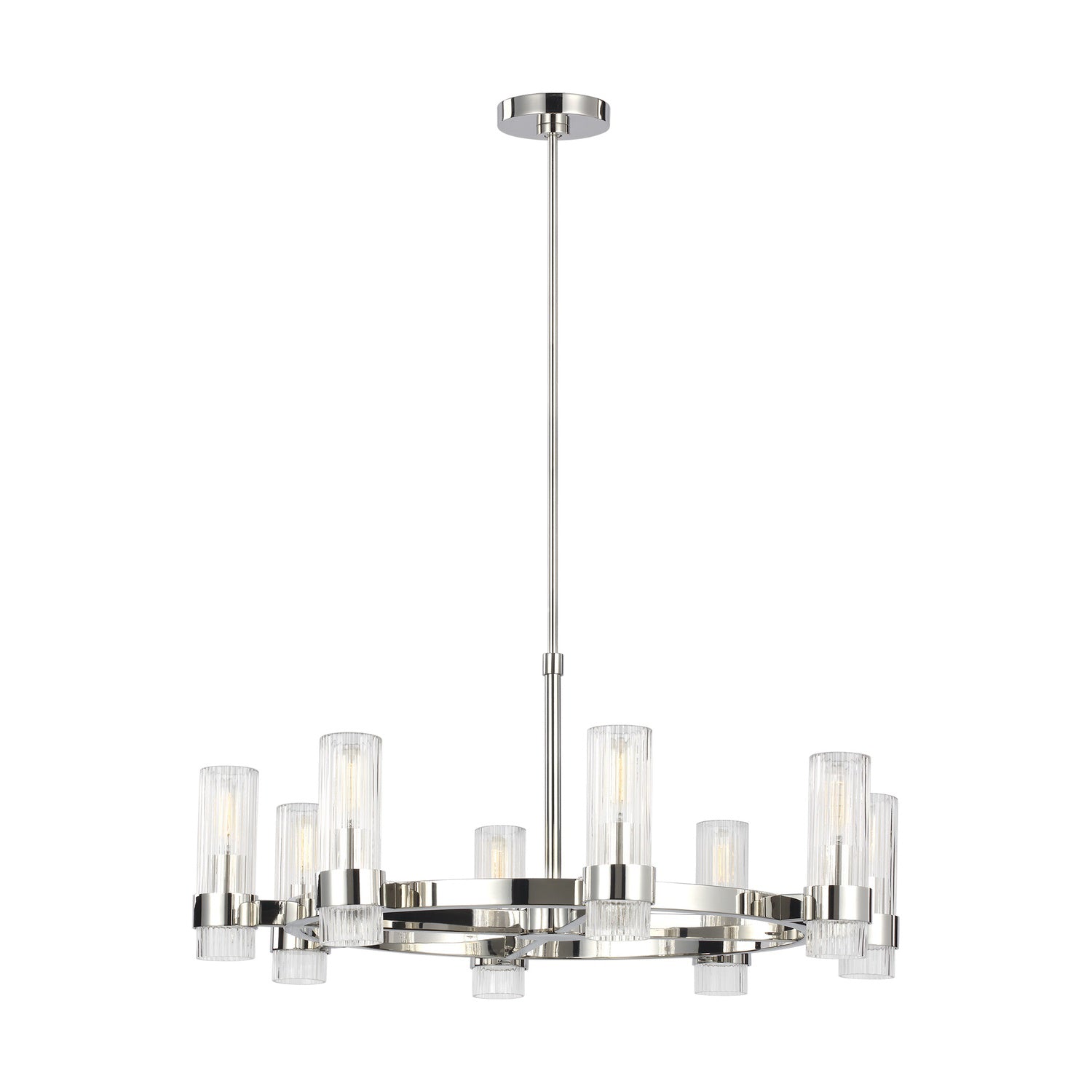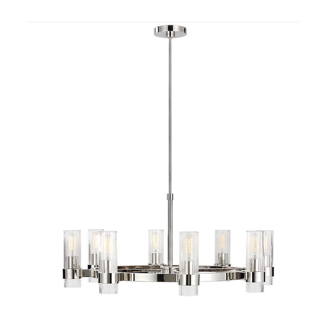 The Barclay Medium Chandelier makes a sophisticated statement with its elegant design. Its clean, circular form features eight clear fluted glass shades beautifully arranged around a central ring, creating a refined look that provides a beautiful, multi-directional glow. The fixture is thoughtfully designed to provide ample illumination for a dining room, living space, or entryway. With its ETL damp rating and sloped ceiling compatibility, it adds both functional beauty and versatile appeal to any interior. The brilliant Polished Nickel finish offers a sleek, reflective sheen that beautifully complements the fixture's elegant silhouette. This striking chandelier is a perfect blend of style and functionality, adding a touch of refined elegance to your interior.
