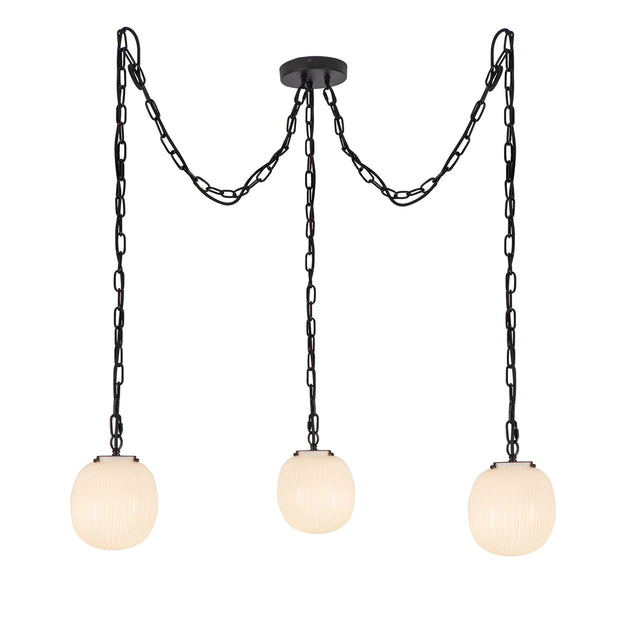 • Basile 3 Light Swag Chandelier features three ribbed milk glass shades suspended from matte black chains for a soft, layered look