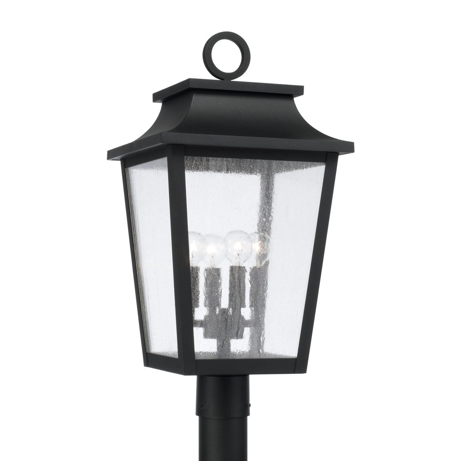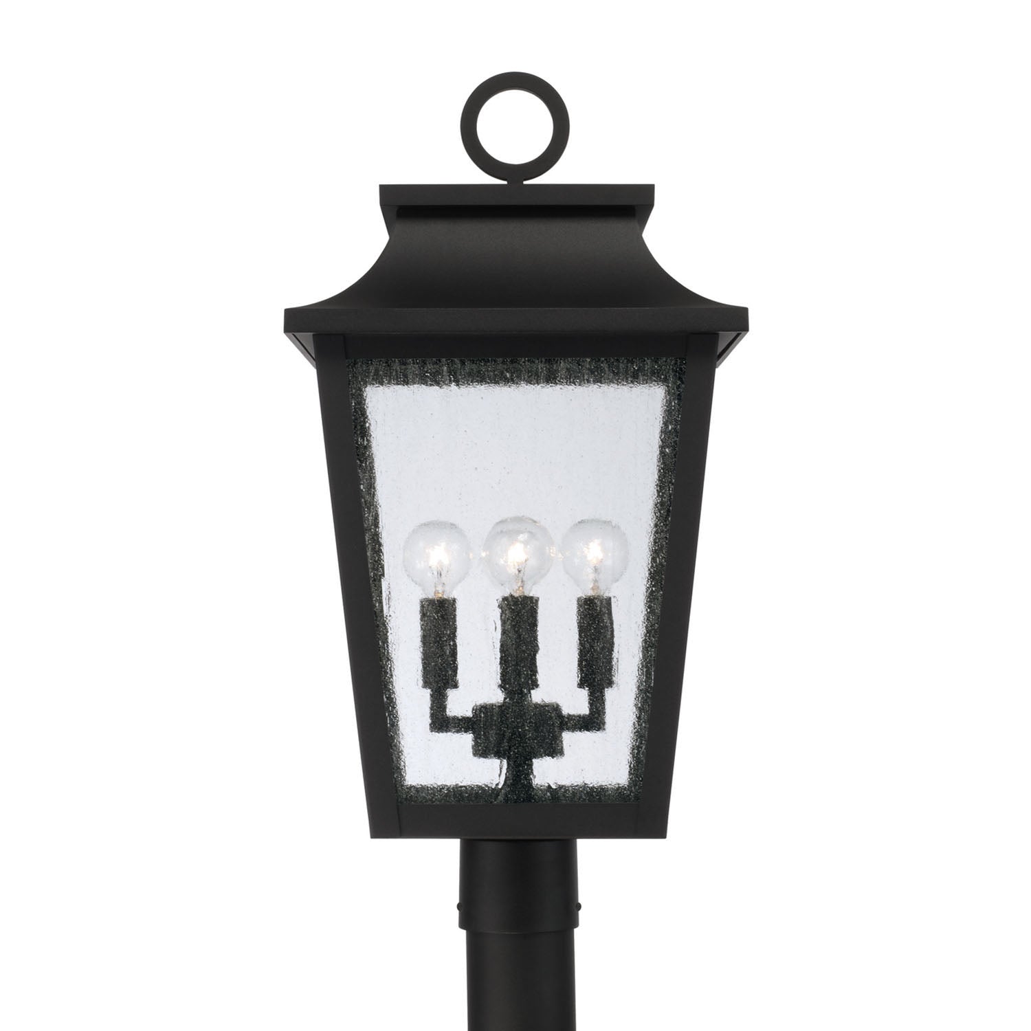 The timeless elegance of the Beckett Outdoor Post Light brings classic charm to your exterior spaces with its traditional coach-style lantern design and stately post-mounted profile. This elegant fixture features a tapered silhouette with clean geometric lines, creating an inviting beacon for pathways, driveways, and garden areas that evokes the warmth of traditional colonial lighting. The rich matte black finish beautifully contrasts with the clear seeded glass panels that add texture and visual interest while softly diffusing the light. The decorative ring handle adds an authentic touch of old-world craftsmanship. Perfect for illuminating outdoor walkways and creating a welcoming atmosphere throughout your landscape, this versatile post light combines heritage appeal with reliable performance.