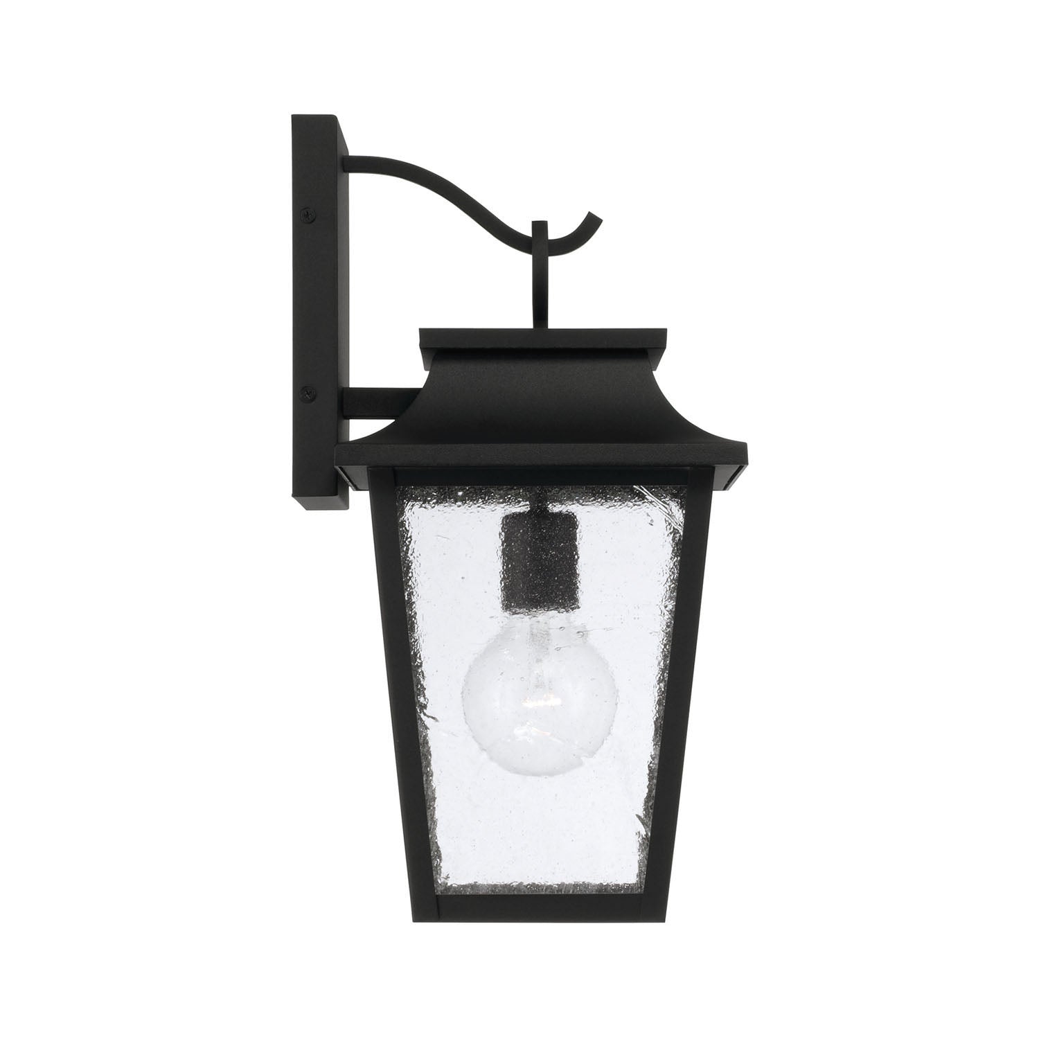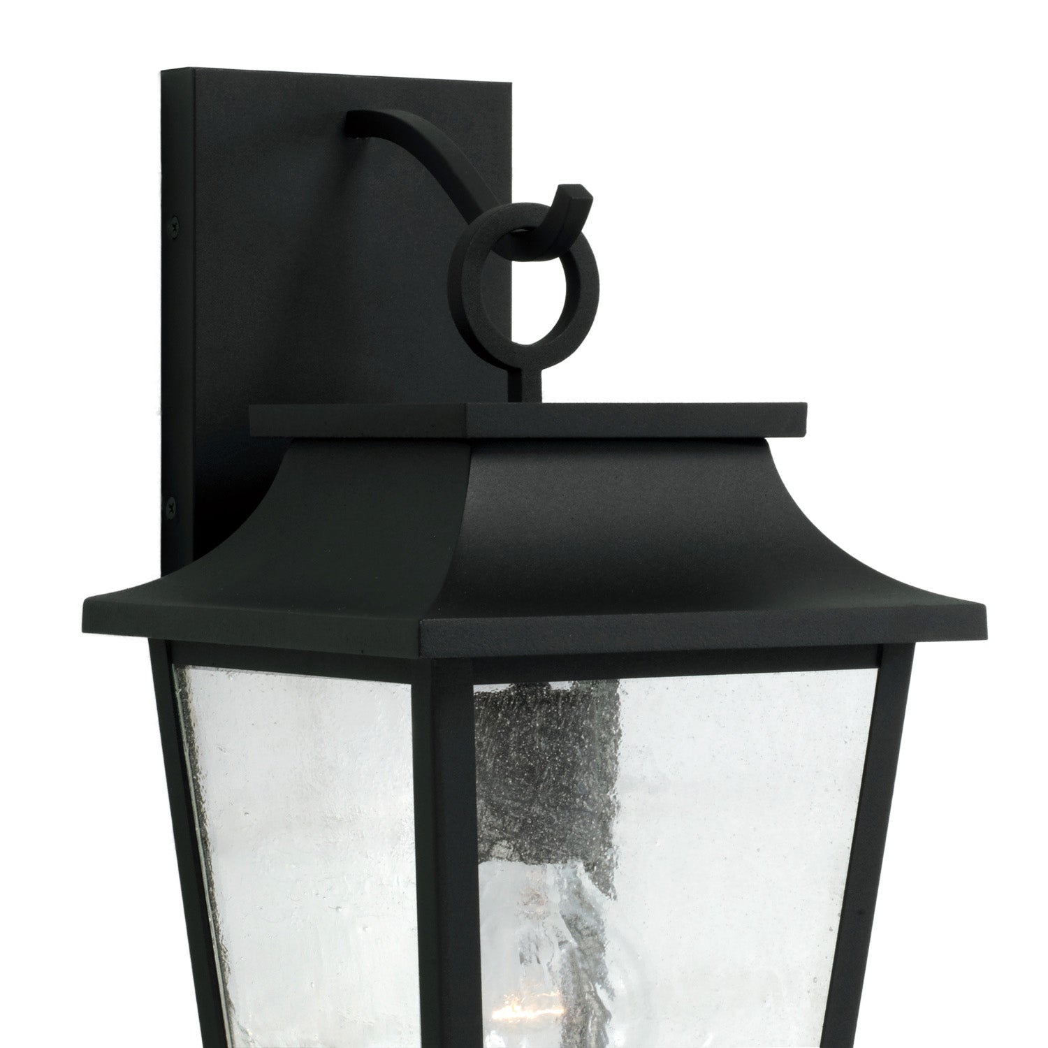 The timeless elegance of the Beckett Small Outdoor Wall Light brings classic charm to your home's exterior with its traditional coach-style lantern design and distinctive hook-style mounting arm. This elegant fixture features a tapered silhouette with clean geometric lines, creating a welcoming beacon that evokes the warmth of traditional colonial lighting. The rich matte black finish beautifully contrasts with the clear seeded glass panels that add texture and visual interest while softly diffusing the light. The signature hook arm with its decorative loop adds an authentic touch of old-world craftsmanship. Perfect for flanking entryways, illuminating pathways, or enhancing covered porches, this versatile wall light combines heritage appeal with reliable performance.