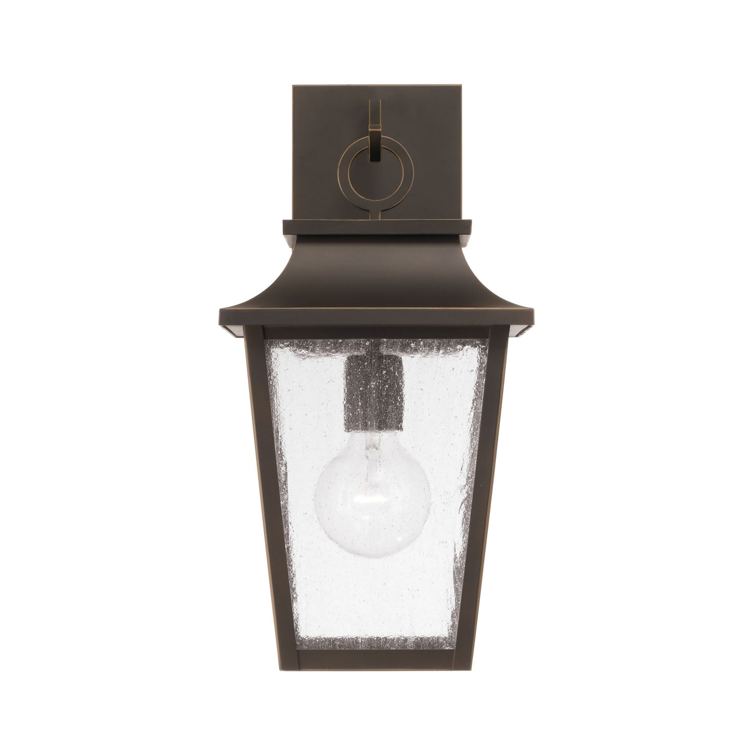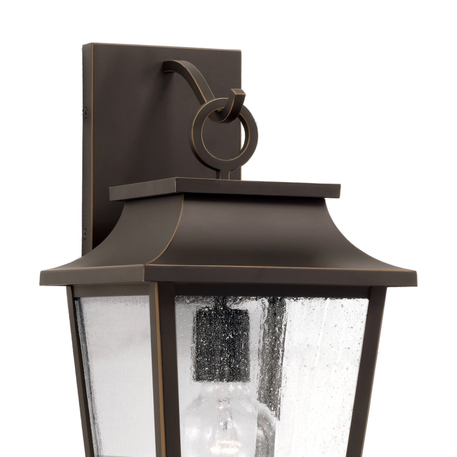 The timeless elegance of the Beckett Small Outdoor Wall Light brings classic charm to your home's exterior with its traditional coach-style lantern design and distinctive hook-style mounting arm. This elegant fixture features a tapered silhouette with clean geometric lines, creating a welcoming beacon that evokes the warmth of traditional colonial lighting. The rich oiled bronze finish beautifully contrasts with the clear seeded glass panels that add texture and visual interest while softly diffusing the light. The signature hook arm with its decorative loop adds an authentic touch of old-world craftsmanship. Perfect for flanking entryways, illuminating pathways, or enhancing covered porches, this versatile wall light combines heritage appeal with reliable performance.