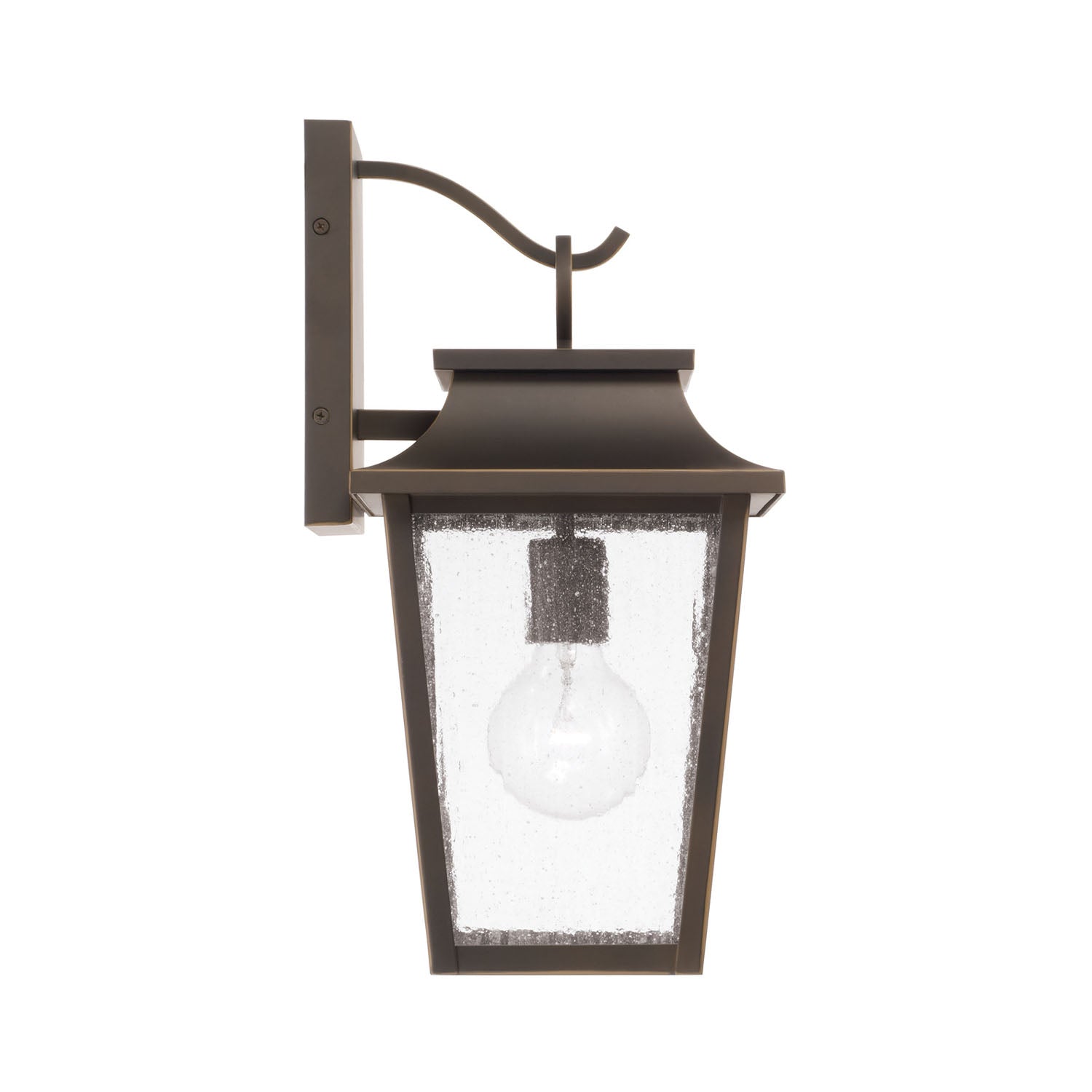 • Features a classic oiled bronze metal frame with clear seeded glass side panels and distinctive hook-style mounting arm