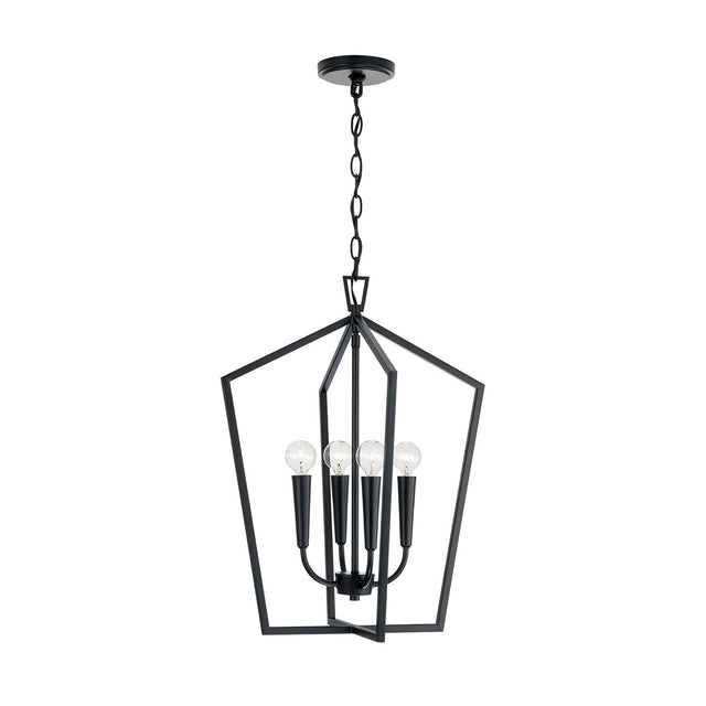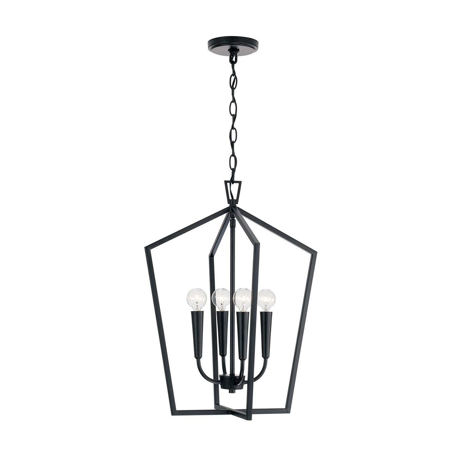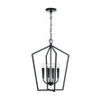 • Refined traditional design with matte black finish featuring an open geometric frame and four candelabra bulbs