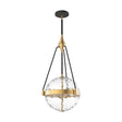 The Darcy Medium Pendant features a striking design with a textured water glass sphere suspended within a geometric framework. The clear glass globe is accented by a Brushed Brass equatorial band and supported by three slender Matte Black rods that create an elegant silhouette. This mixed-metal ceiling light combines contemporary styling with timeless materials, creating a focal point that's both sophisticated and eye-catching. Measuring 14" in diameter, the Darcy provides beautiful ambient lighting that's perfect for dining areas, entryways, or kitchen islands. The textured water glass diffuses light while creating stunning patterns when illuminated.