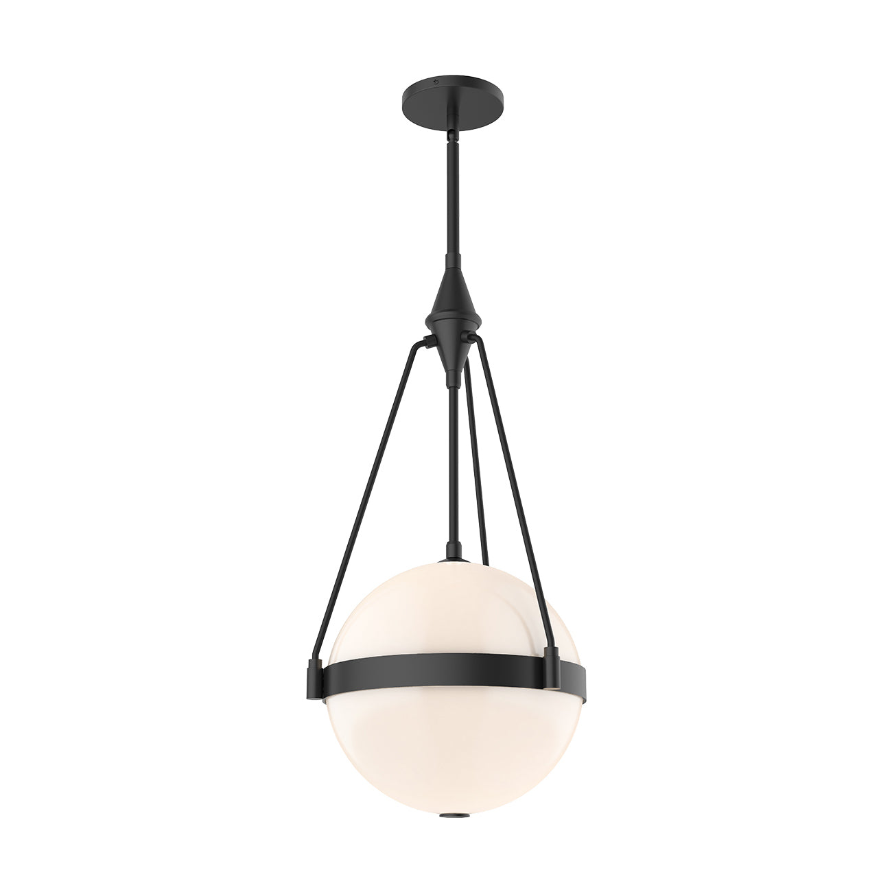 The Darcy Medium Pendant features a striking design with a smooth milk glass sphere suspended within a geometric framework. The milk glass globe is accented by a Matte Black equatorial band and supported by three slender rods that create an elegant silhouette. This sleek and eye-catching ceiling light combines contemporary styling with timeless materials, creating a focal point that's both sophisticated and eye-catching. Measuring 14" in diameter, the Darcy provides soft, diffused illumination that's perfect for dining areas, entryways, or kitchen islands. The milk glass creates a warm, even glow that enhances the ambiance of any space.